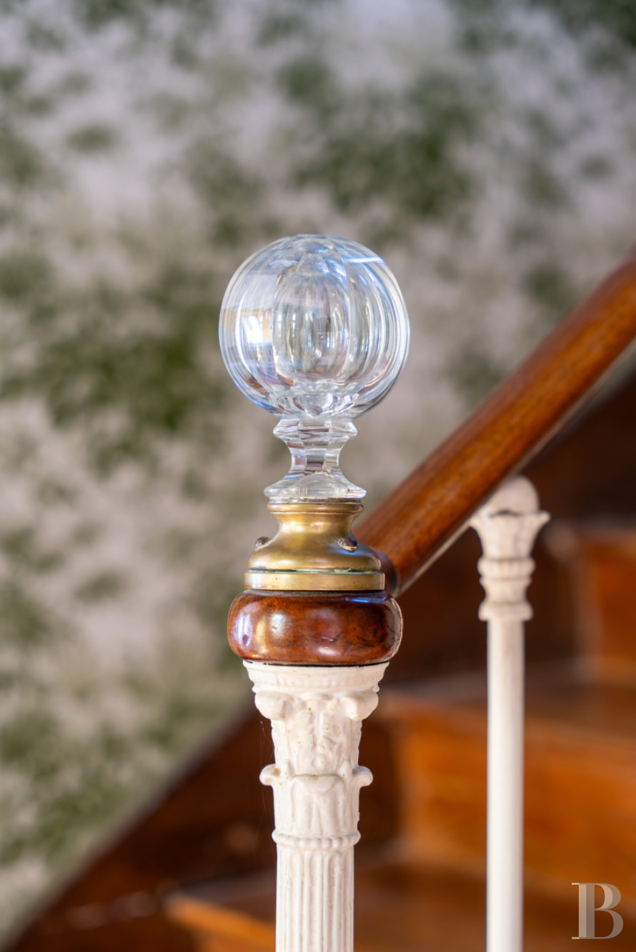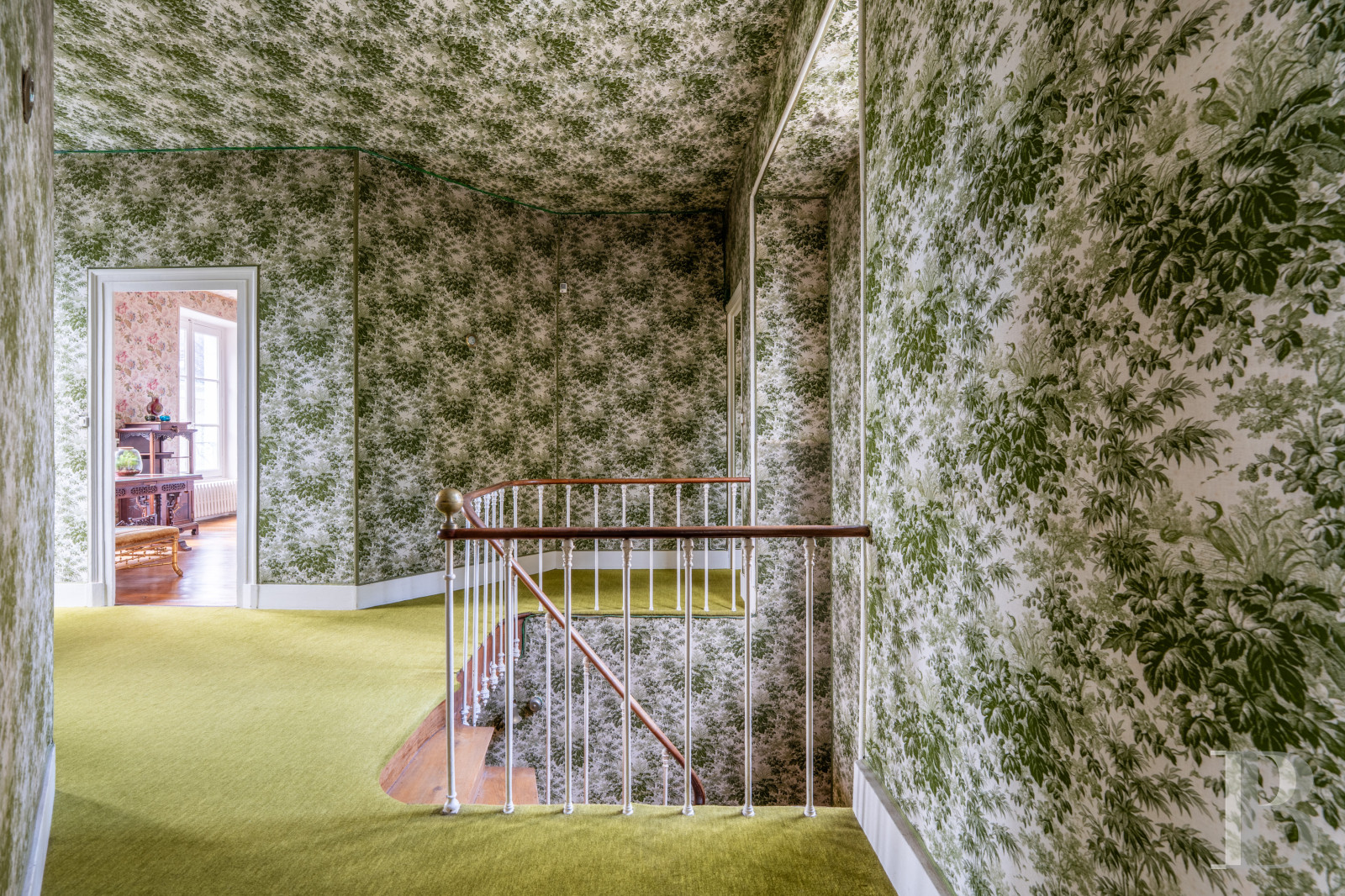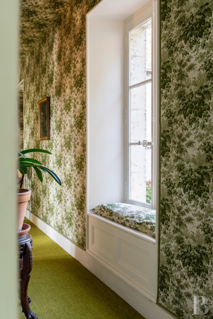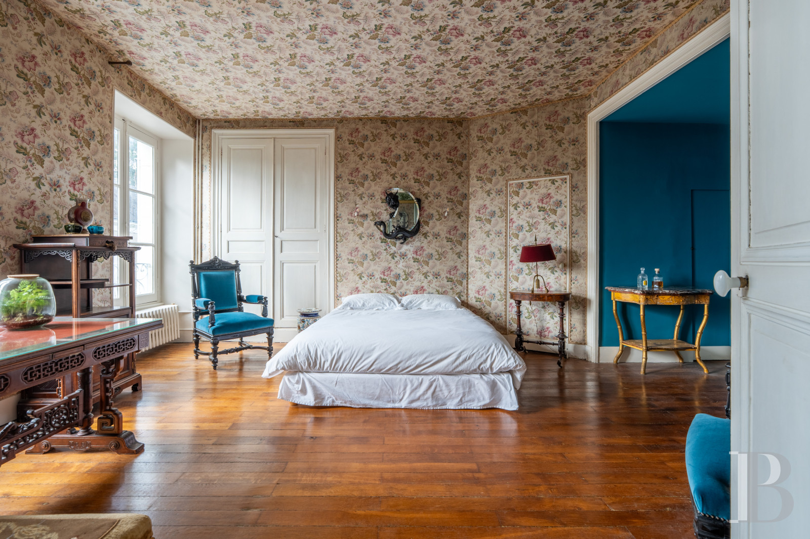Un palier tendu du même tissu de verdure que le vestibule est prolongé par un couloir vers les chambres. L’une d’elles est habillée aux murs d'un tissu fleuri. Les toilettes à côté peuvent être facilement aménagées en salle de bains privative. À l'extrémité de l’aile ouest, une chambre récemment rénovée jouxte une salle de bains neuve. Une porte ouvre directement sur le jardin haut. Dans l’aile est, une chambre d'amis est doublée d'une salle d’eau et ouvre elle aussi sur le jardin haut. Une autre salle d'eau, récente, est commune aux autres chambres, qui sont chacune équipées d'un lavabo dans un placard. Une chambre - située entre deux autres - pourrait facilement être transformée en deux salles de bains privatives. De cet étage, la vue porte sur la campagne environnante.