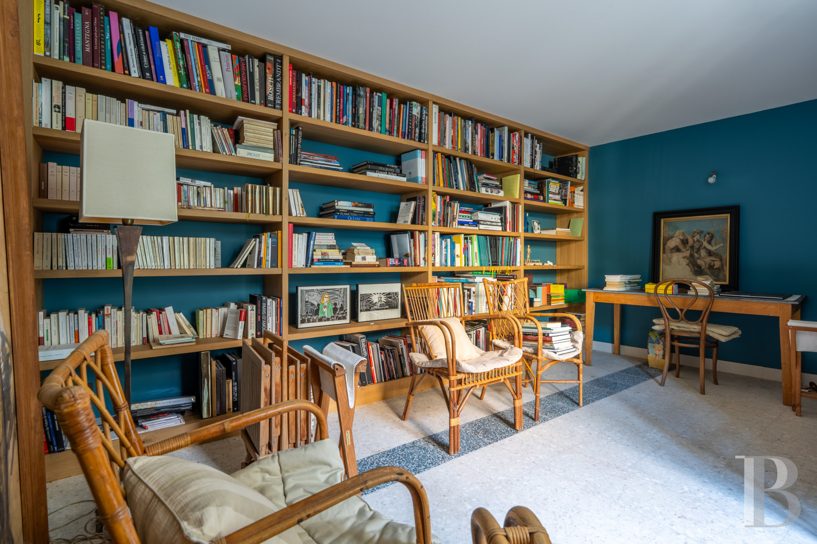 En face, dans l'autre aile, uniquement accessibles par la cour, un salon de lecture a été aménagé avec un sol en terrazzo et des meubles de bibliothèque réalisés sur mesure en chêne massif. La pièce communique directement avec un bureau dont une baie donne sur la ruelle. Un lavabo y a été aménagé dans un placard. À l’extrémité de cette aile, une ancienne écurie sert de remise et ouvre sur la cour par une belle porte avec imposte ancienne.