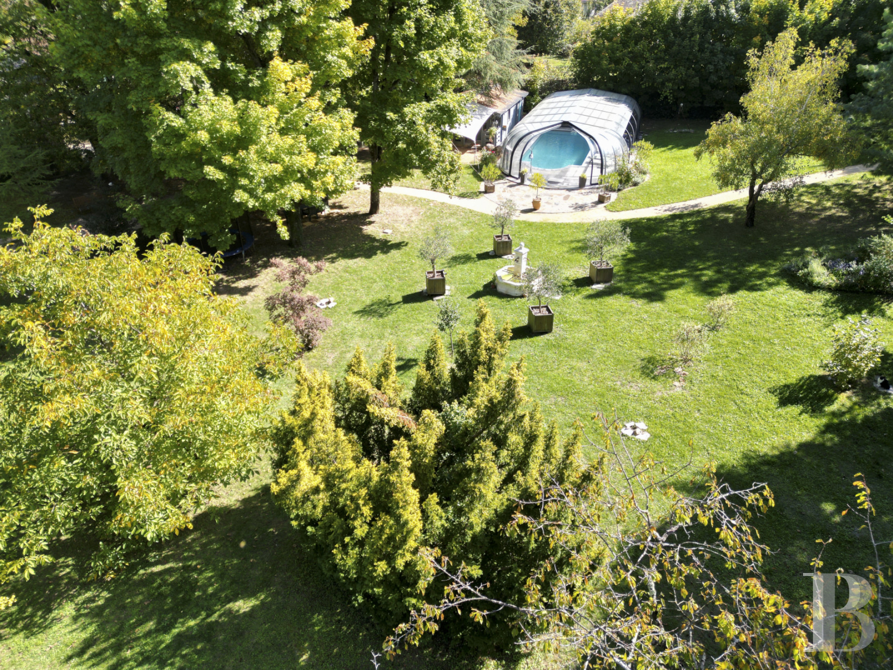 Entièrement clos et préservé des regards, il développe un univers végétal riche. De nombreuses essences y prospèrent : cèdres de l’Atlas, érables, tilleuls, saules japonais, Ginkgo Biloba, saules pleureurs, noyers, buis, arbres de Judée, magnolia, mirabellier, cerisier, poirier et autre figuier. Certains arbres ont été classés remarquables. Trois puits assurent l’arrosage des nouvelles plantations, complétés par un système d’arrosage automatique. Au centre du domaine, une fontaine et quatre oliviers ponctuent la composition paysagère d’une touche méridionale.