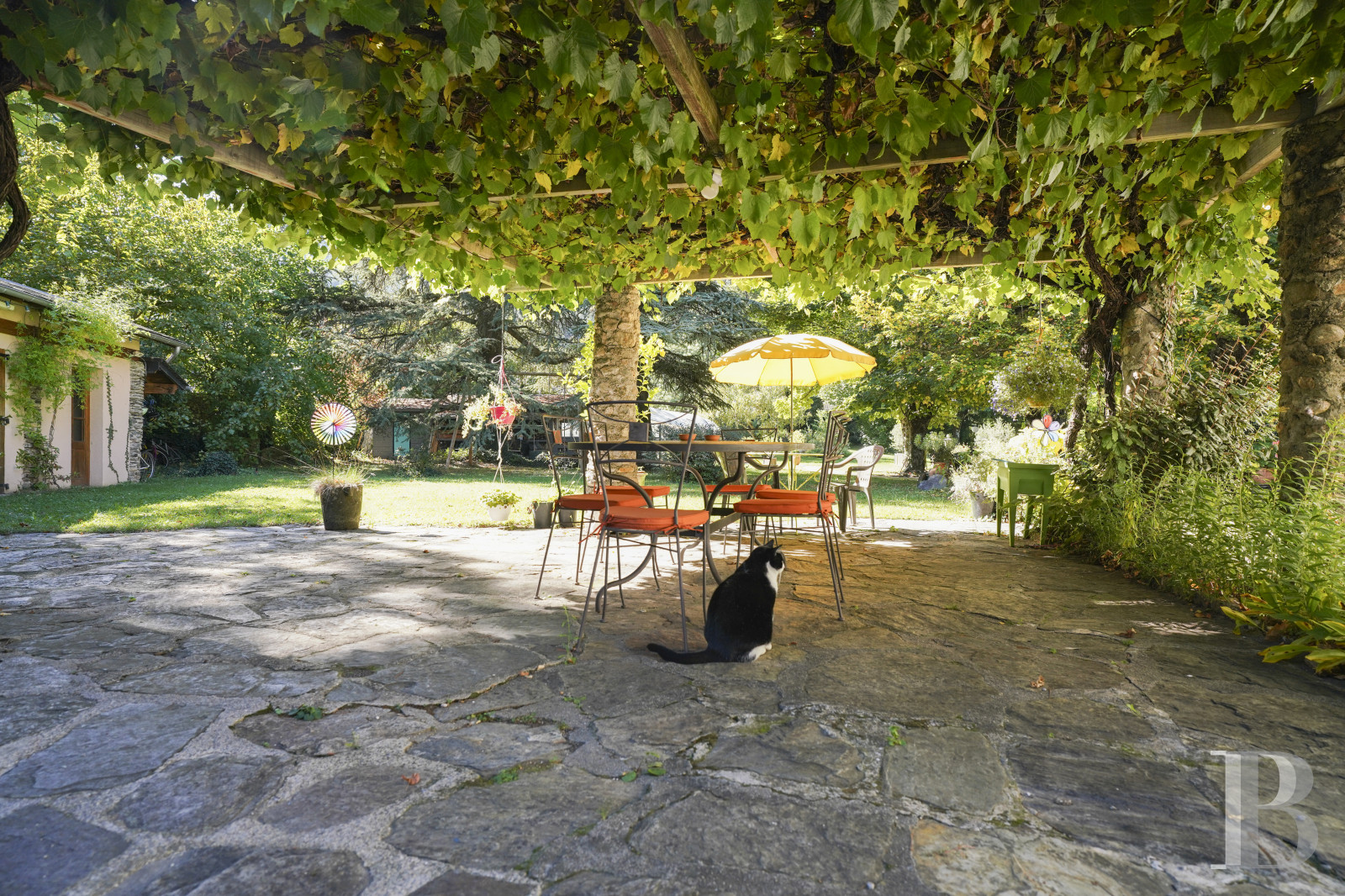 Près du portail, l’entrée conduit à une enfilade de pièces pavées de leurs pierres d’origine, où se succèdent une salle à manger et un salon avec cheminées. Le salon, tourné vers l’arrière de la maison, ouvre sur le jardin et un tilleul majestueux. Dans le prolongement, une cuisine, aux façades en bois, a été entièrement équipée. Elle dispose d’un accès direct à la terrasse pour faciliter les repas pris sous la treille. Un cellier-buanderie compte des toilettes.