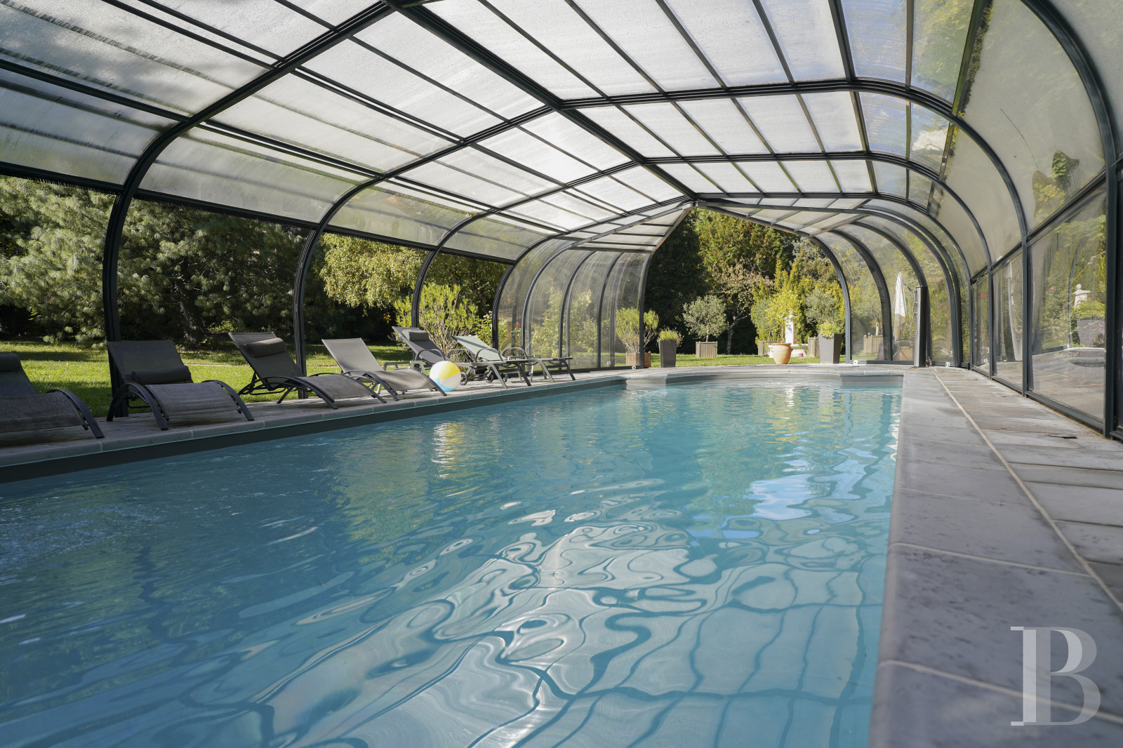 Sous l’ombre généreuse d’un cèdre, un chalet en bois constitue un espace supplémentaire d’environ 20 m². Dispersés dans le parc, plusieurs dépendances — cabane de jardin, remise et cave à vin — servent d’espaces de rangement pratiques et discrets. La piscine de 4 x 10,5 m se trouve sous un abri de 8 x 15 m. D’une profondeur maximale de 1,70 m, elle est chauffée par pompe à chaleur et jouxte une douche solaire. À proximité de l’ancienne magnanerie, un terrain de boules conforme aux dimensions officielles rappelle la convivialité des après-midis d’été.