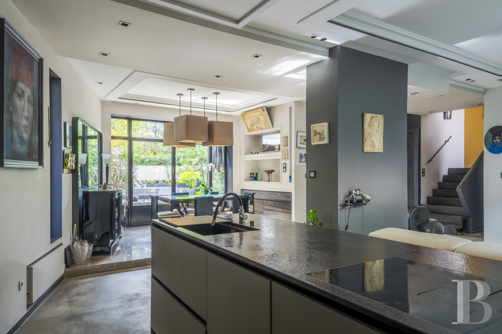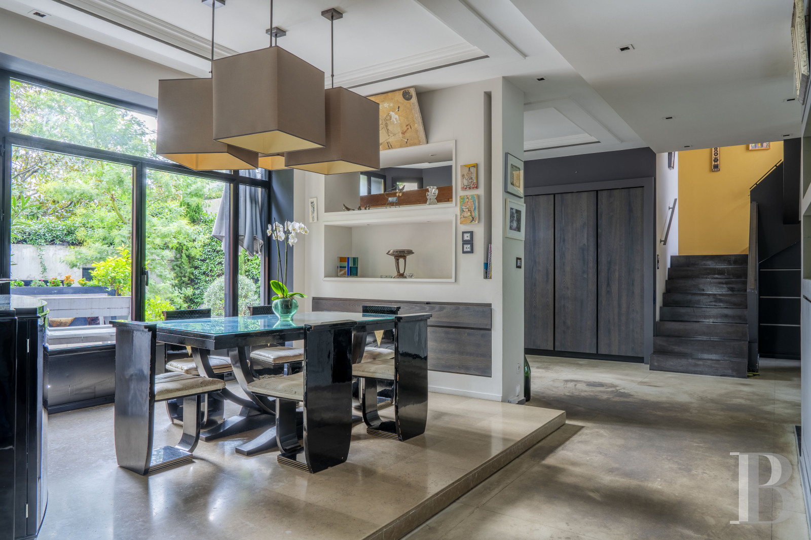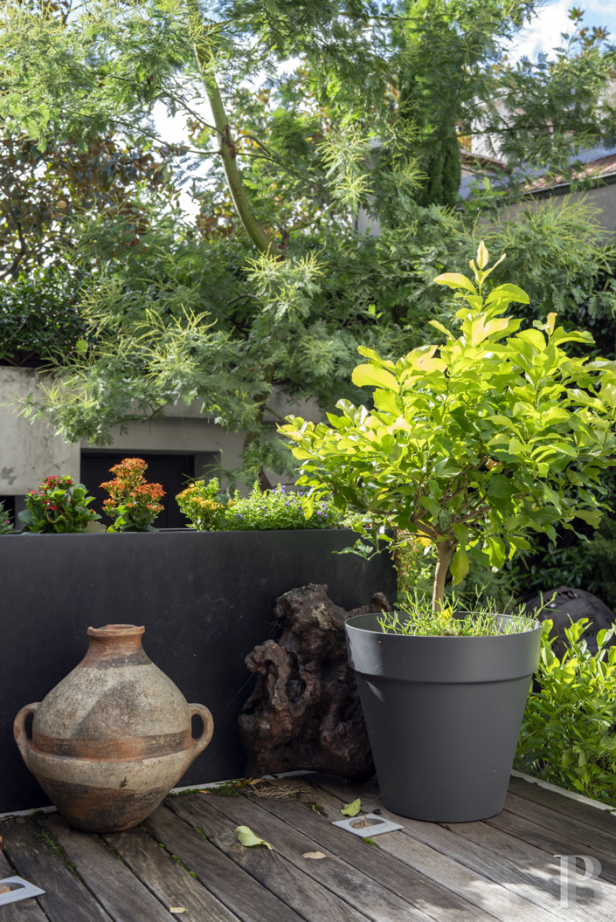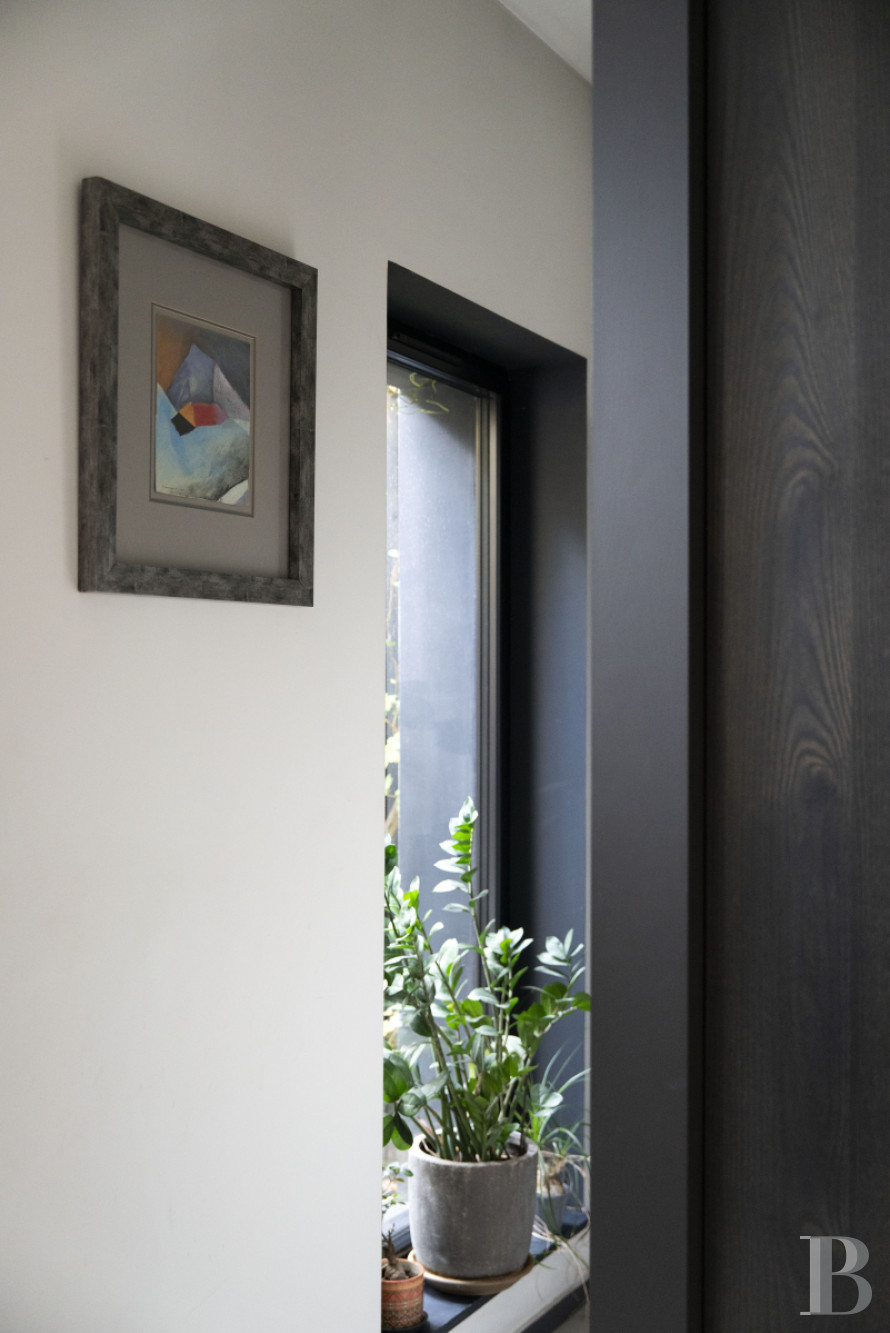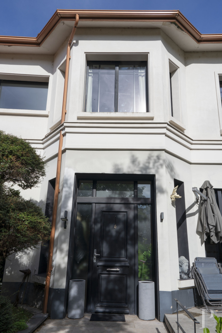Le vaste vestibule dessert des sanitaires, l'escalier menant aux différents niveaux ainsi que le grand espace de vie décloisonné. Des baies vitrées scandent les volumes et créent un dialogue permanent avec l'extérieur végétalisé. La cuisine équipée, moderne, est dotée d'un discret espace buanderie. La vaste salle de séjour communique avec une terrasse longiligne. Ses ouvertures offrent des perspectives sur le jardin luxuriant, créant une continuité visuelle entre intérieur et extérieur. L'étage comprend deux chambres à coucher, agrémentées de rangements intégrés, ainsi qu'une pièce actuellement à usage de bureau, associée à une terrasse privative. Une salle de bain équipée d'une baignoire et d'une douche, et des toilettes séparées, complètent le niveau. Le sous-sol est composé d'espaces fonctionnels : un garage double avec porte motorisée, dont l'accès privatif évite tout désagrément de stationnement extérieur, une cave et une pièce aménagée en salle de sport.