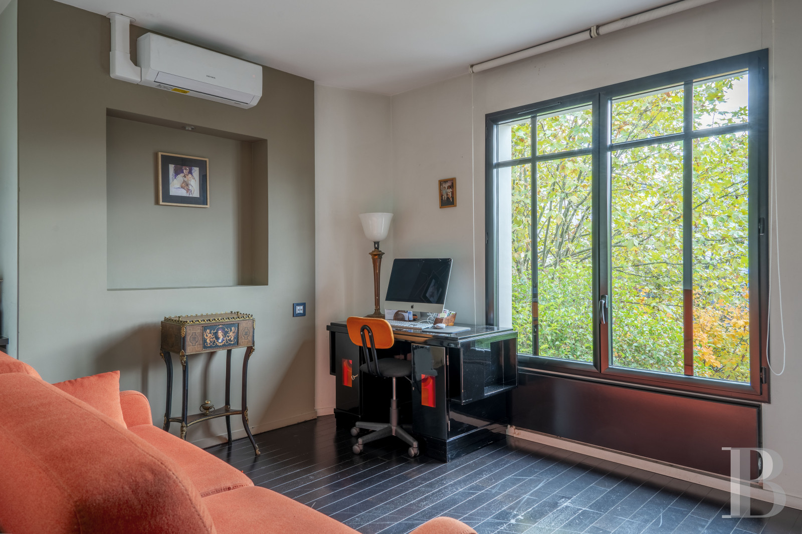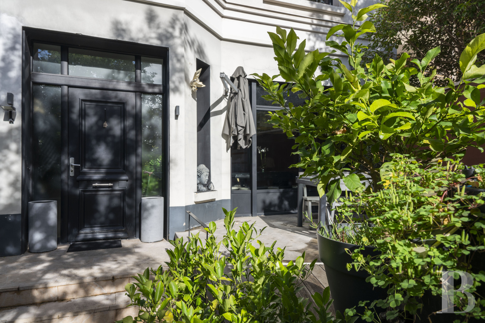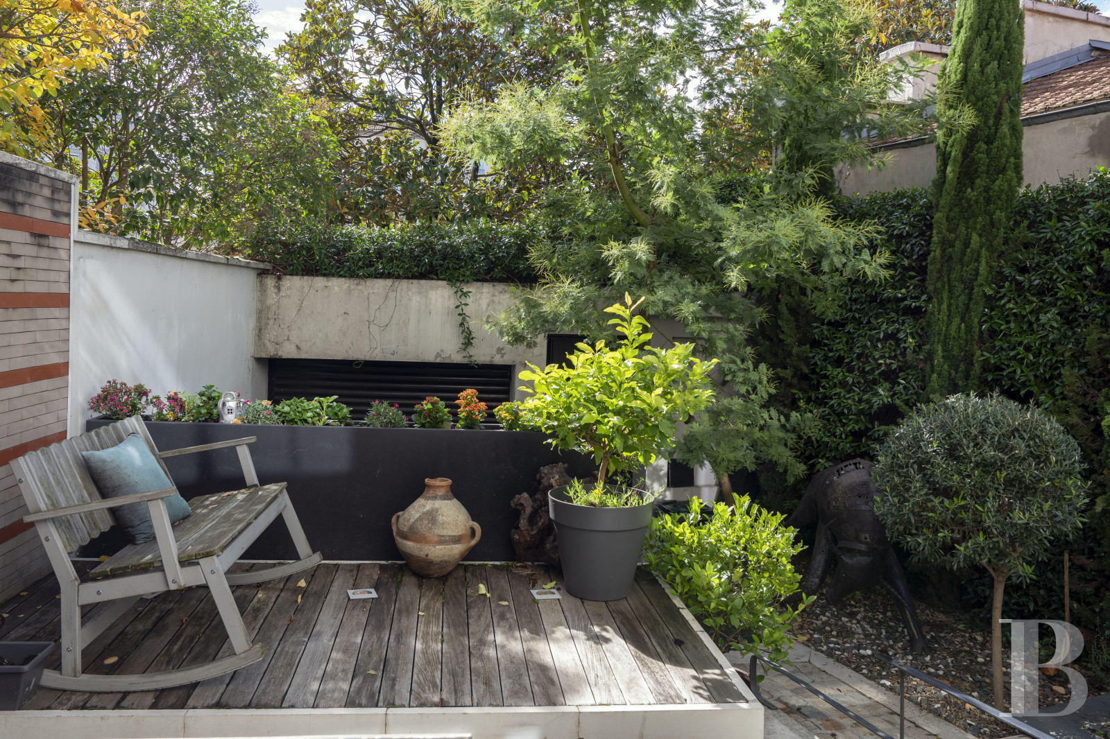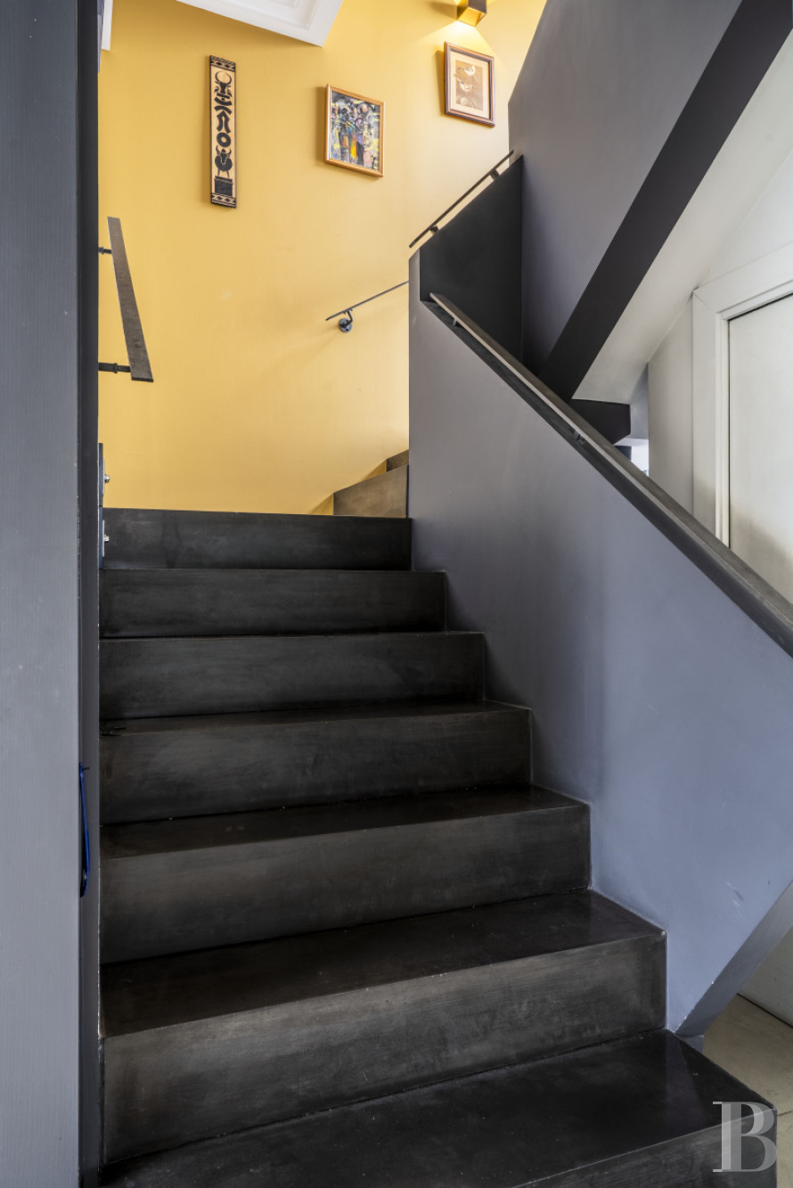 Le vaste vestibule dessert des sanitaires, l'escalier menant aux différents niveaux ainsi que le grand espace de vie décloisonné. Des baies vitrées scandent les volumes et créent un dialogue permanent avec l'extérieur végétalisé. La cuisine équipée, moderne, est dotée d'un discret espace buanderie. La vaste salle de séjour communique avec une terrasse longiligne. Ses ouvertures offrent des perspectives sur le jardin luxuriant, créant une continuité visuelle entre intérieur et extérieur. L'étage comprend deux chambres à coucher, agrémentées de rangements intégrés, ainsi qu'une pièce actuellement à usage de bureau, associée à une terrasse privative. Une salle de bain équipée d'une baignoire et d'une douche, et des toilettes séparées, complètent le niveau. Le sous-sol est composé d'espaces fonctionnels : un garage double avec porte motorisée, dont l'accès privatif évite tout désagrément de stationnement extérieur, une cave et une pièce aménagée en salle de sport.