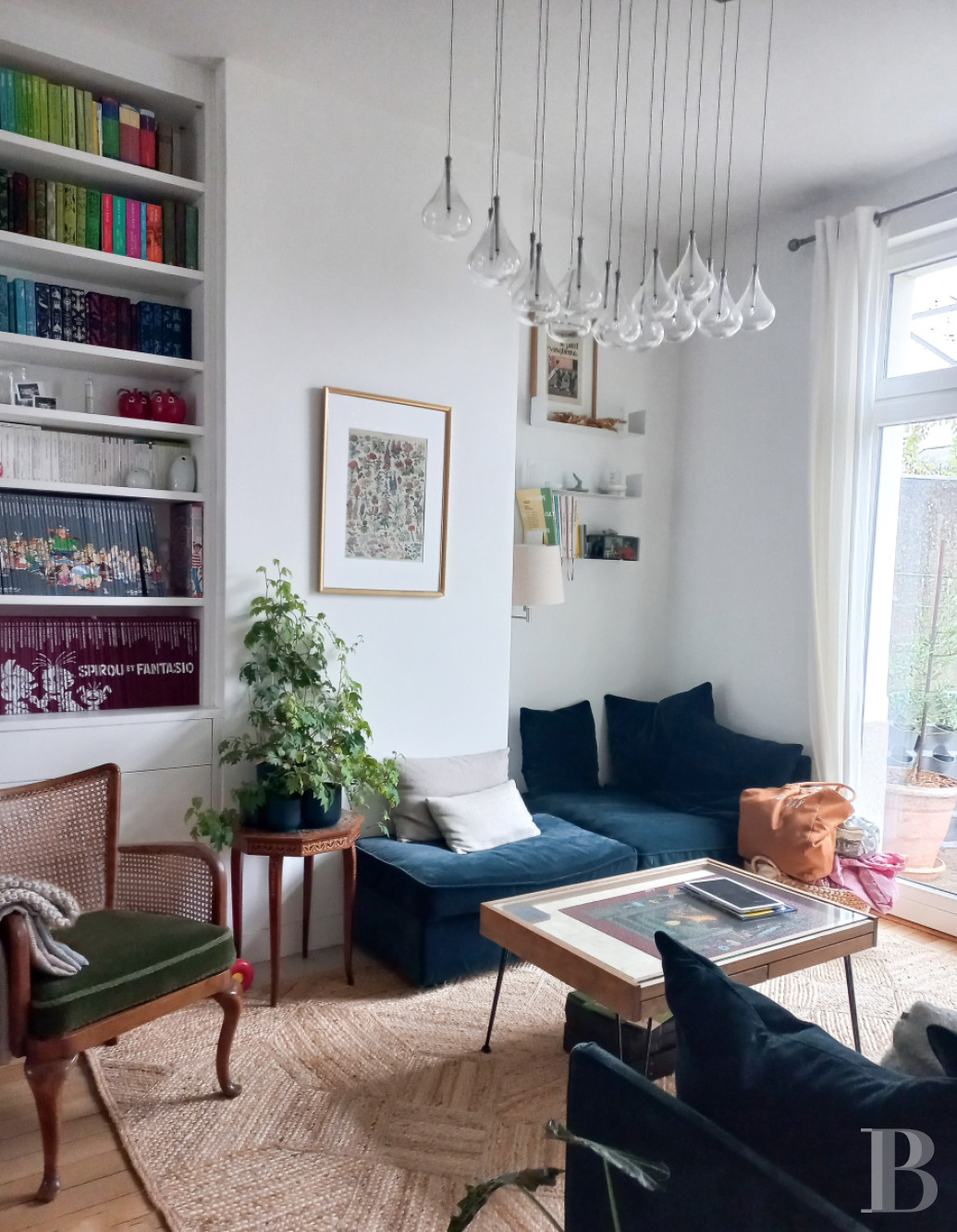 La porte en bois cintrée ouvre sur une entrée au sol pavé de carreaux de ciment emblématique du début du 20e s., prolongée par quelques marches. Un dégagement mène à une salle à manger, ouverte sur un salon, puis à un couloir. Largement éclairées et surélevées par rapport à la rue, les pièces donnent sur une terrasse côté jardin. Les sols sont parquetés et les murs peints en blanc. Une bibliothèque occupe une partie de l'un des pans de mur. Dans le couloir, deux portes donnent accès à un bureau et à une cuisine. Une troisième ouvre sur une salle d'eau avec toilettes. La cuisine, au sol carrelé, est lumineuse grâce à une baie et une porte vitrée.