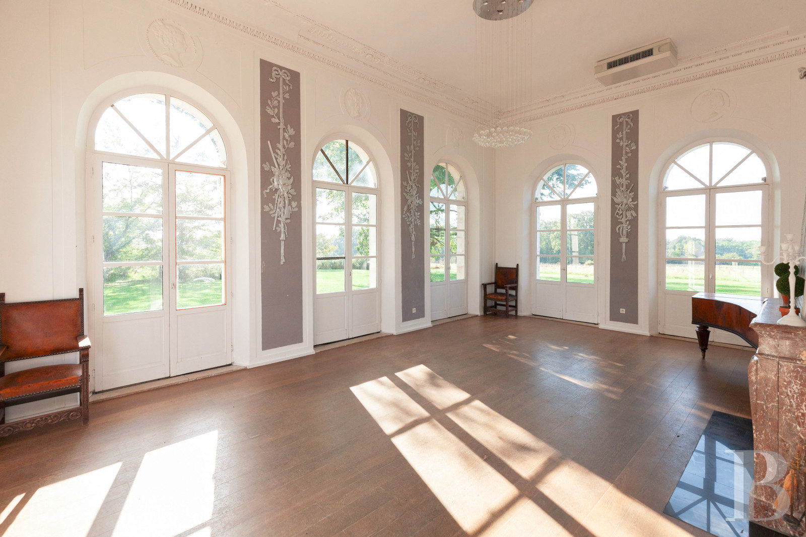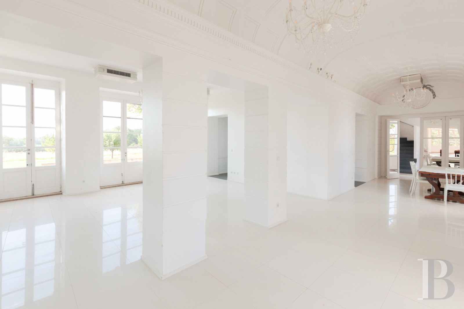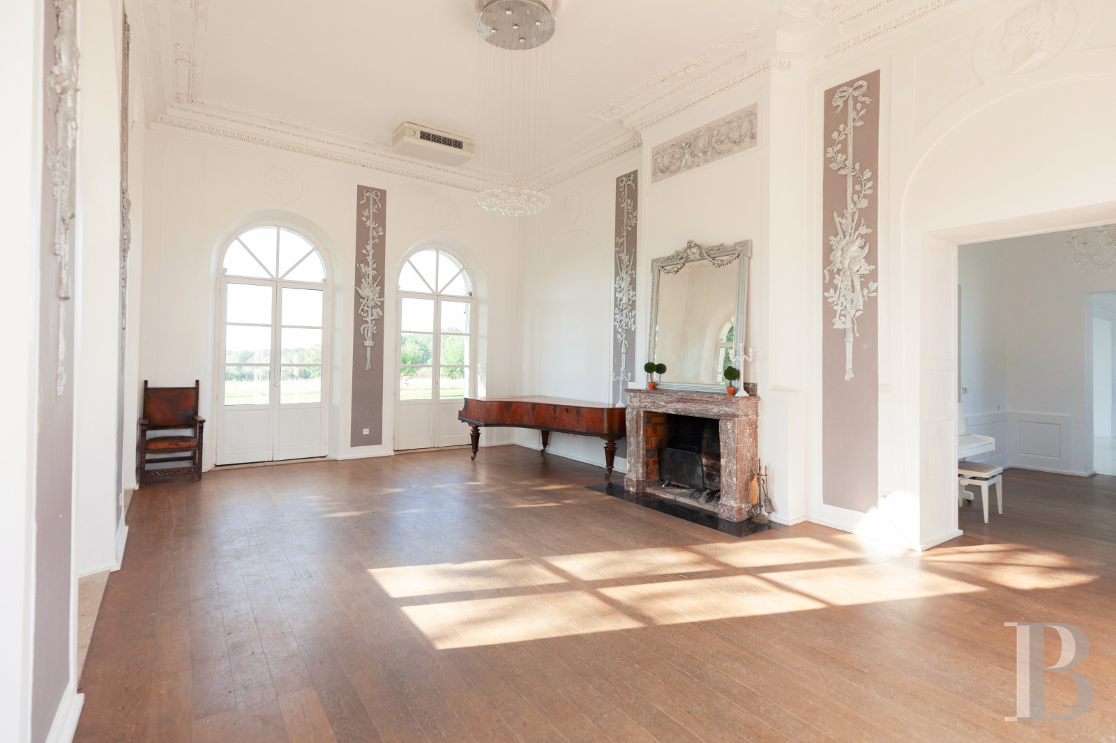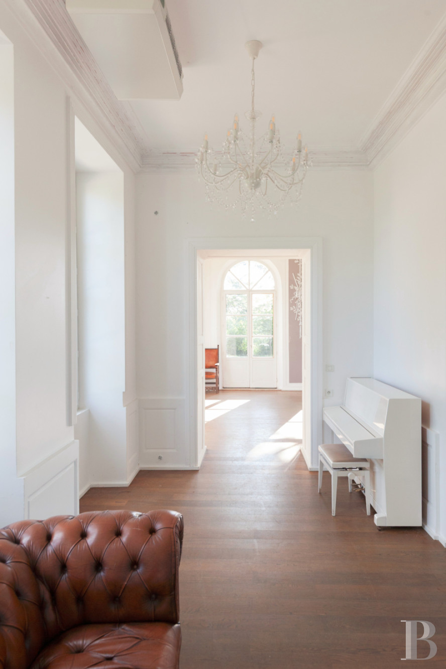 Passé la porte, se révèle une galerie voûtée qui fait office d'entrée d'allure sobre et moderne, blanche du sol dallé au plafond à caissons. Une volée de piliers à base rectangulaire délimite un espace composé de deux pièces parquetées à lames fines offrant, côté ouest, un accès à la terrasse, où profiter de la vue sur un chêne multiséculaire d'impressionnante envergure. À gauche, un ample dégagement dessert une bibliothèque ainsi qu'une pièce de réception, à l'extrémité sud du niveau, aux abondants décors stuqués et aux nombreuses portes-fenêtres à imposte. Une cheminée en marbre rouge de style Empire occupe le mur intérieur. Dans la partie droite du château se trouve une autre entrée, plus petite, abritant un escalier. Contiguë à cette dernière, une pièce héberge deux toilettes et dessert deux cuisines équipées au sol dallé, dont une professionnelle, ainsi qu'une chaufferie. Au centre, enfin, se trouvent un salon et une salle à manger, au sol dallé et blanc, qui ouvrent par des portes-fenêtres à l'ouest.
