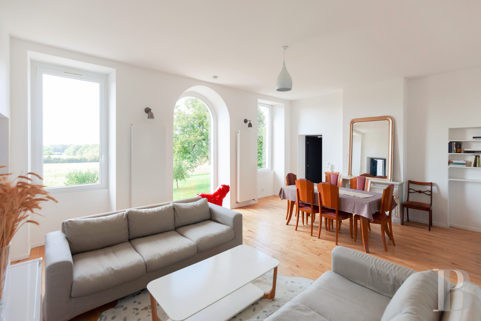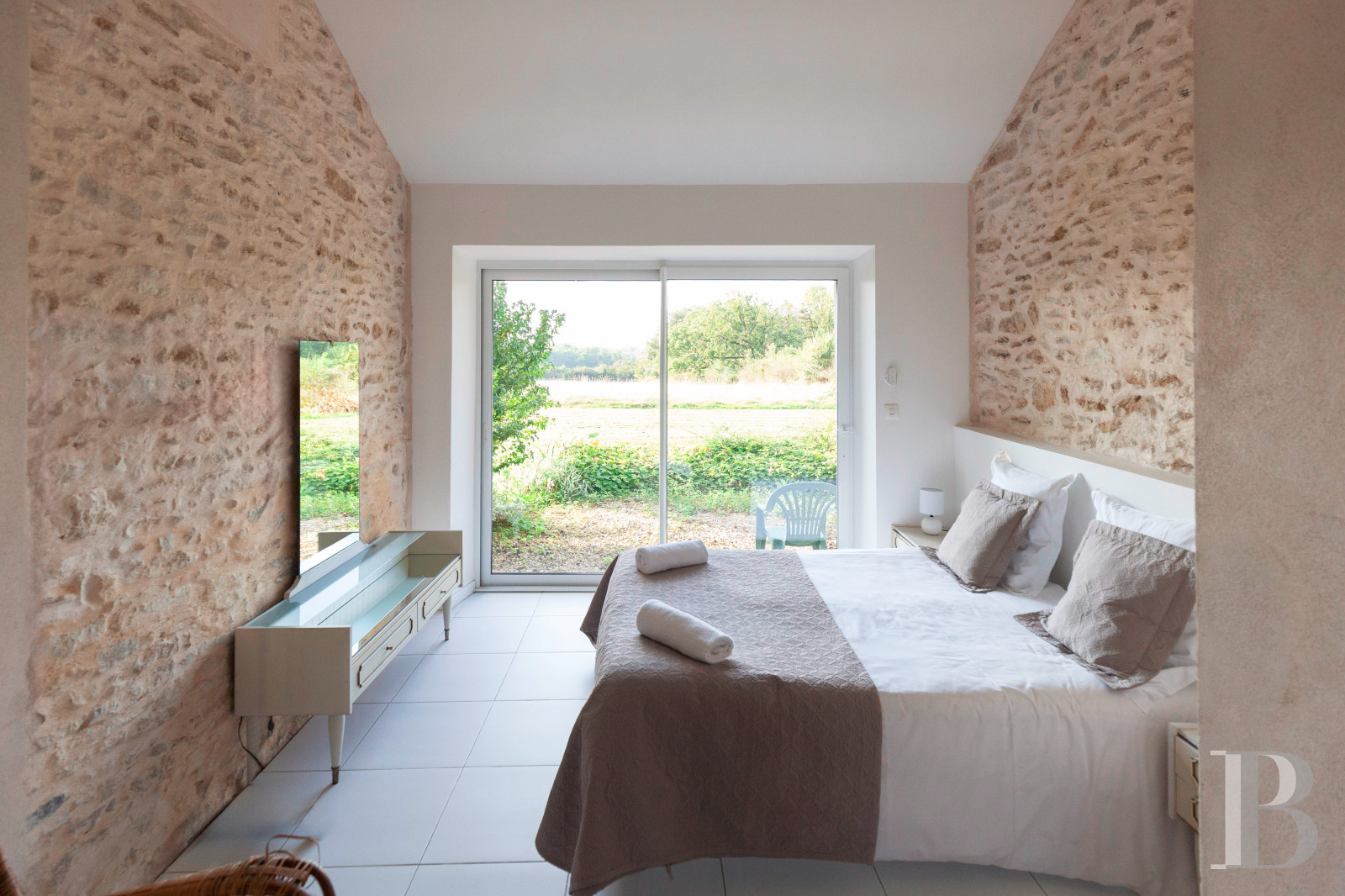 La dernière des trois dépendances, en remontant vers le nord, comprend deux sections, surmontées par une toiture à deux pans de tuiles mécaniques plates que ponctuent cinq discrètes lucarnes jacobines. La partie de gauche, contiguë à la longère, abrite notamment l'ancien four à pain. Celle de droite, la plus grande, est occupée par le gîte. L'ensemble couvre quelque 165 m². Deux spacieuses salles de séjour dallées de blanc se partagent l'essentiel du rez-de-chaussée, l'une d'elles intégrant une cuisine équipée tandis que l'autre a conservé une cheminée et des murs à la maçonnerie de pierre apparente qui apportent une certaine rusticité à l'espace. Des portes vitrées et fenêtres côté jardin donnent beaucoup de luminosité à l'ensemble. Une buanderie, une salle d'eau et des toilettes complètent utilement le niveau. À l'étage, enfin, un palier dessert trois chambres, auxquelles s'ajoutent des toilettes et une salle de bain. Des éléments de la charpente y apparaissent au niveau des murs et plafonds mansardés tandis que les sols sont parquetés à lames fines.
