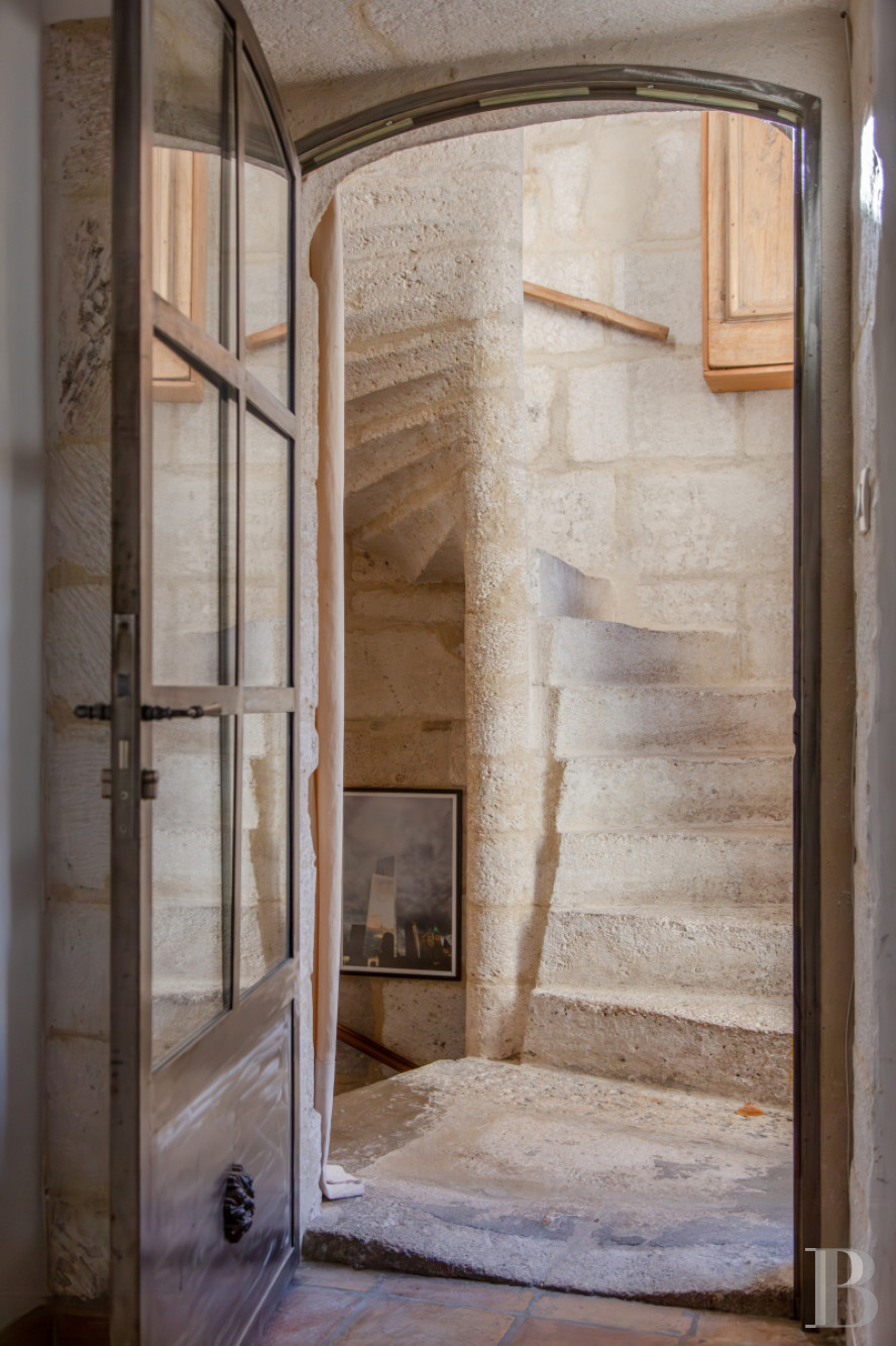 Orientée nord-sud, en saillant de sa façade sur cour, une tour d'angle carrée enserre un escalier en vis en pierres de Vers du 13ᵉ s., desservant les deux étages jusqu'au toit, qui surmonte la structure en devenir d'une future terrasse. Son ascension offre, à travers une série d'anciennes meurtrières asymétriques ouvertes à même sa façade sud, une variété de vues sur les toits du bourg en contrebas et sur le château en position dominante, pareilles à des tableaux de maîtres provençaux accrochés au gré de la muraille.