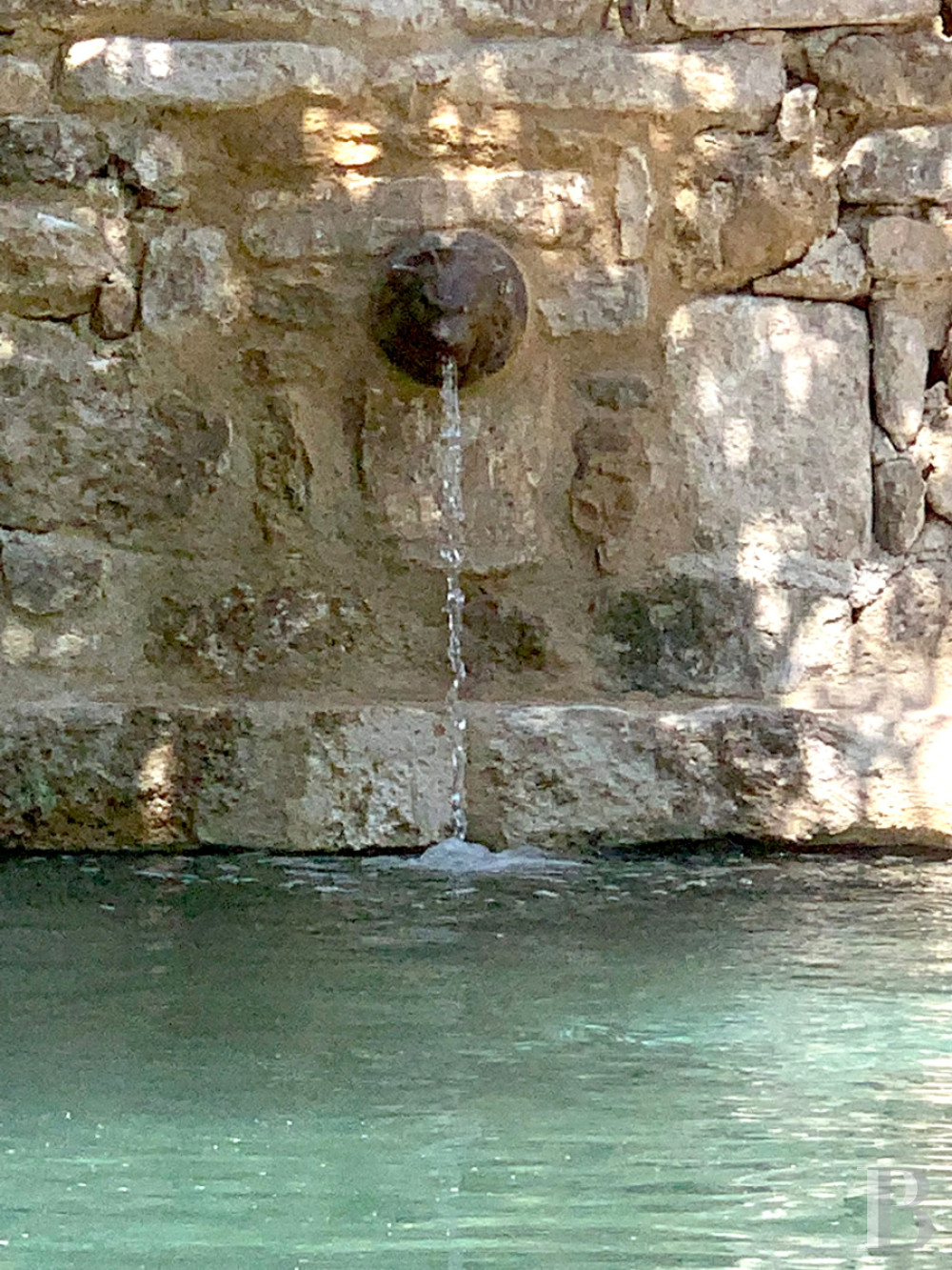 Ainsi le bassin de nage, situé au sommet de la pente, est-il invisible du bas de la maison, où se déroule une longue terrasse dallée de pierres des Baux, à usage de salle à manger d'été. Le dialogue du dallage en calcaire souvent moussu avec les oliviers et autre végétation est ininterrompu. L'escalier court qui emprunte sa forme à celle des gradins pour mener à la piscine, bordée de pierres massives, entretient à la perfection l'illusion d'un espace plus grand. Un vrai coup de génie paysager.