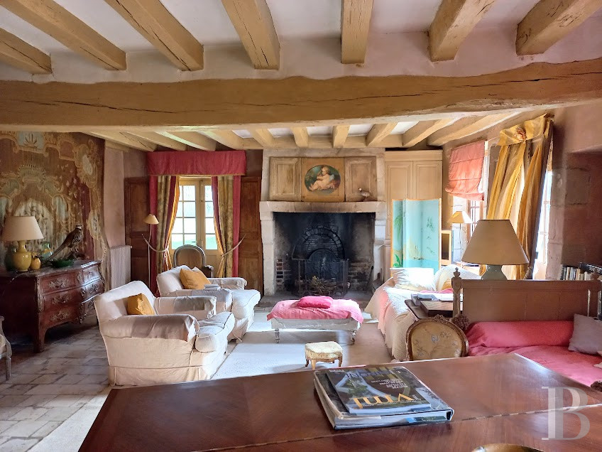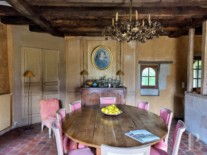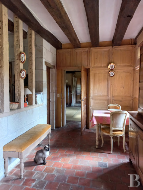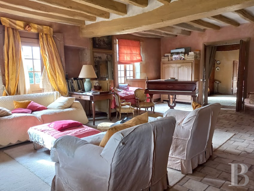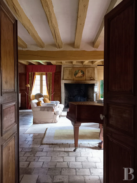 La porte d'entrée, vitrée dans sa partie supérieure, ouvre sur une salle à manger avec cheminée en tuffeau séparée d’une cuisine par un muret de pierre surmonté de colombages. Les murs sont en partie parés de boiseries anciennes. Sur le côté, une porte donne accès à des toilettes ; une autre, à deux salons en enfilade. Le premier, utilisé aujourd'hui comme bureau, est séparé du salon de réception par une double porte en bois. D'une superficie d'environ 50 m², il est éclairé par trois baies tournées vers l'ouest et le sud. Une large cheminée en pierre fait face à la porte et un escalier en bois mène à l'étage. Les sols sont pavés de carreaux de terre cuite, tandis que les poutres ont été laissées apparentes et sont peintes dans le salon.