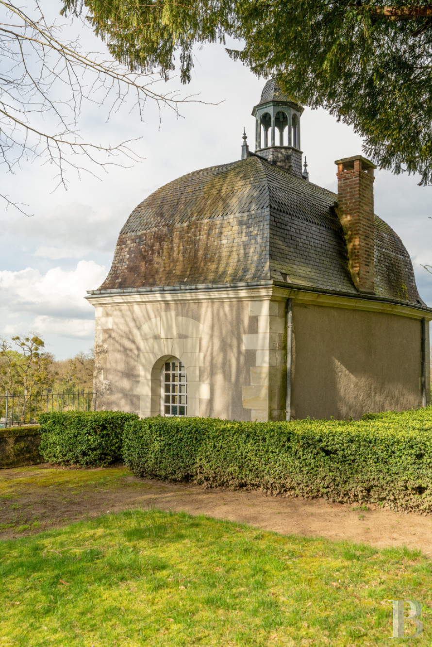 Le pavillonSurnommé « l'étonnante girouette de Belle-Roche », il témoigne des folies d’agrément du 17e s. Construit le long de la terrasse, il est coiffé d'un toit en ardoise à impériale, surmonté d'un clocheton. De petite taille, ouvert sur trois côtés, ses murs et son plafond à caissons sont doublés de boiseries ajoutées au 19e s., de même qu'une cheminée. La tradition orale rapporte que certains de ces décors proviendraient du château de Chanteloup.
