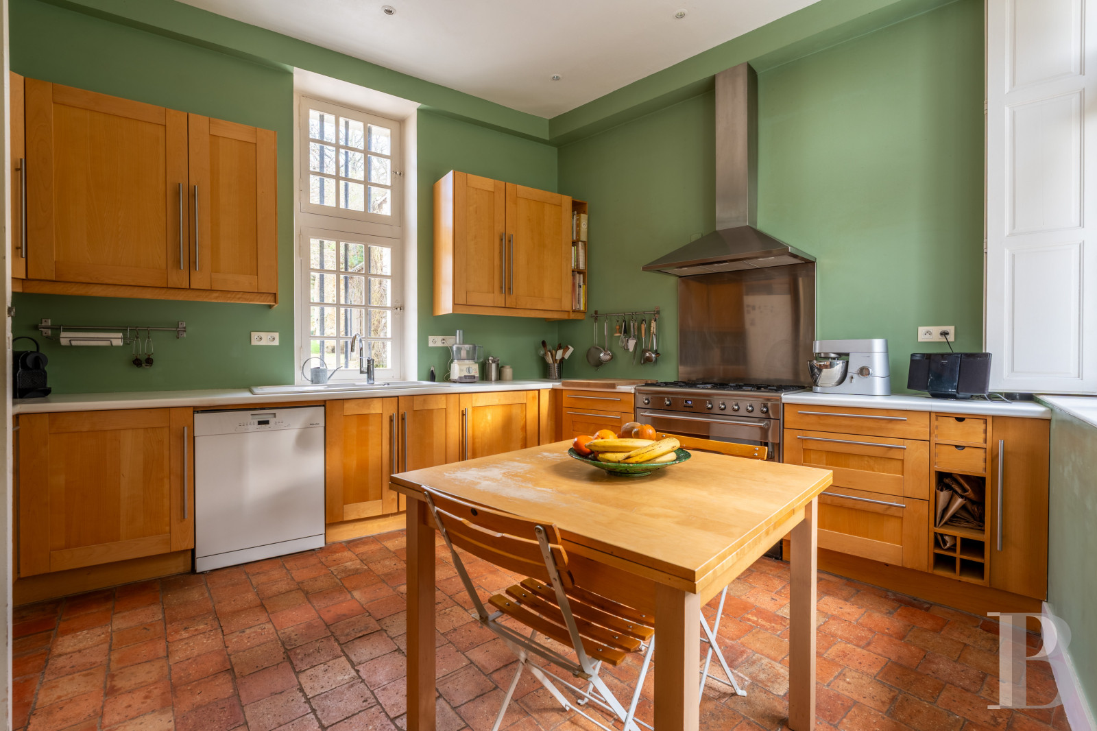 Le rez-de-jardinDepuis la cour, l'entrée se fait par un vestibule d’où part un large escalier. Le sol est dallé de pierre à cabochons d'ardoise. Une bibliothèque s'étend d'un côté, avec une triple exposition et une cheminée en pierre de style Louis XV. Le plafond à la française est peint en blanc. De l’autre côté du vestibule, un salon d'angle est percé de quatre baies. Une porte double ouvre ensuite vers une salle à manger traversante, dominée par cheminée en pierre du 17e s. Le sol est carrelé en terre cuite et le plafond est à la française. S'ensuit une entrée, accessible depuis l'extérieur, qui donne accès à un escalier de service. Enfin, une cuisine aménagée marque l'extrémité de l'aile.