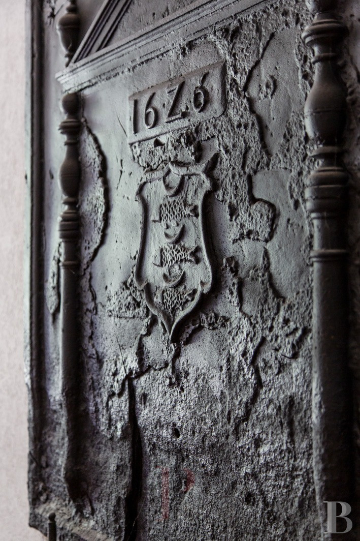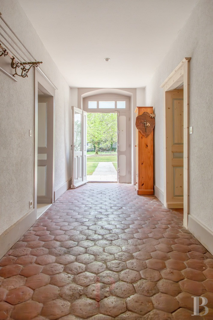 Le vestibule distribue un large couloir au sol revêtu de tomette rouge octogonale, qui débouche sur l'escalier en bois menant à l'étage. Sur la gauche, se tient la salle de séjour : la partie salon est parquetée, tandis que le sol de la salle à manger est en pierre de Bourgogne. Plus loin, une pièce palière, ancienne cuisine adornée d'une cheminée en pierre, dessert les toilettes, la salle de bain, puis la cuisine actuelle, récente, de couleur noire, au sol en dalle de bourgogne. Une autre cheminée en pierre abrite un four à pain. De là, une pièce palière conduit à la chaufferie et à la dépendance. Sur la droite du couloir d'entrée, se trouvent un bureau au plafond mouluré, avec une cheminée en pierre noire, puis une chambre à coucher, ornée de lambris à panneaux peints et d'une rosace au plafond. Un poêle à bois est installé dans une niche arrondie.Toutes les portes et les embrasures sont en bois, à panneaux moulurés. Les radiateurs sont en fonte.