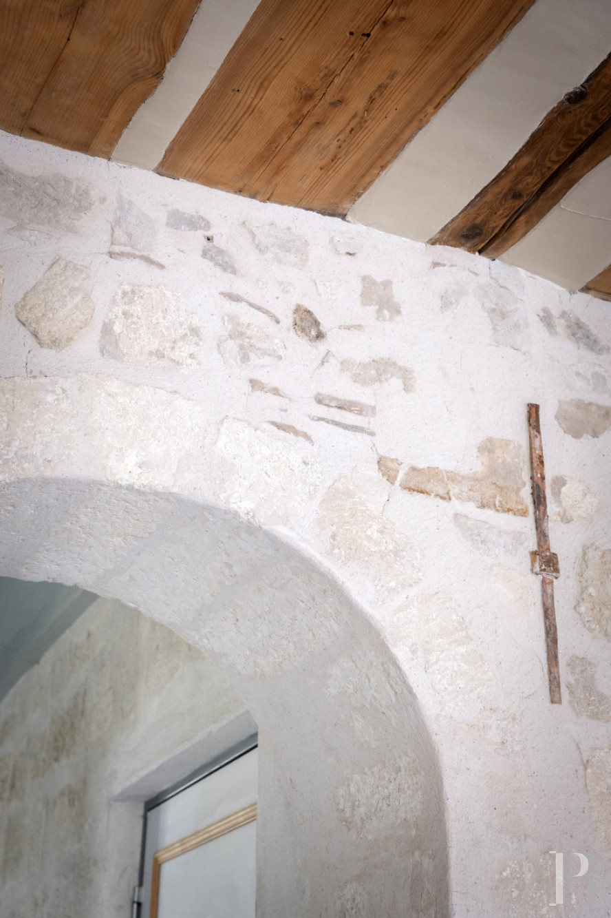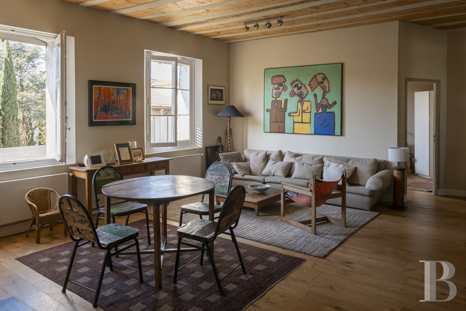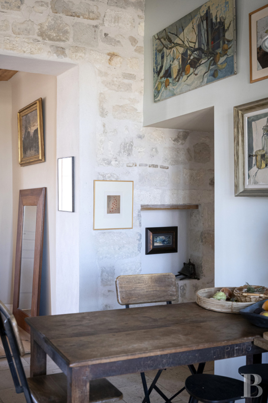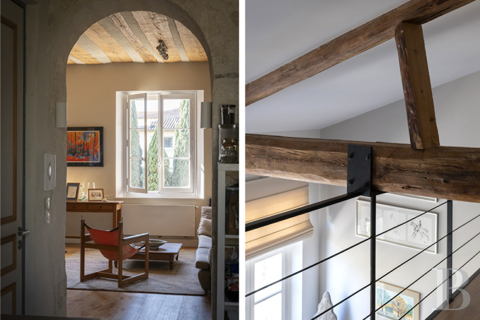 Une porte en bois à motifs de pilastres de style Directoire, surmontée d’un imposte à décor de corbeille, offre l’accès à l’immeuble, en marge de la terrasse du restaurant. Aux carreaux de ciment de l’entrée succèdent les pierres des Baux de la volée d’escalier avec rampe en fer forgé, éclairée par une fenêtre qui ouvre côté place. Récemment rénové, l’appartement occupe tout le second étage pour une superficie d’environ 170 m². La cuisine équipée, carrelée et singularisée par un mur en pierres taillées, est la pièce d’entrée, soulignée par une arche datant de 1720. Elle donne vue sur la place, de même que la chambre qui la jouxte, surmontée d’une mezzanine à usage de studio locatif. Le reste de l’habitation ouvre au sud et au sud-est. Dans la salle de séjour, le parquet en chêne à lames larges, qui se retrouve deux chambres, fait écho au plafond du 18ᵉ s. avec alternance de solives et d'augets de plâtre selon une tradition provençale plutôt rurale.Our opinion