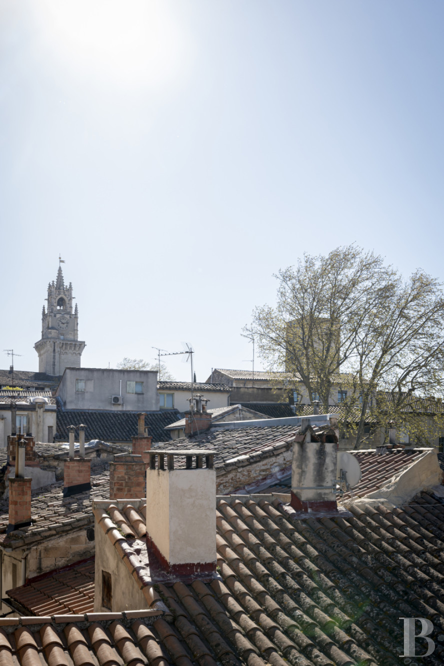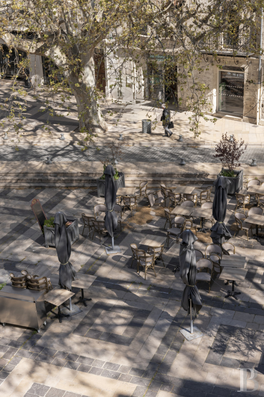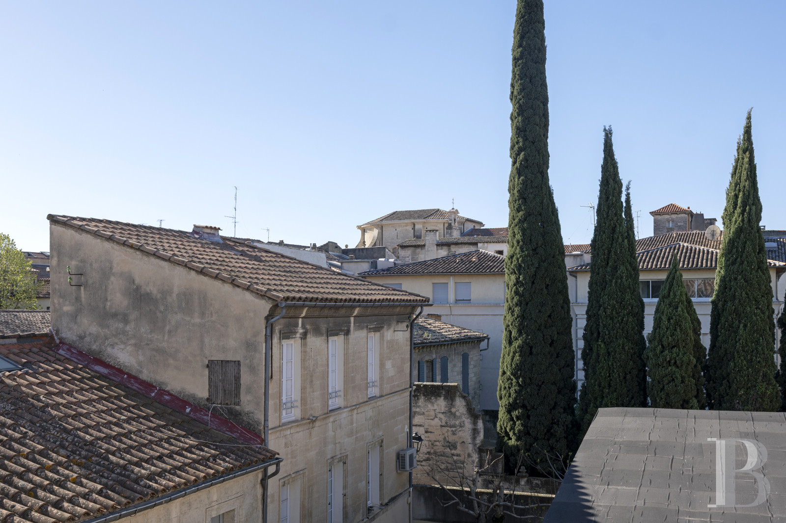 Érigé sur le flanc sud d’une des places les plus célèbres de la Cité des Papes, l’hôtel particulier dans lequel se trouve l’appartement est contemporain de la construction du tout premier théâtre d’Avignon, qui était alors loin d’imaginer son destin de capitale mondiale du théâtre. La place Crillon est close au nord par la façade classique d’un des palaces hôteliers les plus anciens de la ville. La proximité des berges du Rhône, de l’autre côté des remparts qui bordent la place à l’ouest, garantit une fraîcheur bienvenue dans la touffeur des étés provençaux. C‘est ce qui explique que pendant longtemps les hôtels particuliers les plus confortables avaient élu résidence non loin du fleuve.