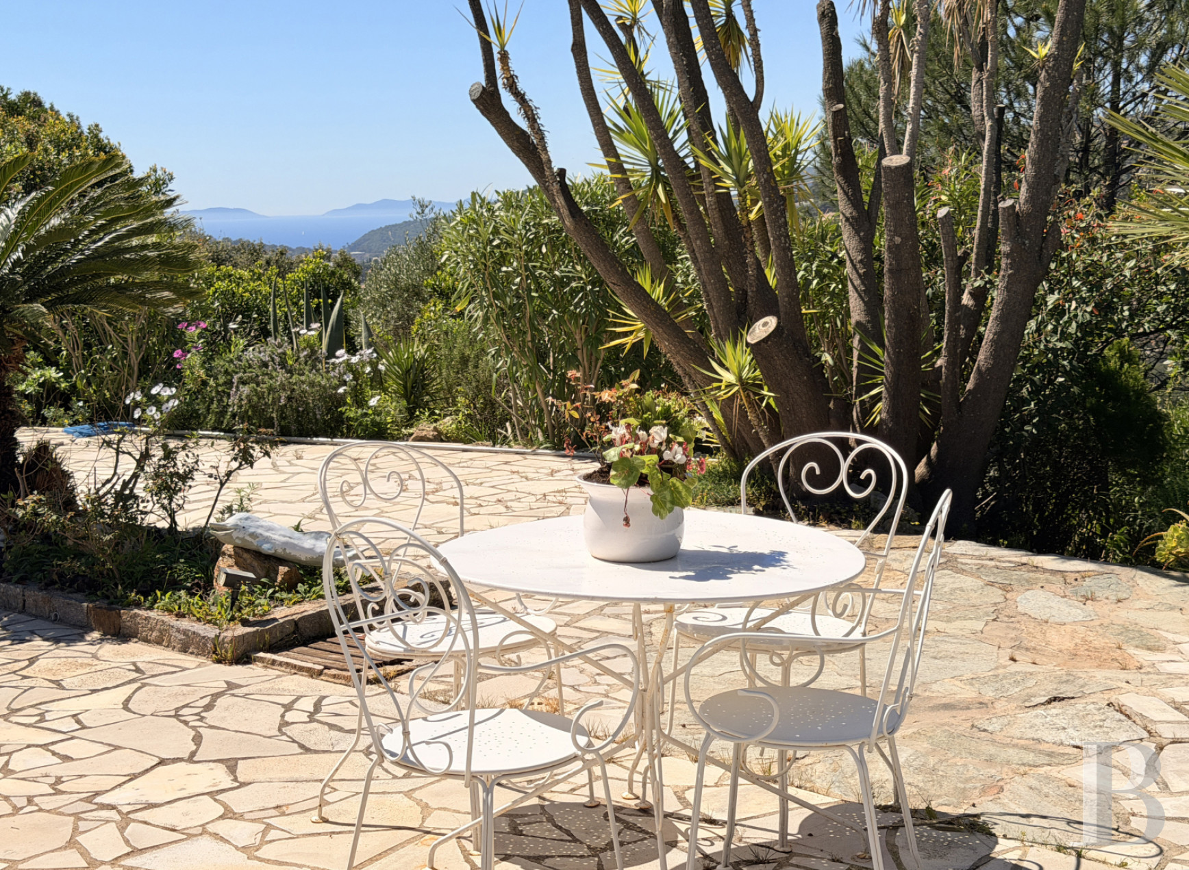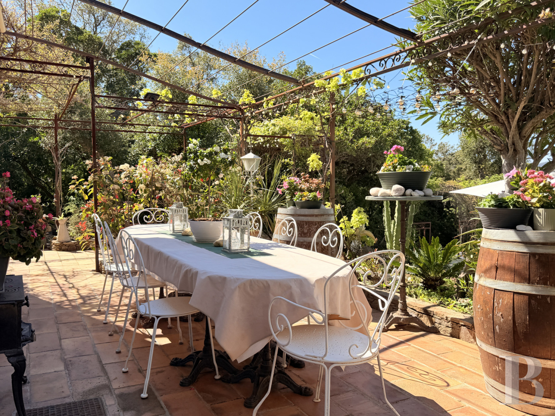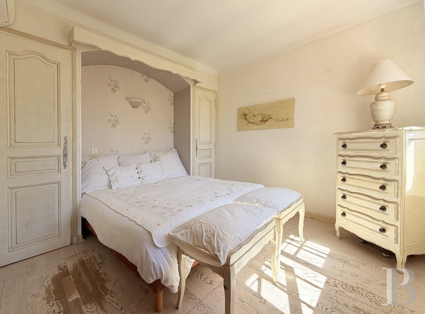 Depuis le chemin, quelques marches permettent de rejoindre la terrasse en pierre qui donne accès à la maison. La porte d'entrée et les baies vitrées des pièces de vie, au premier niveau, assurent des communications fluides entre l'intérieur et l'extérieur. Le rez-de-chaussée est d'abord occupé par une salle de séjour d'environ 40 m² au sol revêtu de terre cuite, aux murs blancs et au volume conséquent grâce à son plafond de plus de 7 m de haut à poutres apparentes. En son sein, se trouvent un espace avec cheminée en brique à insert et linteau de bois ainsi qu'un escalier maçonné avec nez de marche en bois, qui commande une mezzanine. La cuisine équipée se prolonge par une véranda de même surface. Quelques marches conduisent à la salle à manger, longée par une terrasse couverte. Enfin, un couloir mène aux deux chambres du rez-de-chaussée, à une salle de douche et à des toilettes. L'étage, quant à lui, rassemble un bureau dans l'espace mezzanine, trois chambres – dont une avec sa terrasse et un bel aperçu mer – ainsi qu'une salle d'eau. Les sols sont revêtus de carreaux de terre cuite rectangulaires ou hexagonaux dans la plupart des pièces, et recouverts de parquets flottants dans plusieurs chambres, toutes étant équipées de climatiseurs. Enfin, la maison dispose d’une cave voutée en pierre de 7 m² qui permet de conserver le vin au frais dans de bonnes conditions.L'appartement