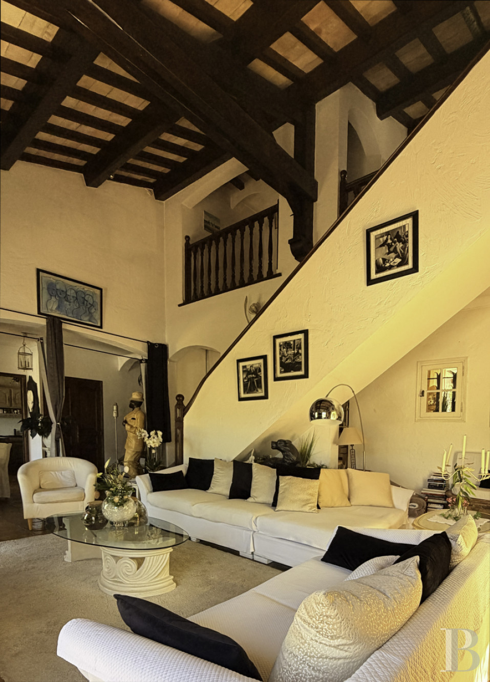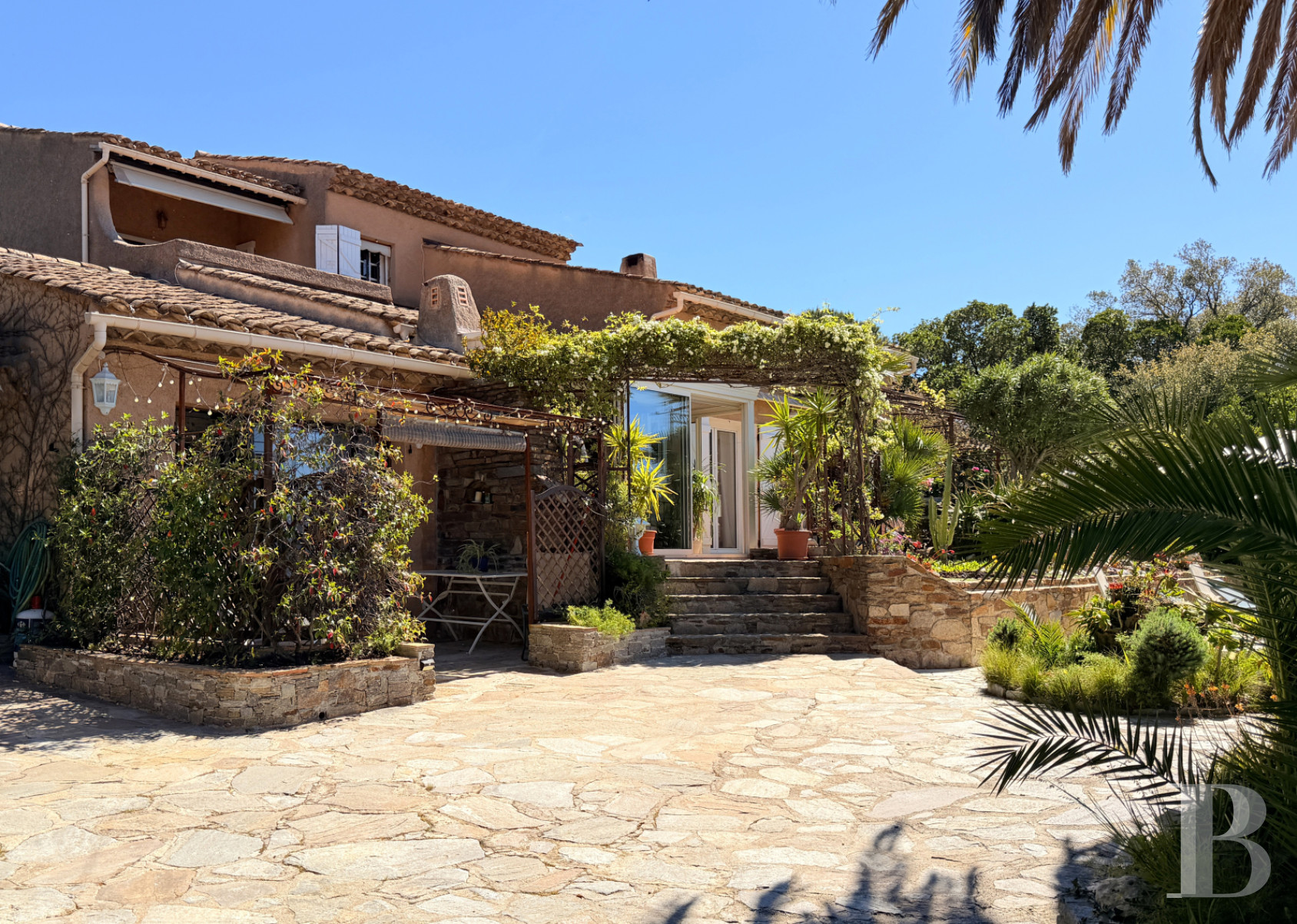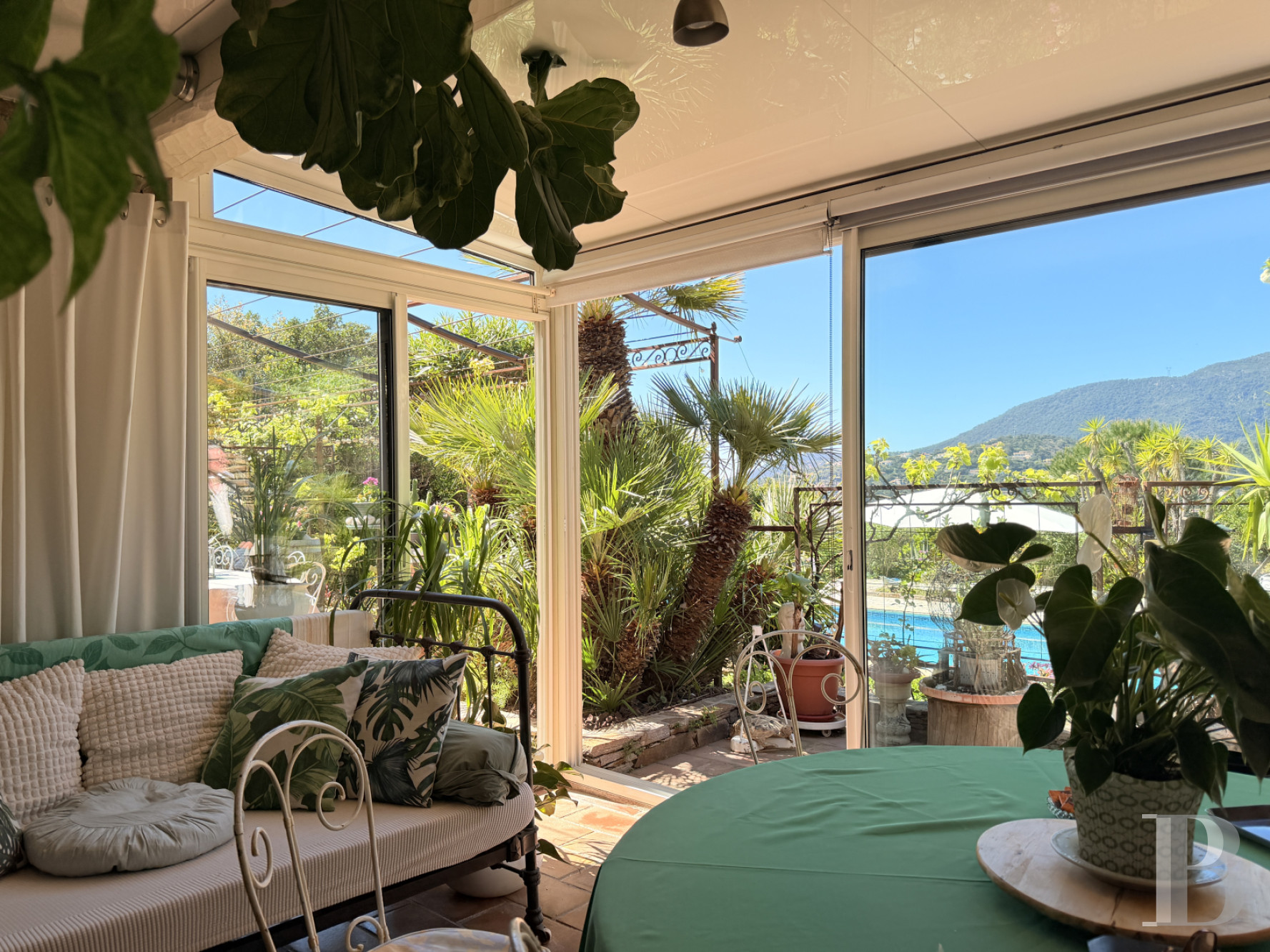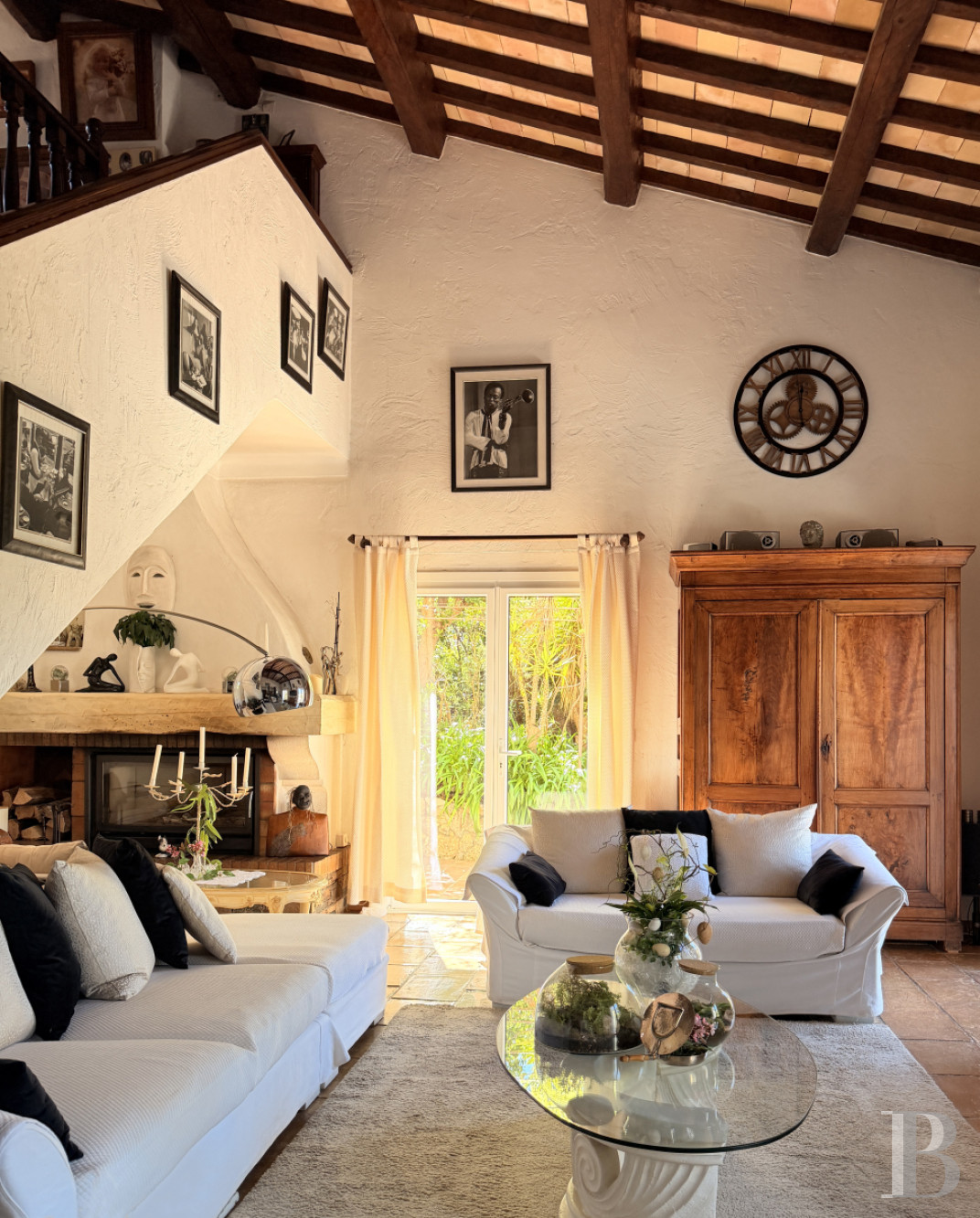 Depuis le chemin, quelques marches permettent de rejoindre la terrasse en pierre qui donne accès à la maison. La porte d'entrée et les baies vitrées des pièces de vie, au premier niveau, assurent des communications fluides entre l'intérieur et l'extérieur. Le rez-de-chaussée est d'abord occupé par une salle de séjour d'environ 40 m² au sol revêtu de terre cuite, aux murs blancs et au volume conséquent grâce à son plafond de plus de 7 m de haut à poutres apparentes. En son sein, se trouvent un espace avec cheminée en brique à insert et linteau de bois ainsi qu'un escalier maçonné avec nez de marche en bois, qui commande une mezzanine. La cuisine équipée se prolonge par une véranda de même surface. Quelques marches conduisent à la salle à manger, longée par une terrasse couverte. Enfin, un couloir mène aux deux chambres du rez-de-chaussée, à une salle de douche et à des toilettes. L'étage, quant à lui, rassemble un bureau dans l'espace mezzanine, trois chambres – dont une avec sa terrasse et un bel aperçu mer – ainsi qu'une salle d'eau. Les sols sont revêtus de carreaux de terre cuite rectangulaires ou hexagonaux dans la plupart des pièces, et recouverts de parquets flottants dans plusieurs chambres, toutes étant équipées de climatiseurs. Enfin, la maison dispose d’une cave voutée en pierre de 7 m² qui permet de conserver le vin au frais dans de bonnes conditions.L'appartement