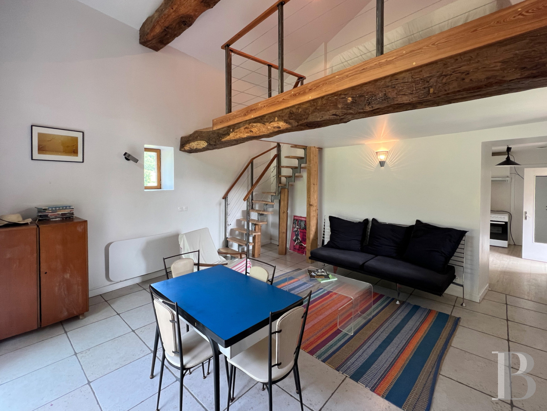 Accessible via un escalier extérieur couvert, le premier gîte, d'une surface de quelque 75 m², est organisé autour d’une pièce de vie avec mezzanine. Une grande baie vitrée, orientée au sud, communique avec la terrasse extérieure et un jardin privatif. La cuisine, deux pièces de nuit chacune associée à une salle de douche et des toilettes privatives, complètent la distribution. Le second gîte, d'une superficie de 45 m² environ, également accessible par un escalier extérieur, est actuellement en travaux. Il comprend une salle de séjour avec espace cuisine, une salle de douche et des sanitaires.La cave et les sous-sols