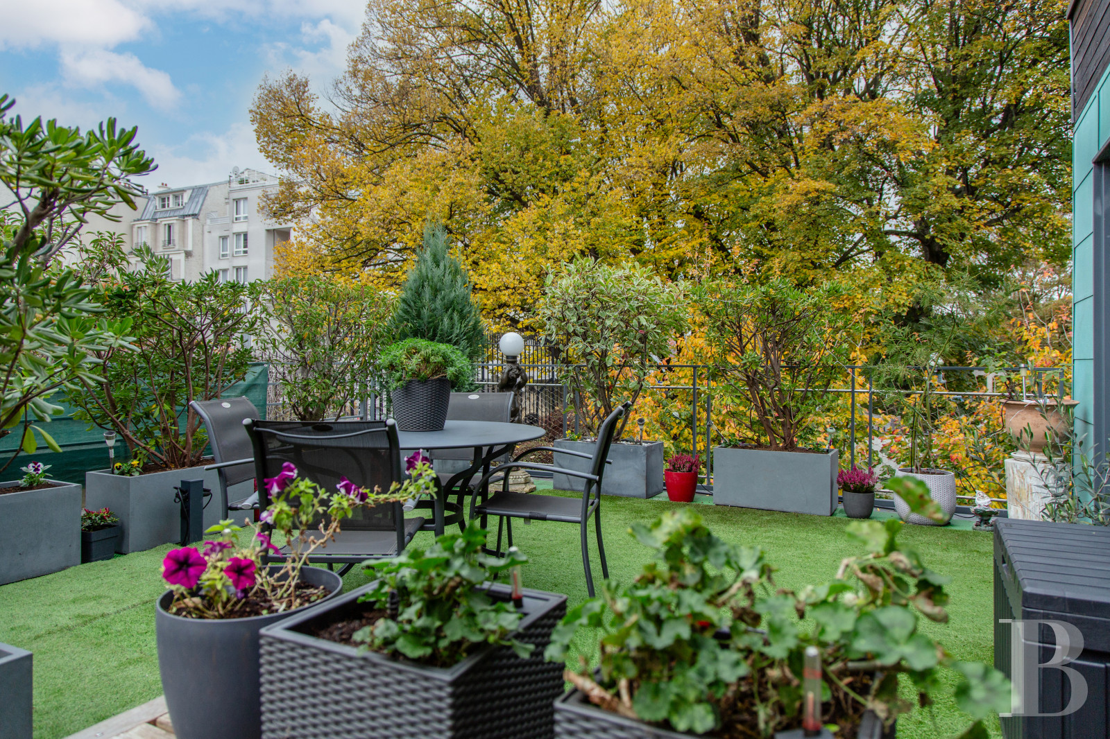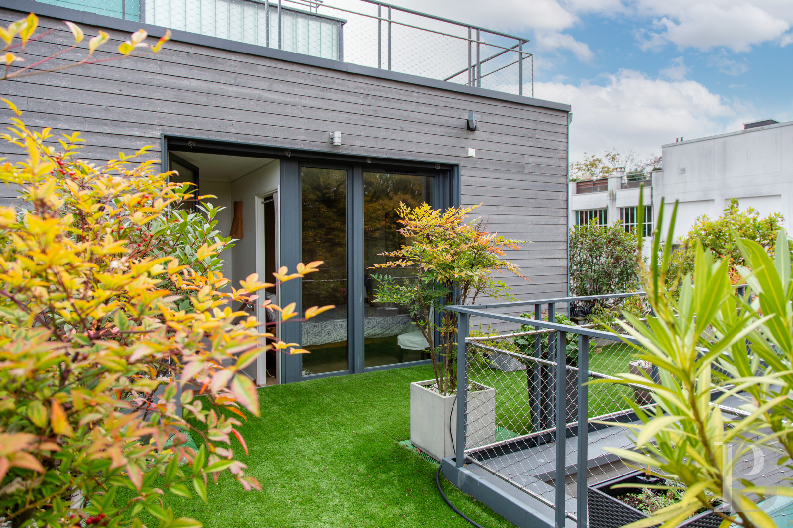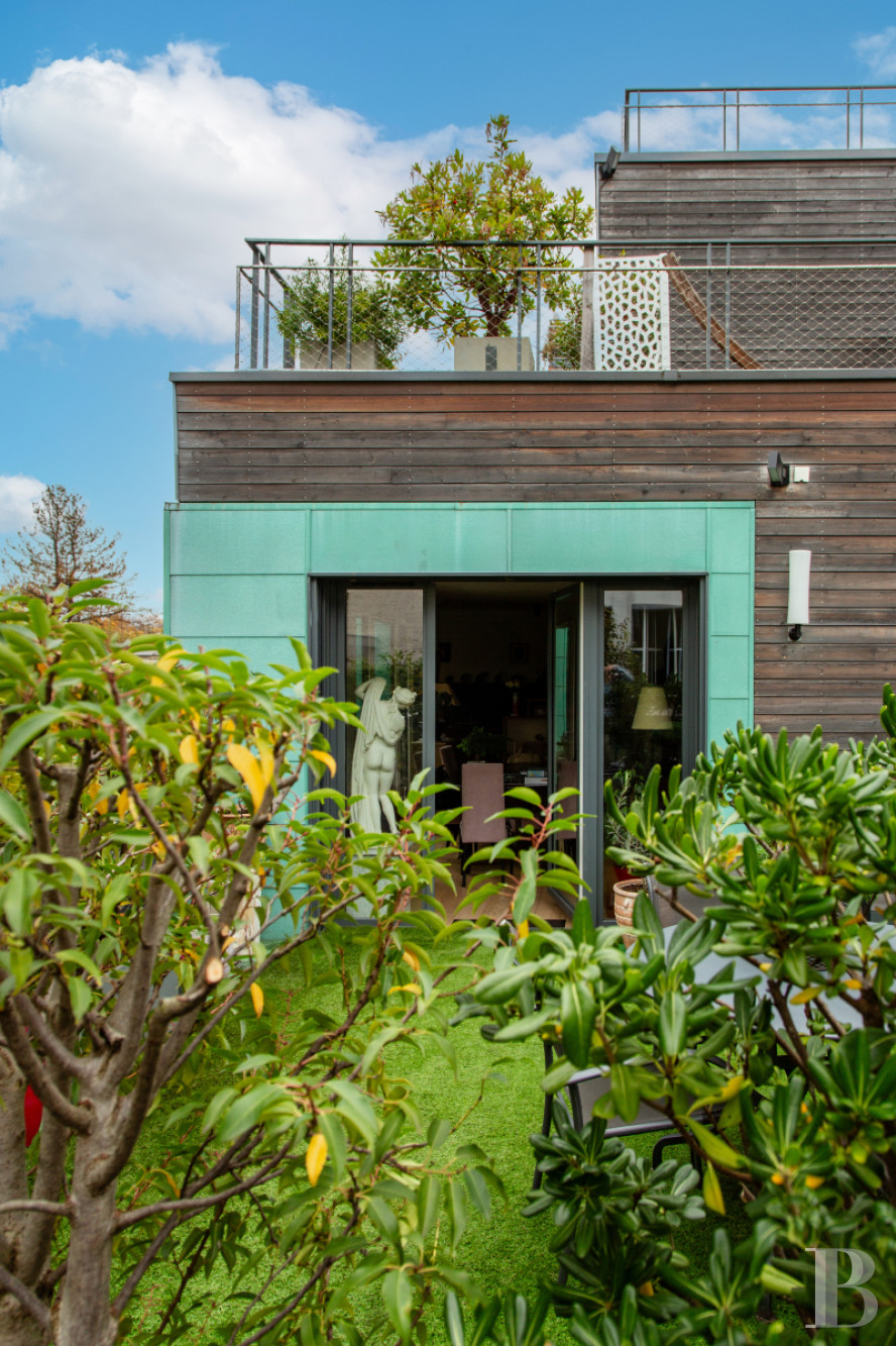 At the end of a cul-de sac, behind a secure gate, the right-hand side of a paved courtyard is occupied by an early 20th-century folly, which is an astonishing and unique troubadour style house. The building in which the apartment is located stands to the left. Its construction was completed in 2017 and the ten-year contractors’ guarantee insurance runs until 2027. It meets HQE high quality environmental constructions standards and its façades combine green-hued wood and zinc. There is a video intercom in the building’s entrance, while to enter the second part of the building another door is fitted with an entry code system.