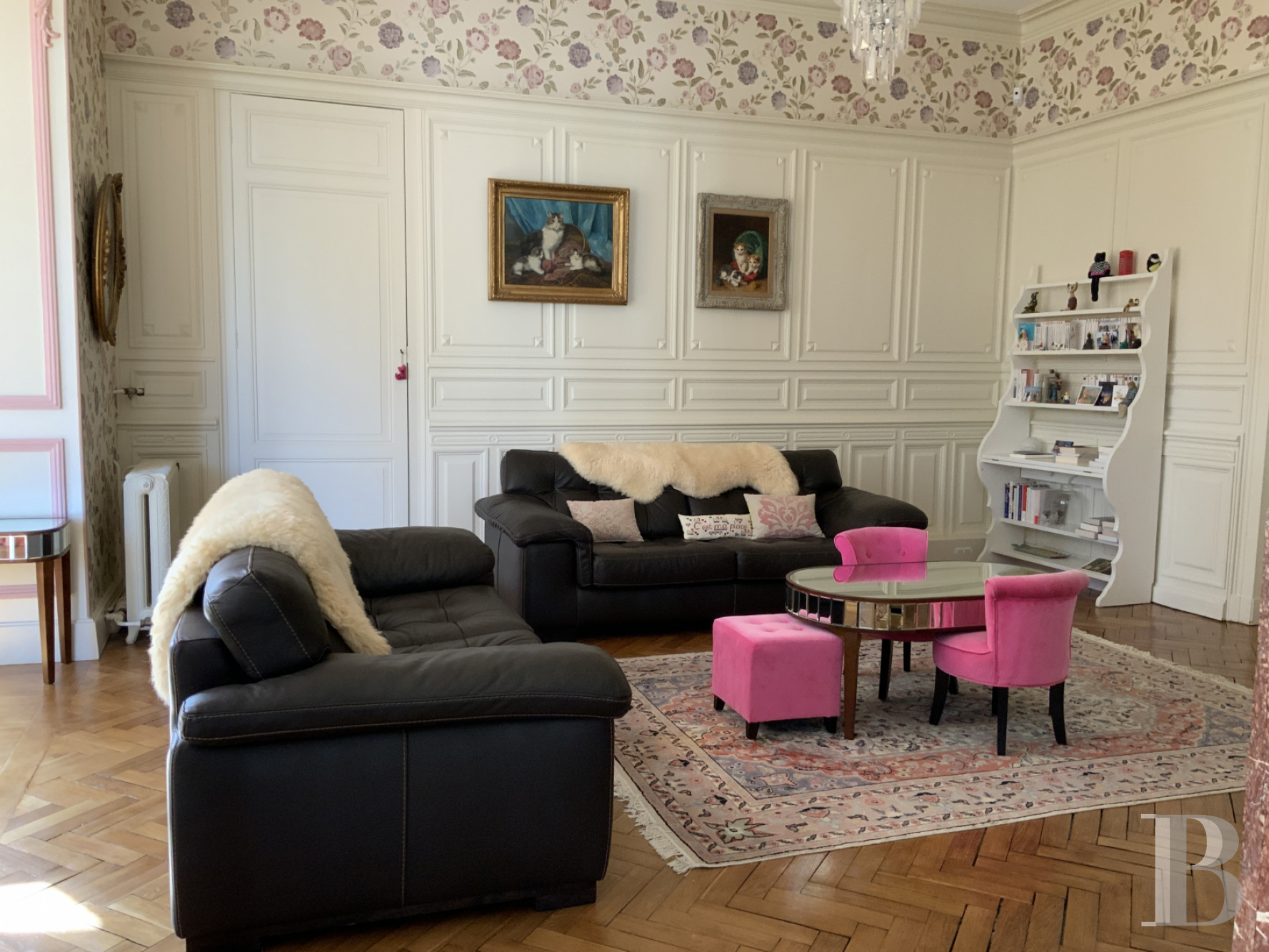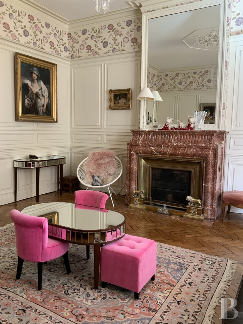 The main entrance leads into a long, wide dual-aspect hallway that connects to all the floor’s rooms. Cement tiles cover the floor of this hallway, white Bordeaux limestone make up its walls and a plaster cornice embellishes its ceiling. Where you enter this central hallway, functional rooms flank it: a lavatory and a storeroom. After these, two bedrooms lie opposite one another. Each bedroom connects to a shower room and lavatory. Modern wallpaper adorns their walls, strip parquet covers their floors and a built-in marble fireplace in each room underlines the edifice’s authenticity. Next come the living room and dining room, which also face one another. Two large wooden double doors form the entrance to each room. On the right is the living room. Old panelling covers the walls up to the top, a red marble fireplace stands majestically on one side and the floor is adorned with chevron parquet. A bay bathed in daylight leads onto a tiled terrace. This terrace offers a pleasant view of the grounds and its 200-year-old magnolia. The dining room is embellished with a white marble fireplace with projecting volutes. Its cast-iron radiators feature old flower patterns. The floor is tiled and the walls are adorned with wallpaper. A little further on stands a half-turn stone staircase with a guardrail made of metal and wood. A skylight fills it with daylight. The kitchen is fully equipped and modern. A scullery and storage space adjoin it. Through French windows, it leads directly out onto an outdoor tiled terrace near the swimming pool. It is a spacious kitchen. A checked pattern of red and white cement tiles covers its floor. Its walls and ceiling are painted white. Opposite it, the last ground-floor room can be used as a lounge or office. This vast, bright space extends the living room. Its walls are painted. Exposed wooden beams run across its ceiling. Its plaster walls stand upon a chevron parquet floor. A centred fireplace embellishes the room and a window seat completes a bay.