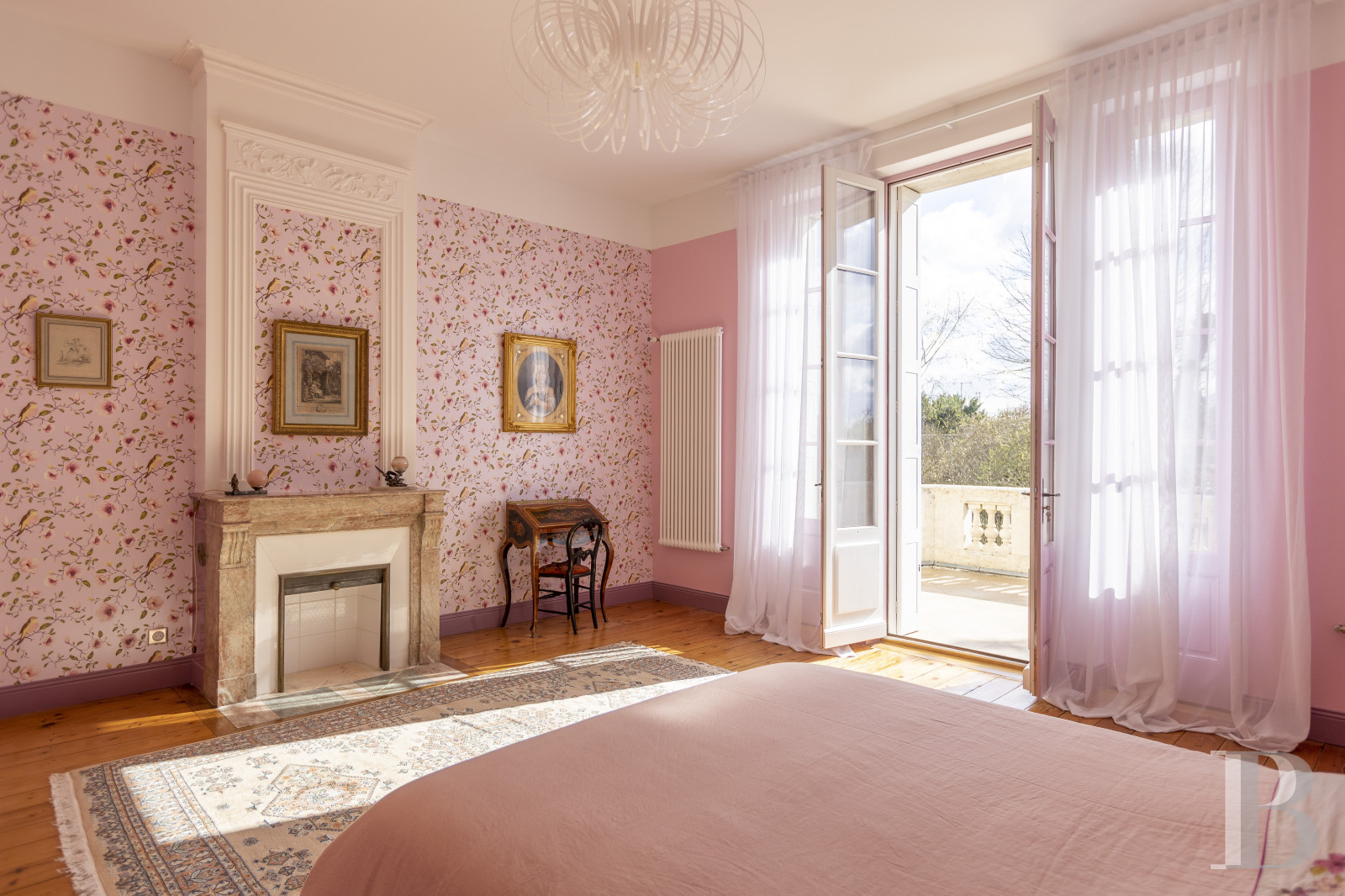 At the northern end of a long dual-aspect landing is a window. And at its southern end are wooden French windows that lead out onto a balcony. The four first-floor bedrooms are elegant and spacious. They have been renovated and decorated in a refined style. All of them have parquet flooring, plastered ceilings and walls adorned with plainly patterned wallpaper. With their dual-aspect position, their floors and ceilings are brightened with natural light during the day. One of them enjoys direct access to a private terrace upon a bay window beneath it. Two of the others have balconies with views over the grounds. Shower rooms connect to them. On the northern side, an office space overlooks the town’s rooftops. A large windowless room that can be reached from the landing has been fitted with a sizeable wardrobe.