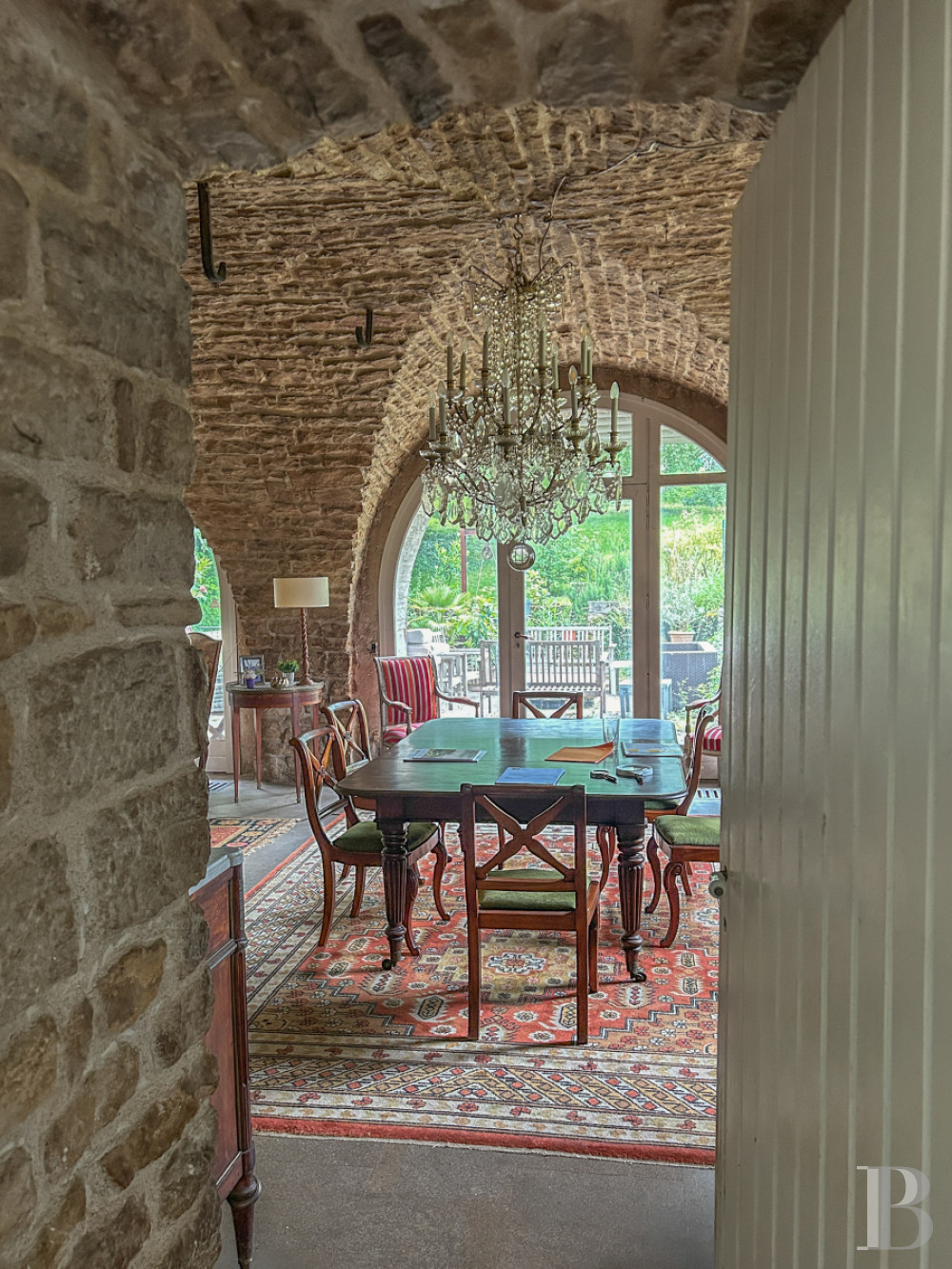 You enter the ground floor via the court on the east side or via a front door straight from the lane on the south side. You step into a spacious hallway with a floor of stone slabs where the estate’s old winepress has been preserved. From here, a stairwell leads upstairs. The hallway also connects to a boiler room, a lavatory and a fitted kitchen that looks out at the garden. On the west side, there is a magnificent old stone vaulted cellar with a 70m² floor area. Today, it serves as a delightful lounge and dining area. Two broad arched windows fill this reception room with natural light. Jura stone adorns the floor, in which the radiators are hidden. This large room also features an open-hearth stone fireplace.