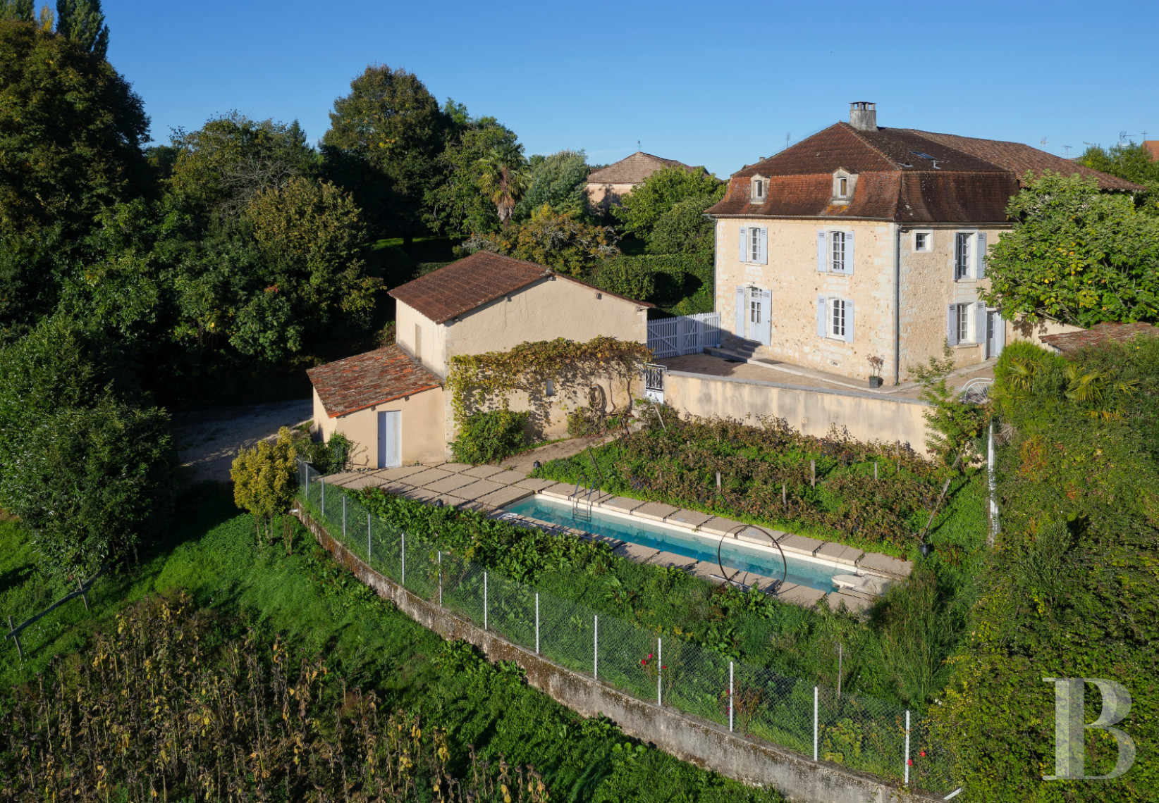 The concrete court is closed with a wooden gate and edged with the house, the barn, a wall, a well, a storeroom and a guardrail facing the landscape. Today, this court serves as a terrace. Vehicles park in the lean-to garage and on a limestone area. Part of the barn has been turned into a lavatory, with a mezzanine floor of around 20m² above it. A few steps lead down to the lap pool, the garage’s back door, and a garden of flowers with the delightful fragrance of lavender. Just before the meadow, there is an orchard where fruit trees of many different varieties grow. These fruit trees include a cherry tree, a fig tree, a walnut tree, a hazelnut tree, a plum tree, a mirabelle tree, an apple tree, a pear tree and a peach tree.