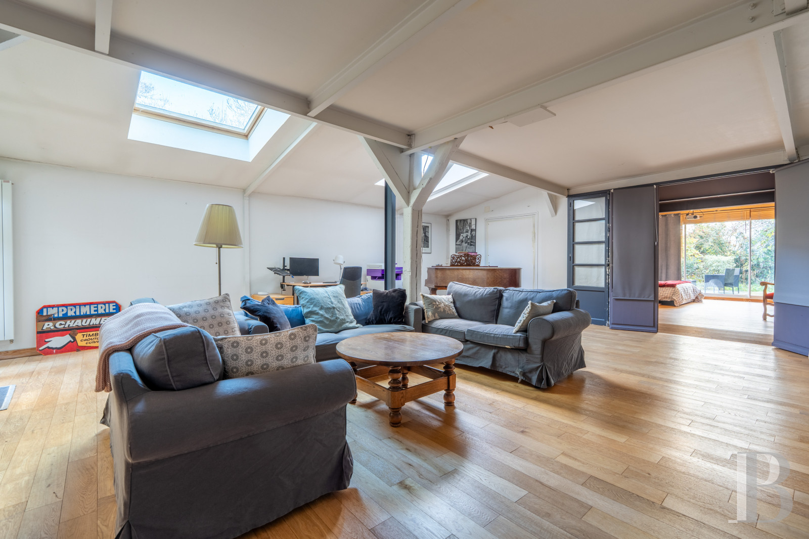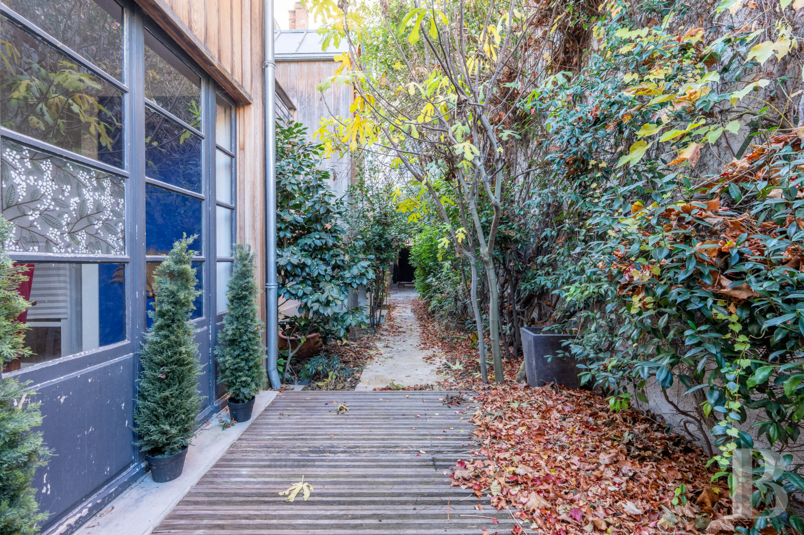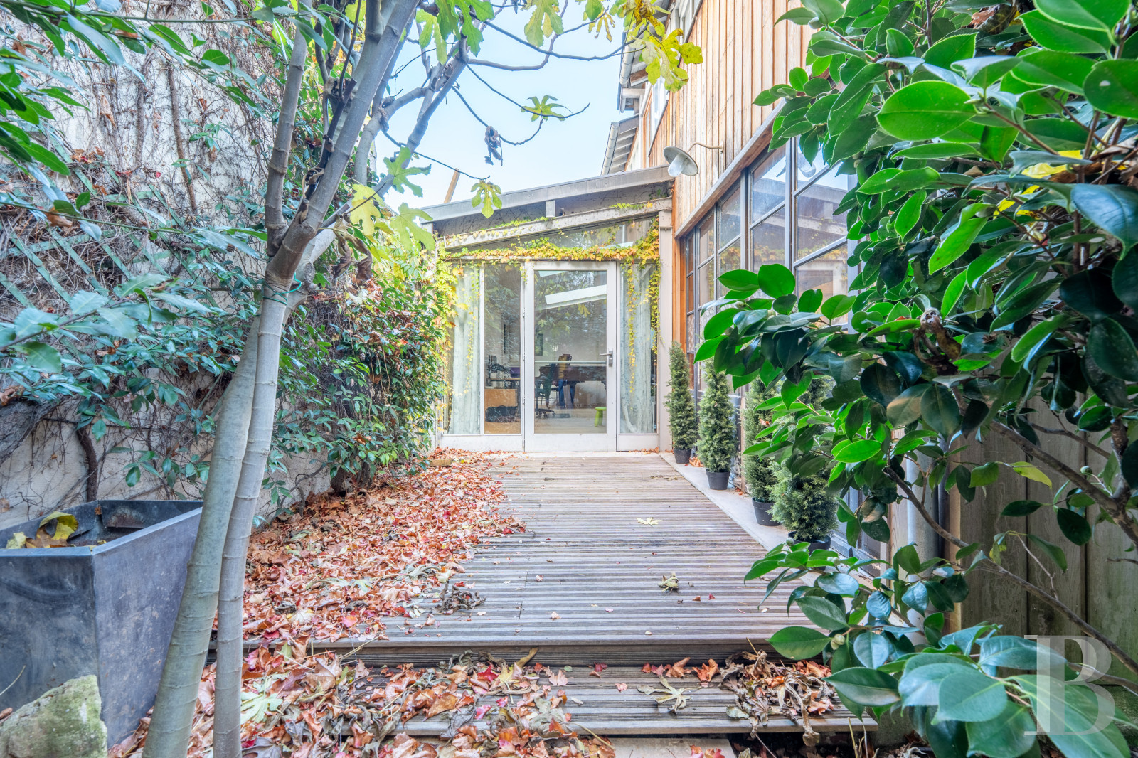 These single-level constructions were built in the 1950s, with one raised section above the others, as well as facades that are rendered or with wooden facing. The roofs combine zinc and slate. They can be reached from the outside via the entrance porch or from the inside of the townhouse via the dining room. A door opens into a kitchen with a dining area. Next to it, a double-leaf door leads to a vast and bright space transformed into a dining room, a lounge and a bedroom with an en suite bathroom as well as lavatory. The space faces onto a patio and a small garden. There is wood stripped flooring throughout, as well as painted walls and exposed beams. From the courtyard, a staircase climbs to a separate studio with a roof terrace.