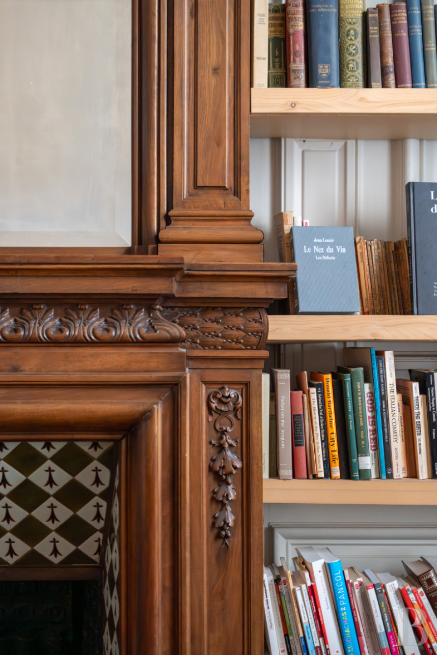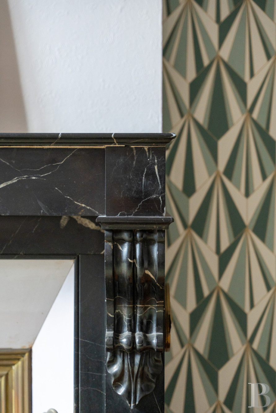 Beneath the entrance porch, a double-leaf, glazed, wooden door opens into an entrance hall with terrazzo flooring, from where a wooden staircase climbs to the upper floors. Opposite, behind a door, another staircase descends to the cellars. On either side, the entrance hall leads to a lounge and a dining room, which in turn leads to the kitchen. In these rooms, there is herringbone wood flooring throughout with sculpted wooden fireplaces against the walls. In the lounge, wood panelling adorns the walls and the ceiling is decorated with mouldings as well as a painted central décor. In the dining room, the wainscotting echoes the coffered ceiling.
