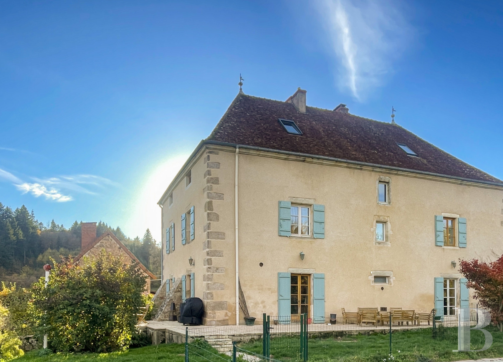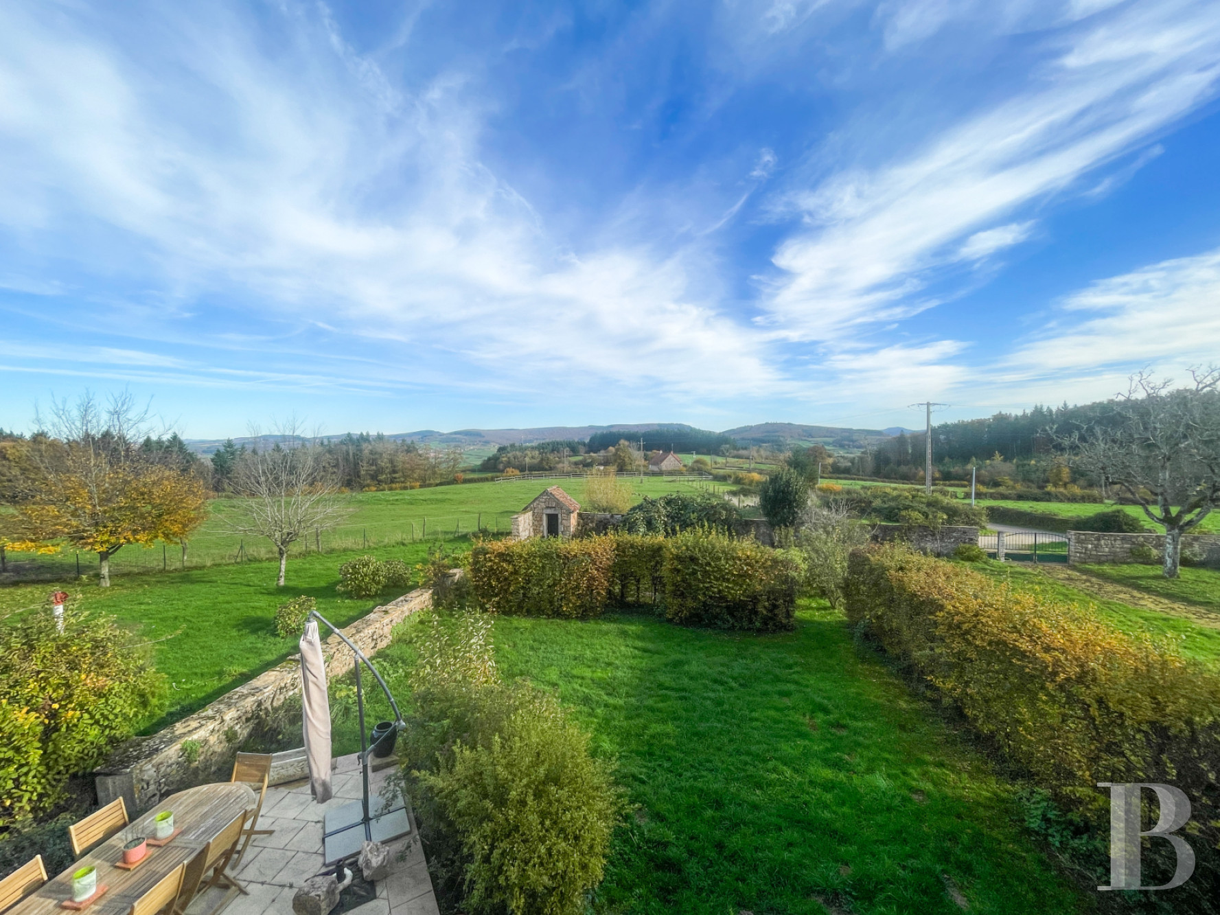 In the south of Burgundy-Franche-Comté and Saône-et-Loire, on the Paris-Lyon-Marseille axis, the property is very well served by the Route Centre Europe Atlantique (RCEA), the A6 motorway and the TGV train stations at Le Creusot and Mâcon-Lôché. Paris can be reached in 2 hours by TGV, Geneva in 2 hours 15 minutes and Lyon in 1 hour 15 minutes. The towns of Charolles and Cluny, with all their shops and services, are a 20-minute drive away. The neighbouring village has a supermarket and essential shops. The neighbouring Butte de Suin, rising to a height of almost 600 m, is a perfect vantage point from which to admire the perfectly preserved surrounding countryside between the Charolais and Clunisois regions, where the hills oscillate between hedged farmland, forests and Romanesque churches, echoing the famous abbey of Cluny.