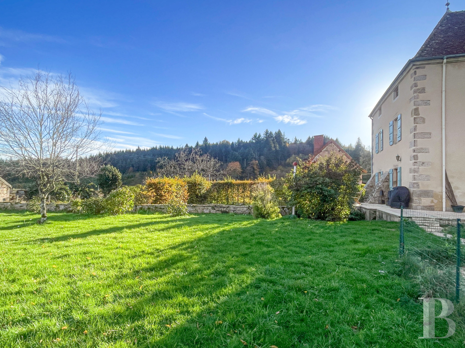 Spanning almost 3 hectares, they include a gravel courtyard for the buildings to the south west, parkland enclosed by low stone walls, vast grasslands with a horse riding arena, a vegetable garden to the east and an orchard to the north. The parkland features a chlorine pool with a recently replaced liner and flagstone beaches. The whole complex can be accessed independently via three entrances. Both from the house and from the grounds, there is a peaceful, distant view to the south-east over the surrounding forests and meadows.