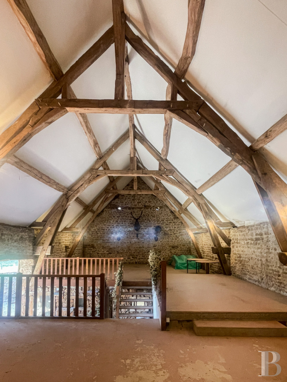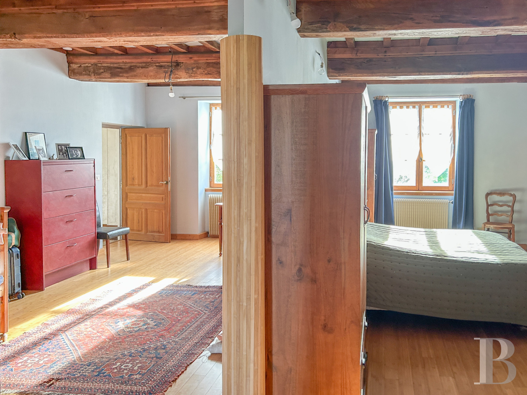 A first attic space of a spectacular volume is used as a multi-purpose living area, enhanced by a long-spanning exposed roof structure. The high ridge and roof lines create a special atmosphere, while the gable windows provide natural light from the side. Designed as a living room/library, the floor is currently used for a variety of purposes: games room, home cinema, creative workshop or family room, depending on needs. An atypical bedroom, of more modest dimensions adjoins this vast room, nestled in the tower. On the other side, the landing leads to the attic space with its high ridge and exposed beams, which can easily be converted, with recently created windows and installed technical networks.