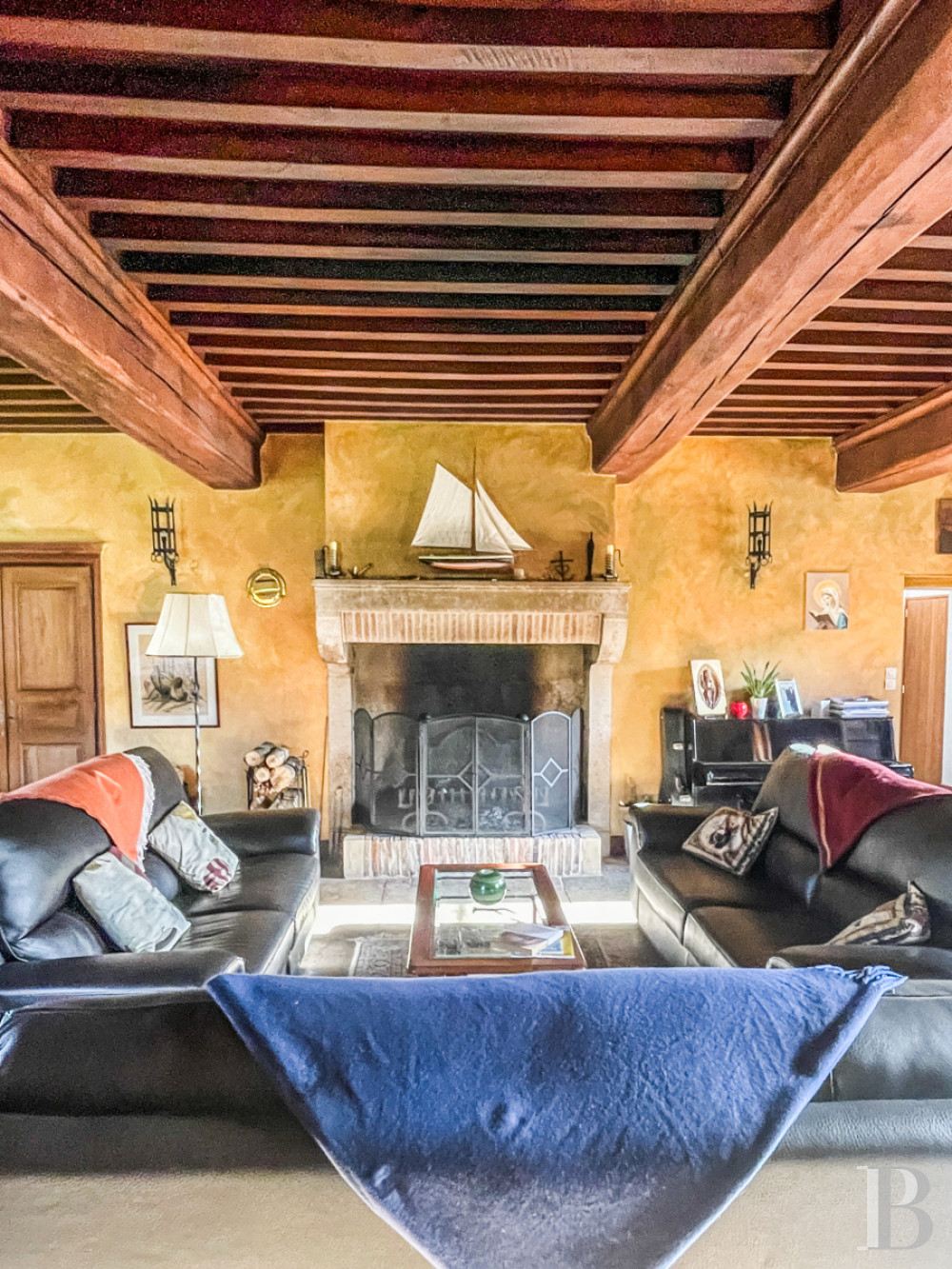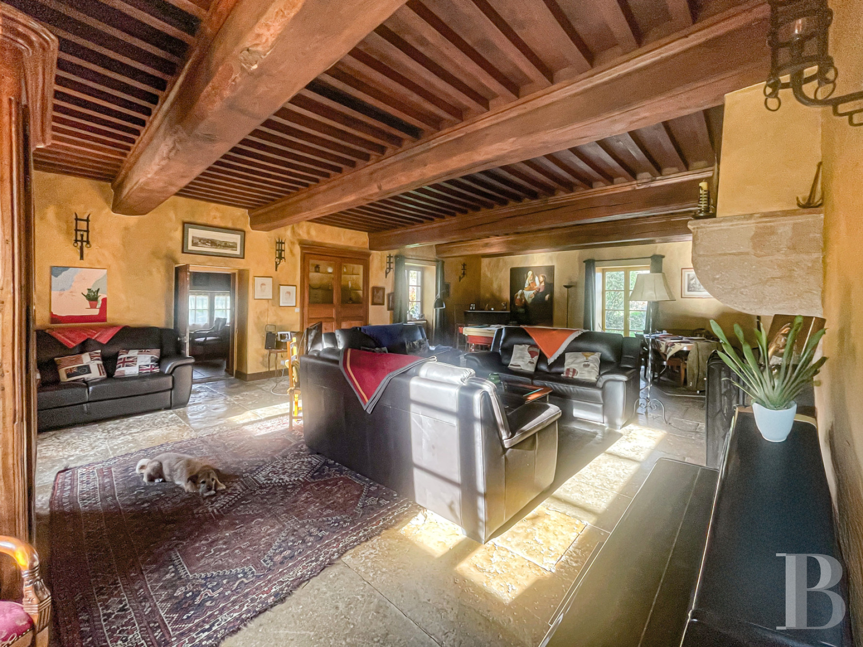 In the centre of the house, accessed through a solid wood entrance door and a stone porch, a vast vestibule houses a blue-grey, fossilised Buxy halfpace stone staircase with a wrought iron banister. The floor is covered with large stone tiles. It leads to a vast living area on each side: a kitchen and a lounge, measuring over 60 and 65 m². The fitted kitchen, which doubles as a dining room, faces east, south and west. It features recent stone flooring and a wood-burning stove. The living room is imposing, with old stone floor tiles and a French-style ceiling. Its walls are pierced with oak-door cupboards arranged around an open stone fireplace. There is an intimate office with independent access to the tower off the lounge. Finally, the floor is completed by a boiler room with an Ökofen pellet boiler and a toilet.