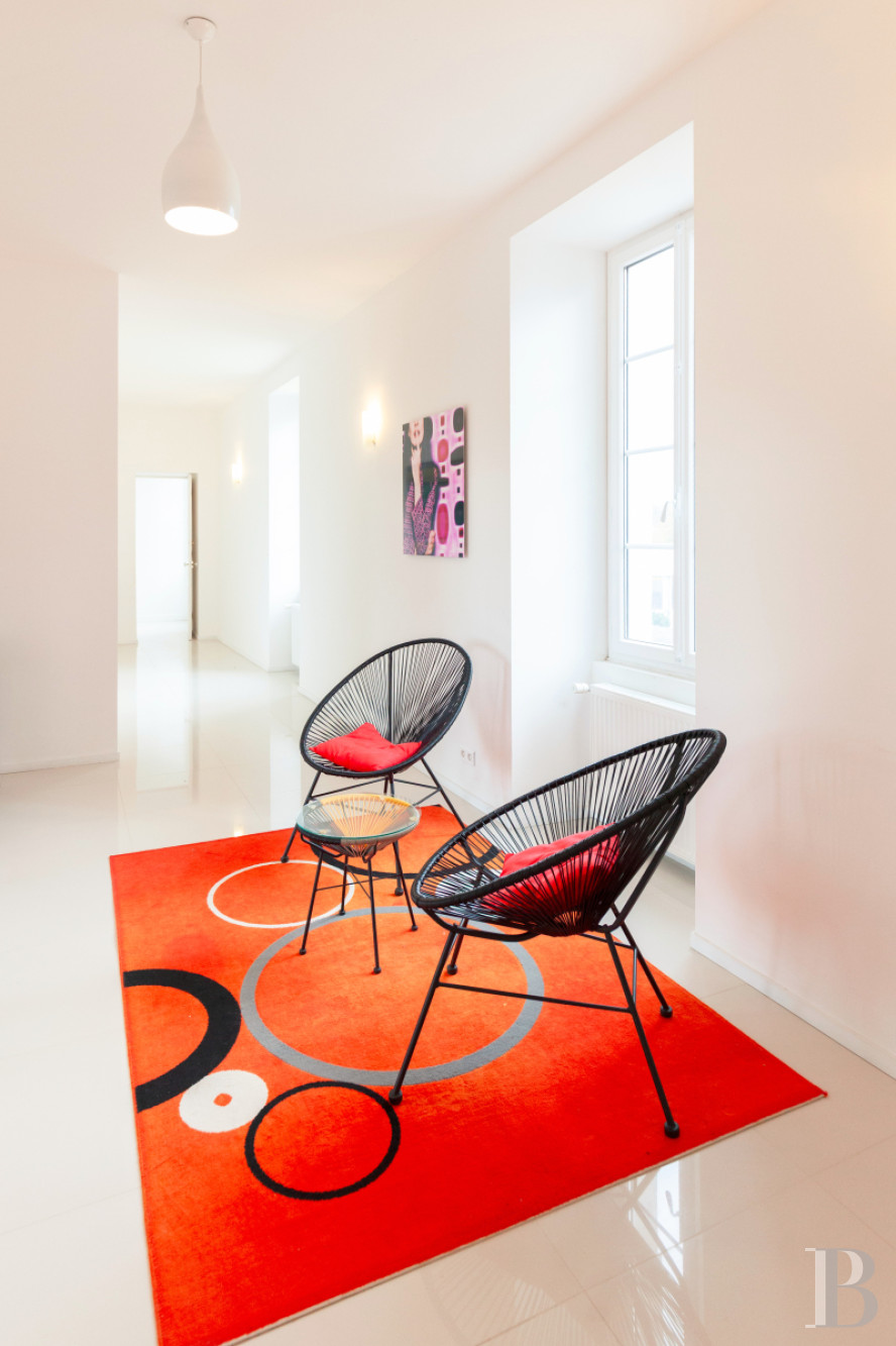 The painted stone staircase leads up to a landing that connects to a first bedroom, a door that takes you to the loft, and a separate bathroom with a lavatory. Beyond it, a large hallway connects to a section converted into a suite with three bedrooms, a spacious lounge, three lavatories and two shower rooms. The lounge is at the heart of this floor and connects to two of the suite’s bedrooms. The central window, in a niche, offers a scenic vista of the lush landscape that stretches into the distance. The last bedroom in the suite and on this floor is spacious and has a shower room. It is separate from the rest and is bathed in natural light.