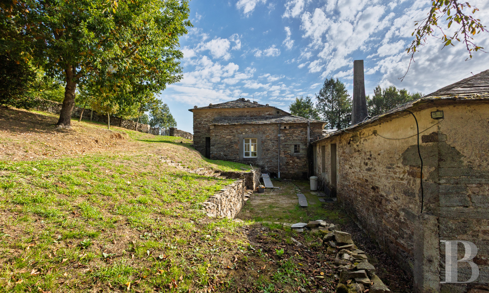 In the mountains of Lugo, a vast residence forms part of a rural architectural complex where several structures are arranged around a large inner courtyard. Houses, stables and a chapel form a complex that time has preserved, awaiting restoration. Stone arcades form a gallery surrounding the courtyard. The residential part has two living rooms, five bedrooms and a kitchen where a traditional wood-burning stove stands next to a stone sink. A caretaker's house and gently sloping grounds of over 17,500 m² planted with fruit trees complete the property. A spring runs through the grounds. This heritage site is crossed by the Primitive Way of Saint James, 60 km from Lugo and its Roman ramparts, which are listed as a World Heritage Site.