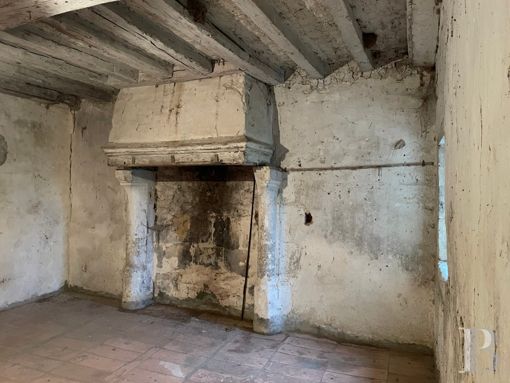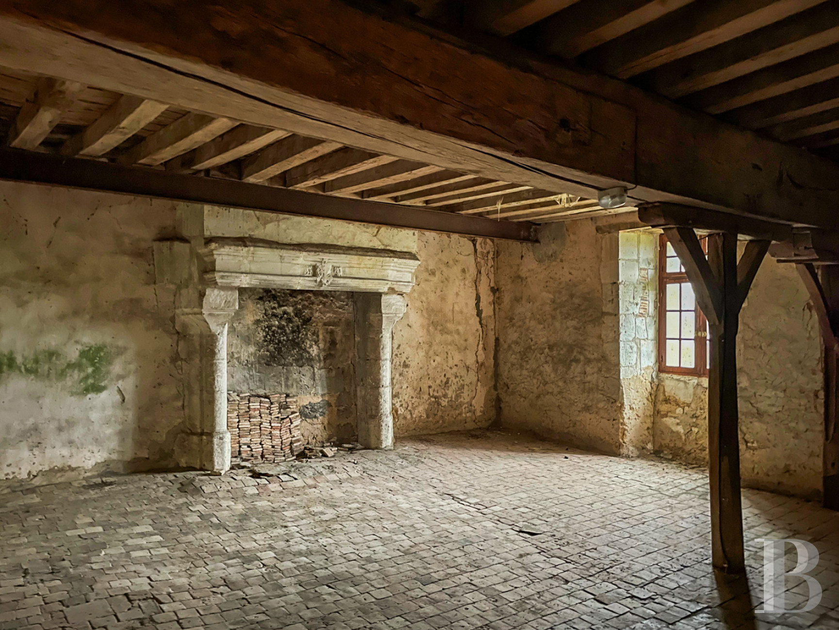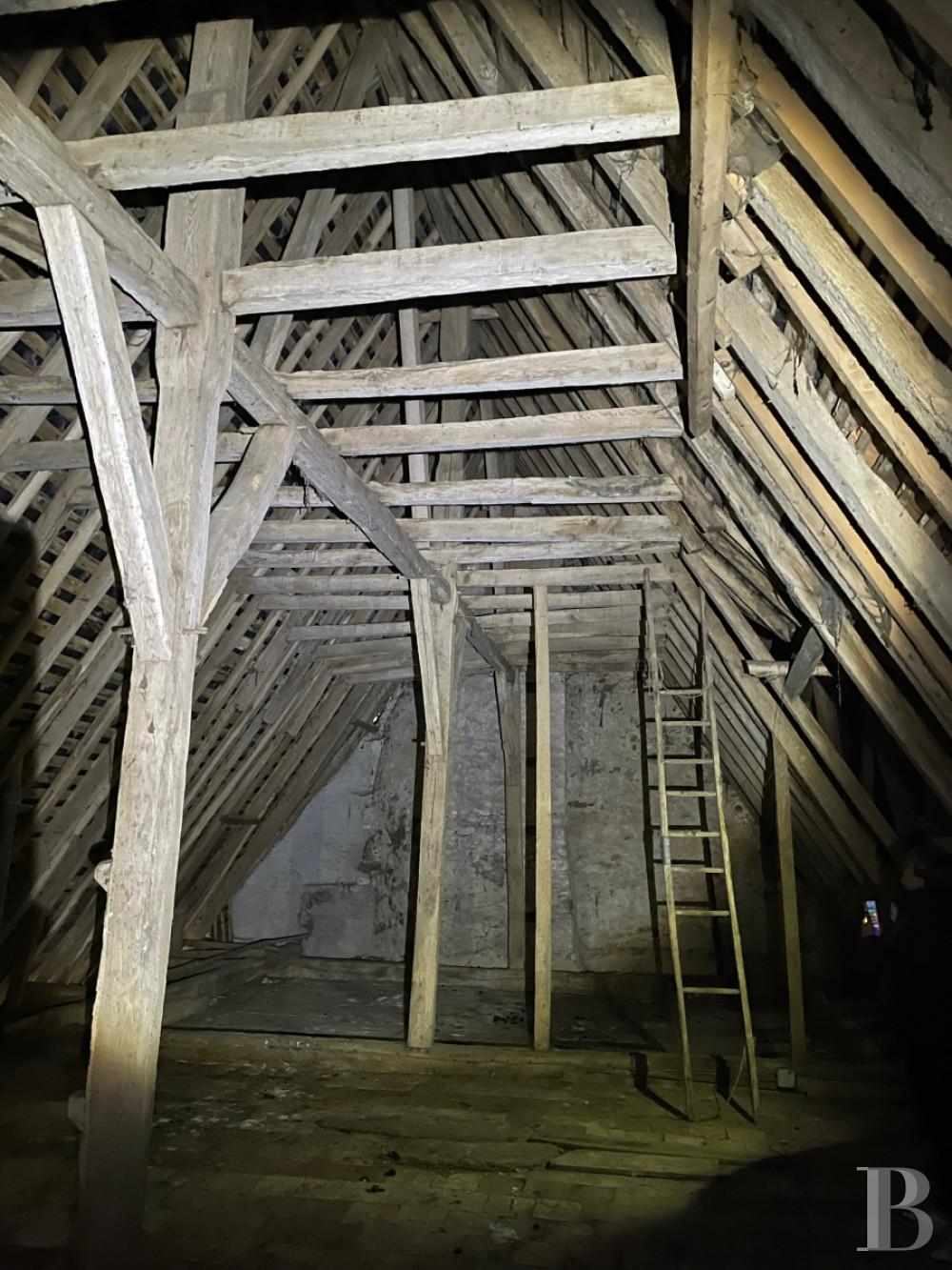 It can be reached by the staircase and is made up of an approximately 115-m² surface, still in an L-shape, awaiting conversion. Beneath the period roof frame, there are original terracotta floor tiles.