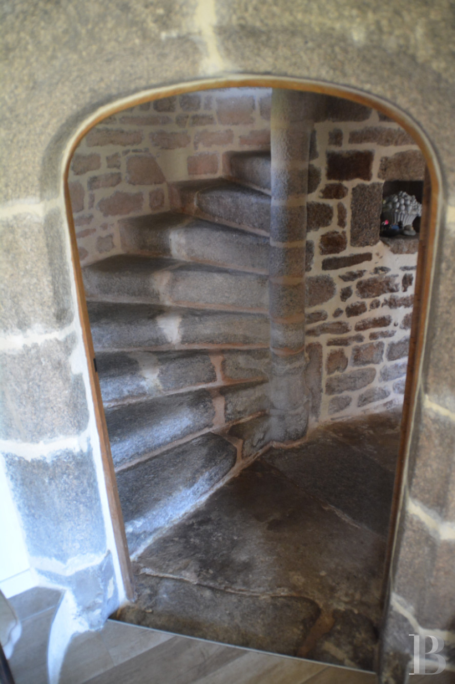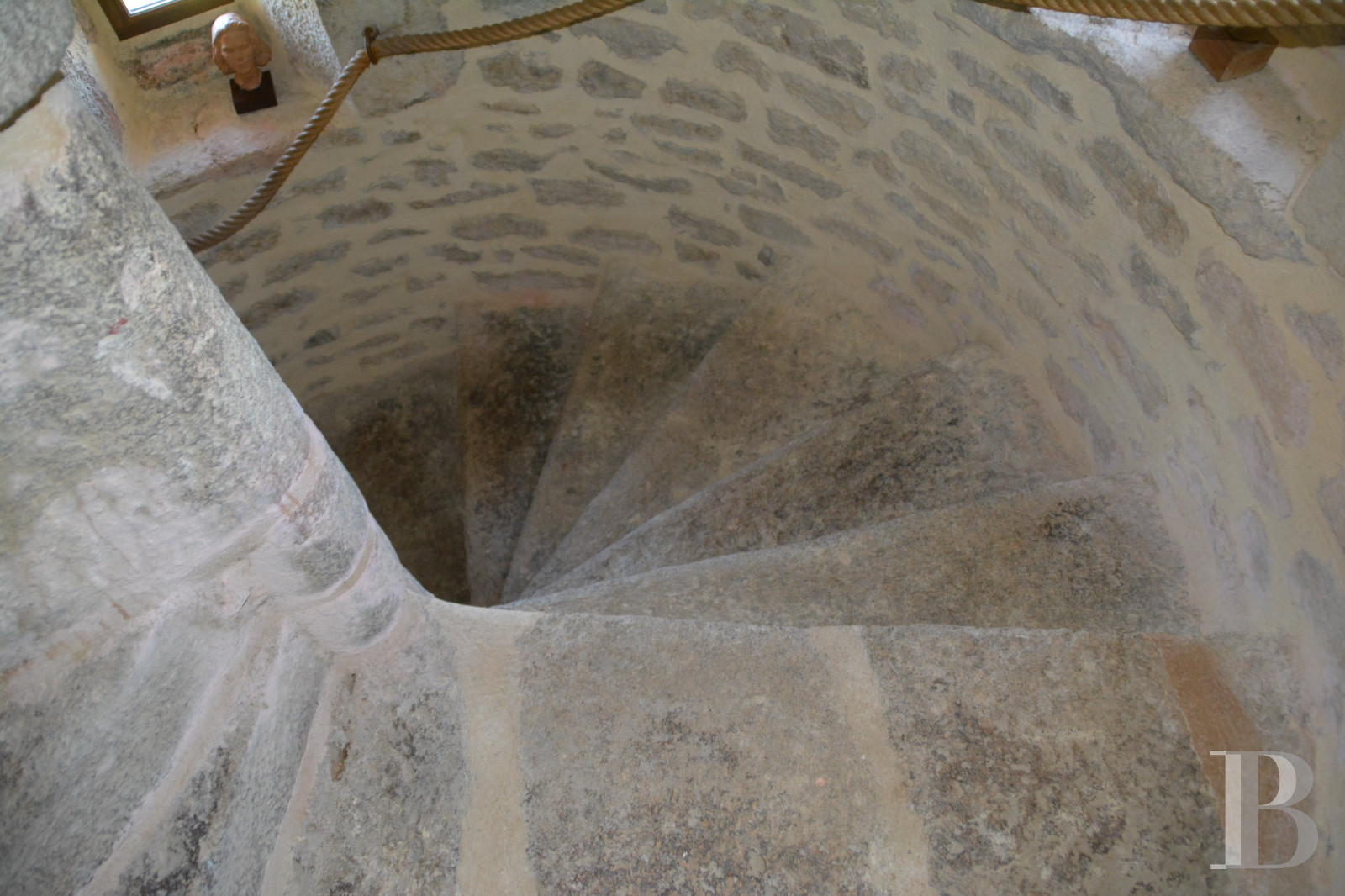 The round tower connects the manor house to its upper floors. The whole building is made of granite, with a ceiling of radiating tiles. On the top floor, a door leads to the dovecote that crowns the summit. The pigeon holes have been preserved. To keep birds out, the space has been closed off, without altering its original appearance.