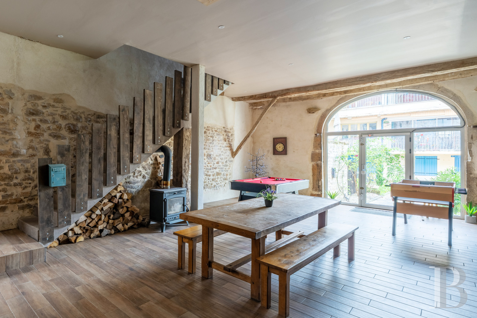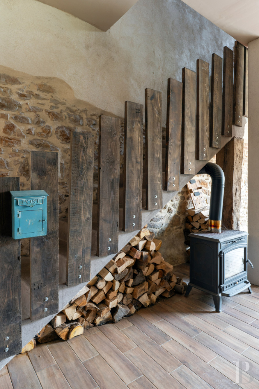In addition, a wood-burning stove located under the stairs provides a cosy touch for this immense space, in the back of which three steps provide access to the living room area, of approximately 20 m², featuring, on the left, a fireplace with a wood-pellet stove and, on the right, a lavatory.