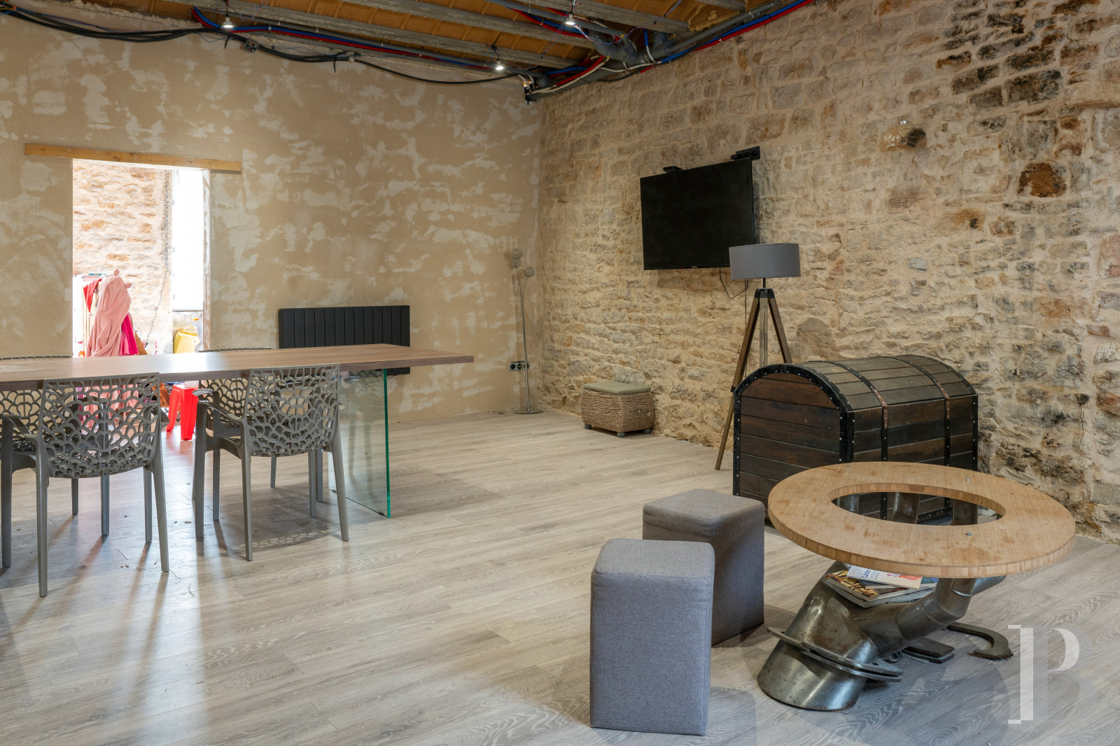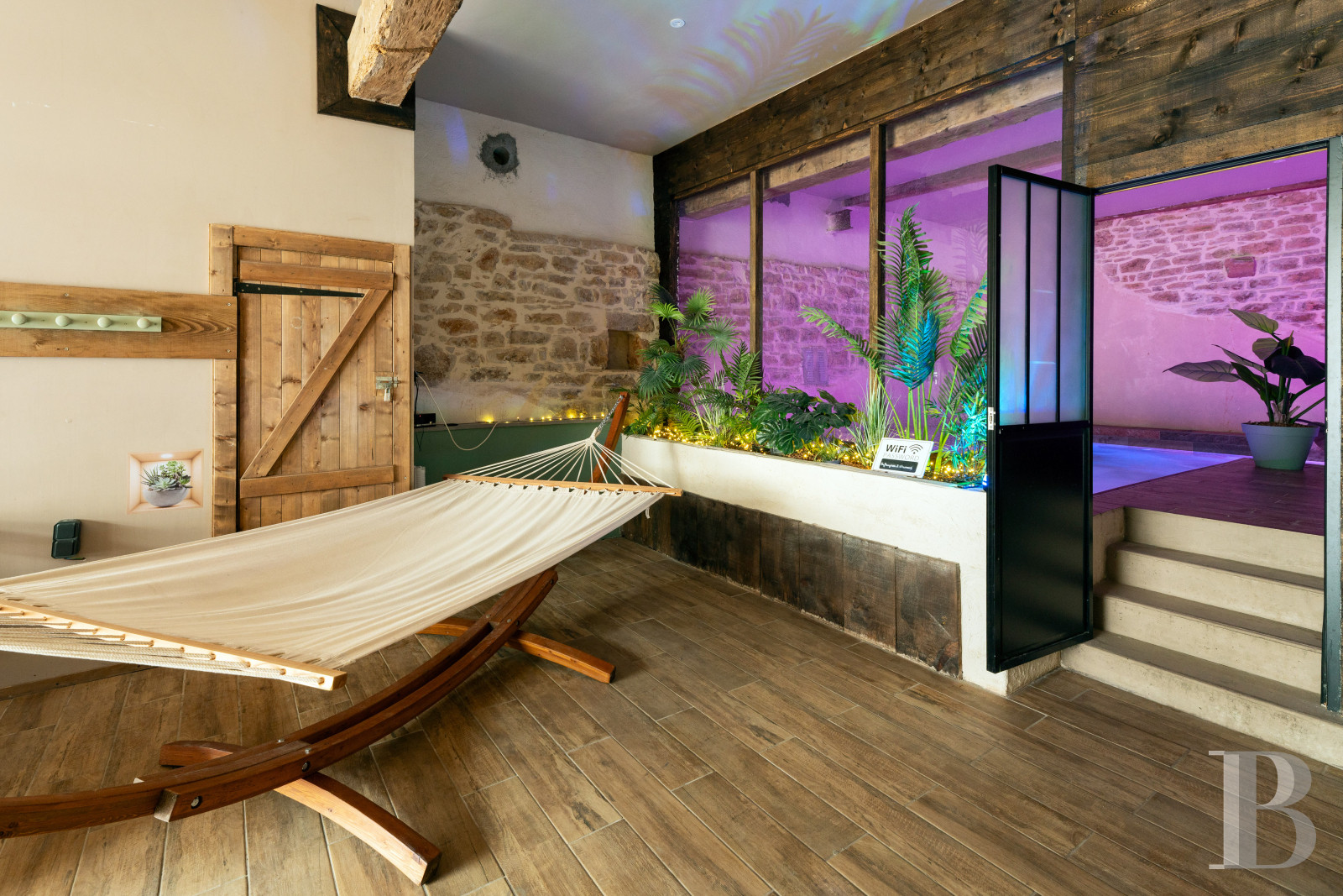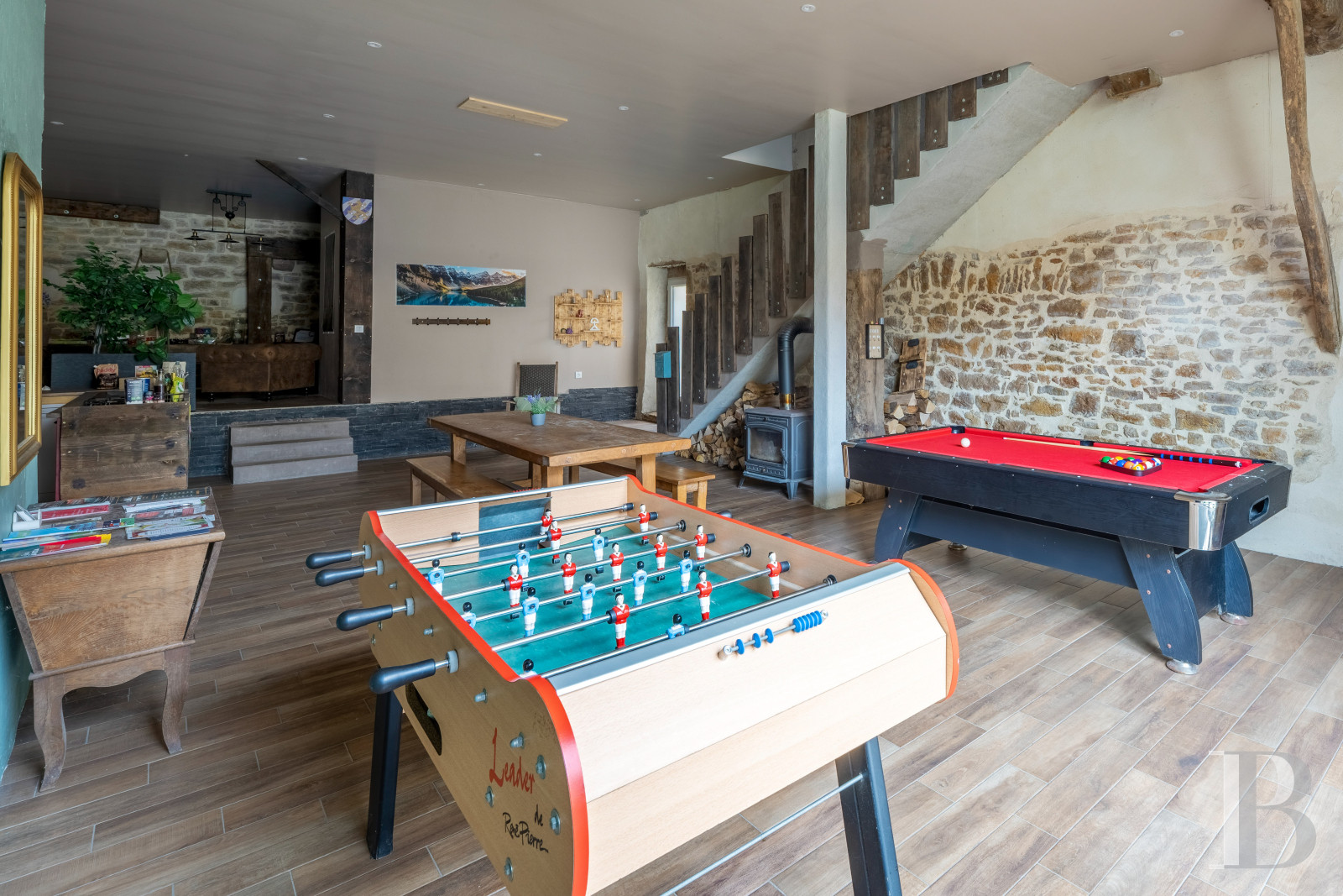 The ground floor of the two-storey former barn is reserved for leisure activities and dining services with a kitchen, dining room, living room, as well as an area, on the right, furnished with table football and a snooker table, while the left side has been turned into a wellness area with a swimming pool located towards the back of the room. With faux-wood floor tiles for both the ground floor and upper level, the latter contains the guest bedrooms and their associated showers.