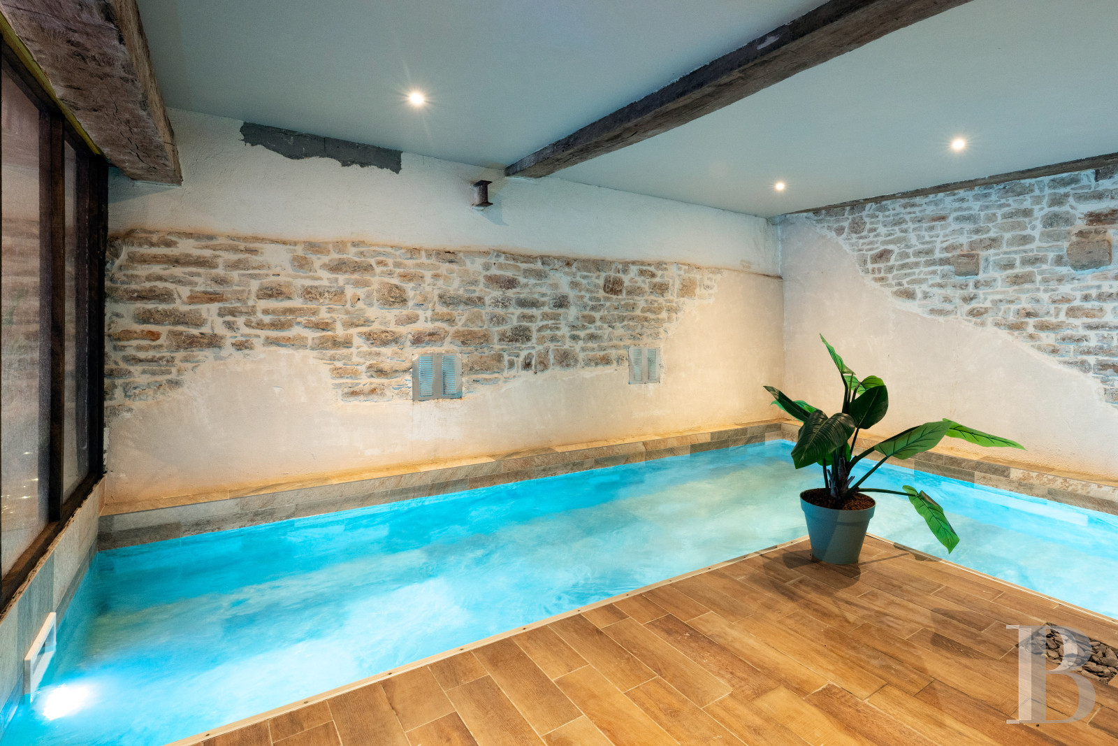 Immediately after the entrance, a small room (which contains the swimming pool’s machinery) opens on to an area dedicated to relaxation, of approximately 50 m², with an indoor swimming pool in the back, separated from the rest of this space with a glass partition, while four steps provide access to this L-shaped, 6 x 6-metre pool, which comes with a jacuzzi.