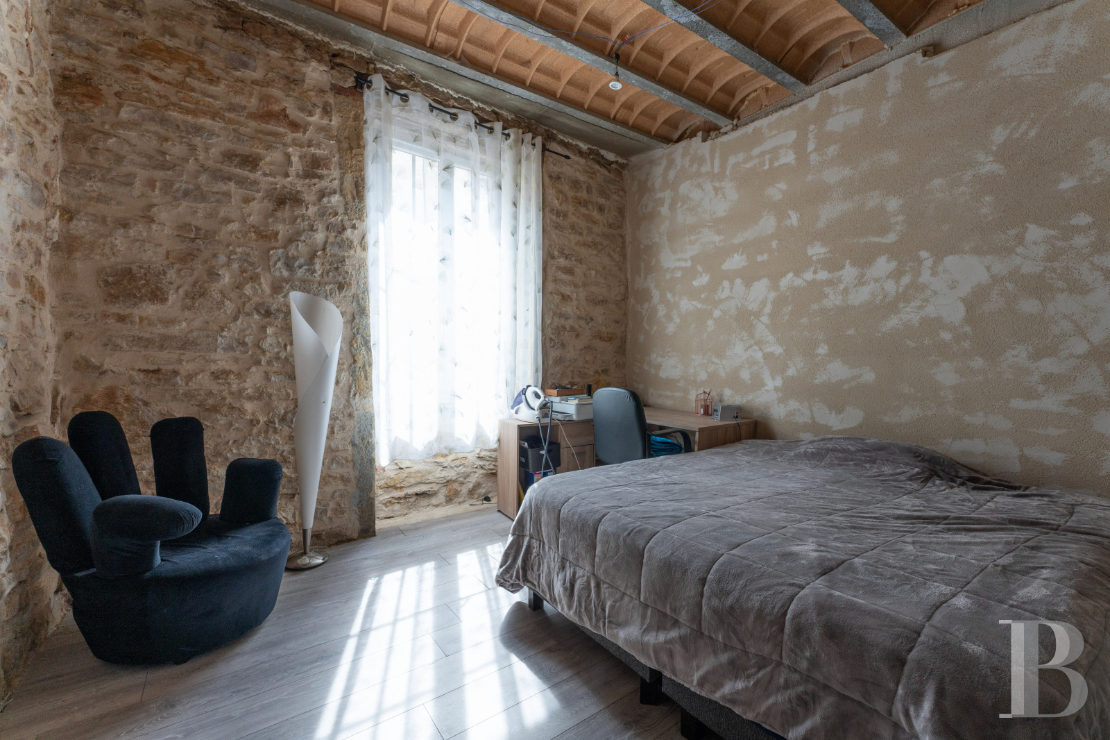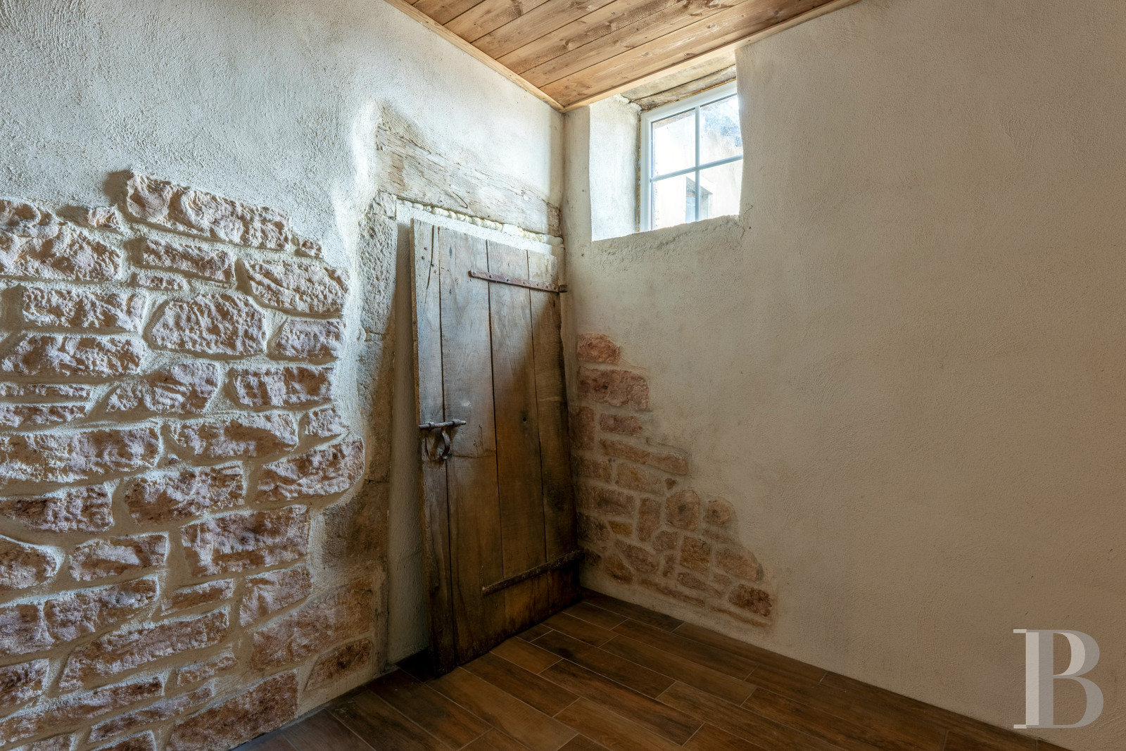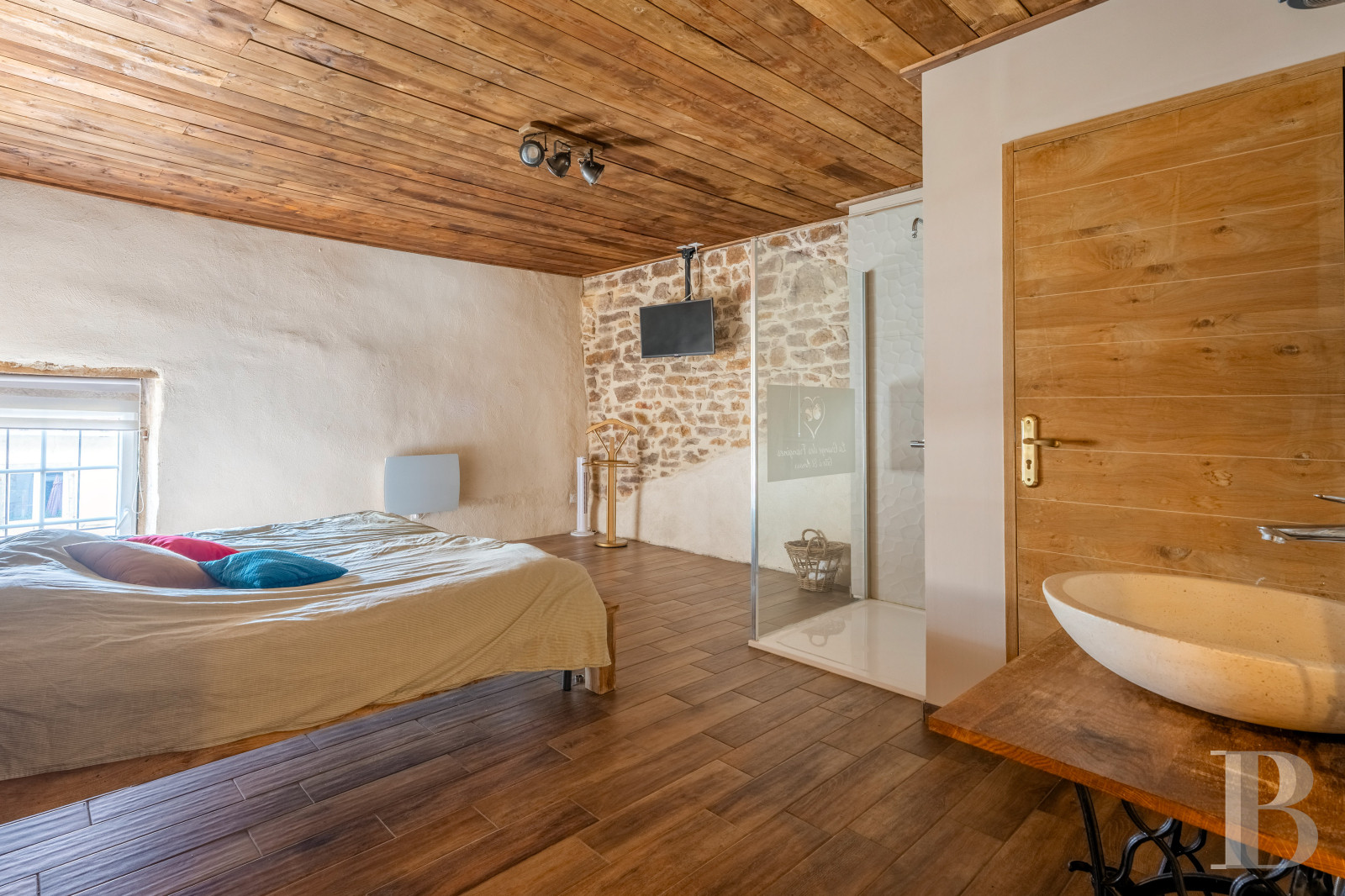 The staircase then leads to the last level with an attic extending over approximately 40 m², located above the bedrooms in the first-floor flat, while a hallway provides access to this building’s second flat, which includes a living room with a kitchenette, of nearly 30 m², a shower room with lavatory, of approximately 7 m², and a bedroom with about 11 m². Completely redone, it features several pointed stone walls, visible ceiling beams, pale wood-panelled ceilings as well as a wide-plank sprung floor, all of which contribute to the premises’ overall understated and, yet, modern style.
