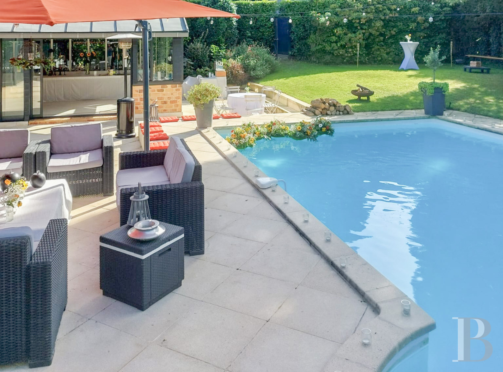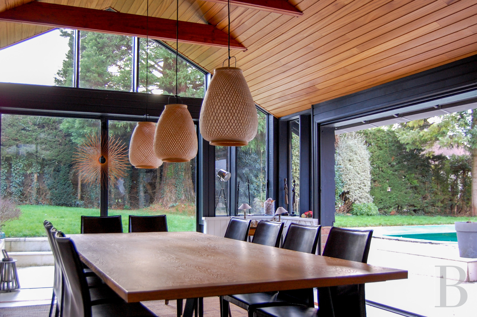 The garden is dotted with trees and shrubs in abundance. This lush outdoor space covers around 800m² and cosily envelops the house in greenery. It includes clusters of flowering plants that edge the wood-strip entrance path. The garden’s shrubs and trees are cleverly positioned. The swimming pool is 10 metres long and 5 metres wide. Set in the lawn, this pool fits harmoniously into the soothing natural decor, offering both refreshing coolness in the summer and a fluid transition out into the garden. The whole space forms a haven of greenery where natural light, lush vegetation and delightful cosiness combine together elegantly.