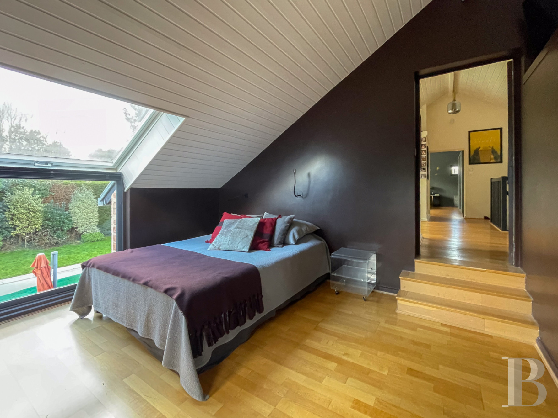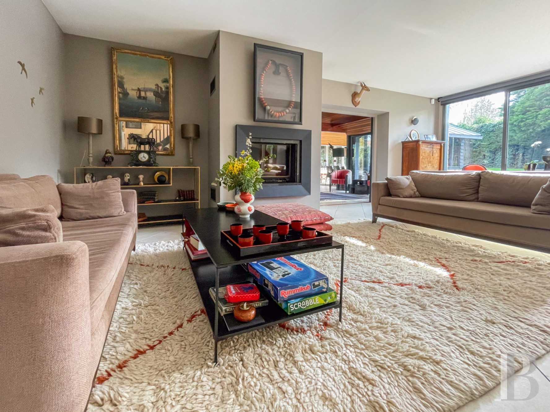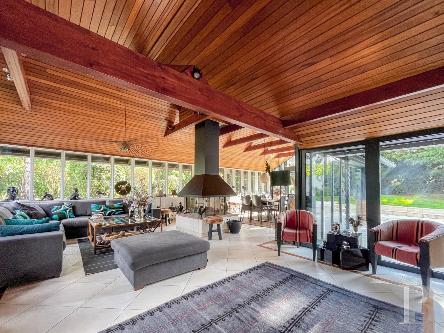 You step into a spacious entrance hall that leads to a 100m² reception space. This extensive reception space is made up of a small lounge with a fireplace and, in the glazed wing, a large lounge with a cathedral ceiling, a central fireplace and a dining area. The whole space looks out at the garden and leads out onto a vast terrace of pale beige slabs at the same level as it. This terrace becomes a natural extension of the lounge in the summer. The open-plan kitchen is convivial in design and extends the reception space. This kitchen likewise leads out onto the terrace. The ground floor also has a lavatory, a bedroom with a bathroom, and a self-contained studio apartment with its own private entrance from outside. This studio apartment has a lounge, a bathroom, a lavatory and a mezzanine bedroom. It is the ideal solution for hosting friends and family or for including a self-contained dwelling within your home.