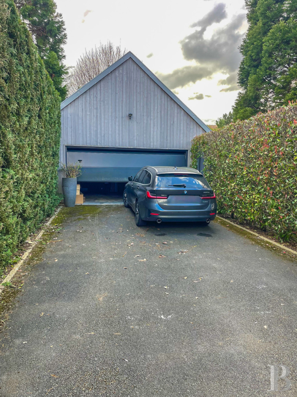 The outbuilding that houses the garage lies beyond the garden. It leads straight out onto the private road. Inside, there is room for storing two vehicles. And a large parking area lies in front of it too.