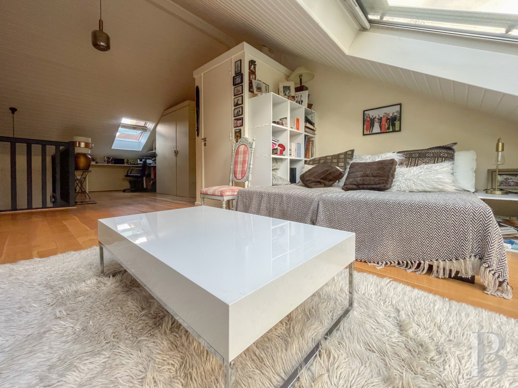 The first floor has sloping attic ceilings and many roof windows that fill the rooms with soft natural light. On the mezzanine that looks down at the entrance hall, a landing creates a space for smooth flow and connects to the rooms. Up here, there is a lavatory, a room with a water inlet that could easily be turned into a shower room, and a television lounge that could be turned into a spare bedroom. A bedroom with a shower room is followed by another, more spacious bedroom with many in-built cupboards and a bathroom with a shower. The wood strip flooring on this upper level creates a warm, harmonious ambience. The first floor is at once cosy and bright. Indeed, it is designed like a restful haven that gazes up at the clear sky.
