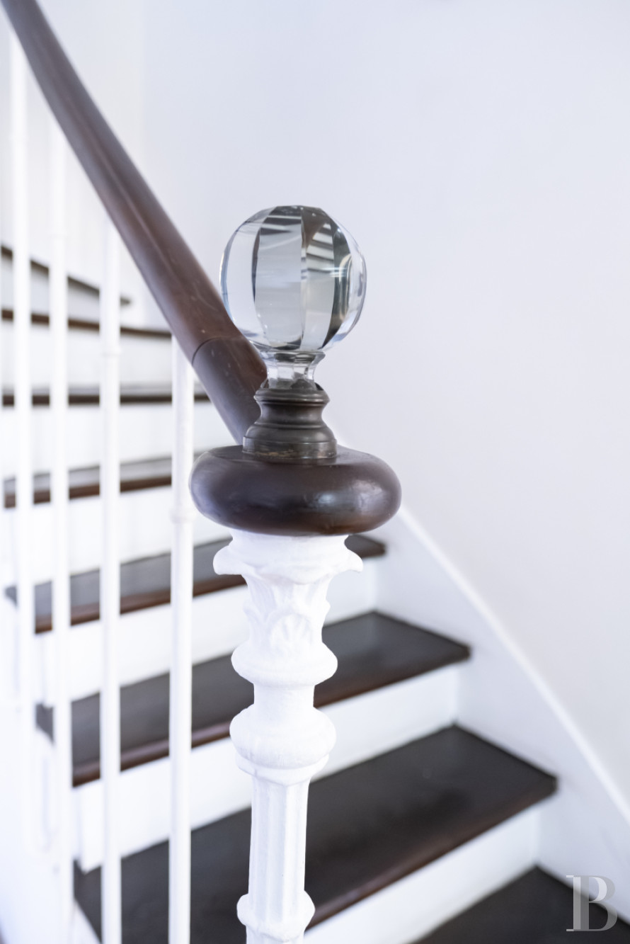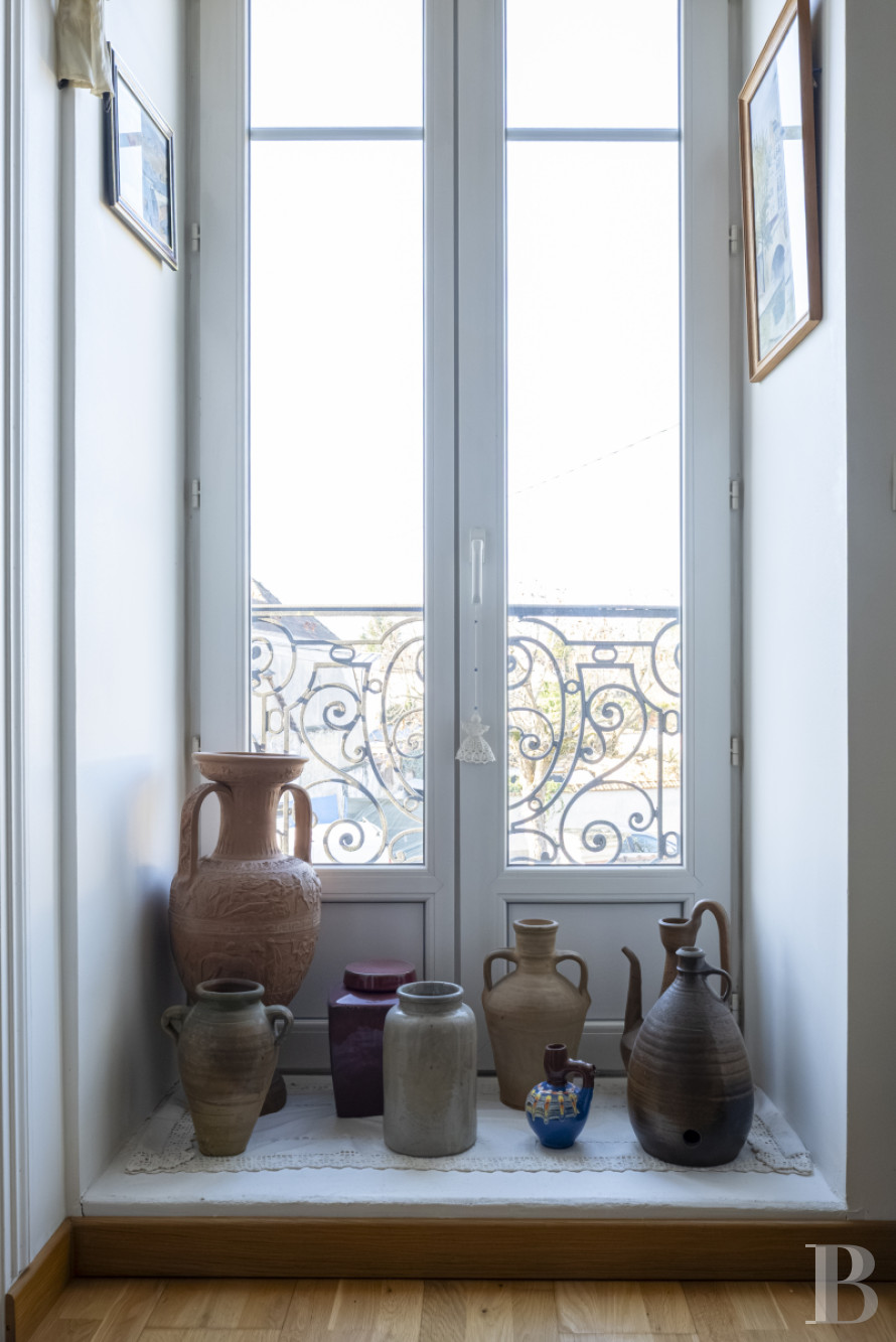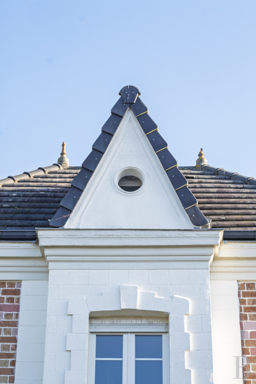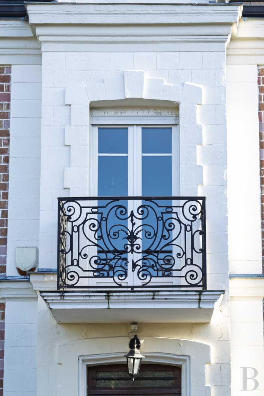 Back on the property’s courtyard side, the dwelling features a symmetrical composition with smooth white stone used in its quoins, window surrounds, as well as to decorate its façade’s central bay, which nicely highlights its ochre and pink bricks. With windows symmetrically placed on each floor and a central balcony, the house is topped with a gable dormer window, characteristic of 19th-century bourgeois dwellings.