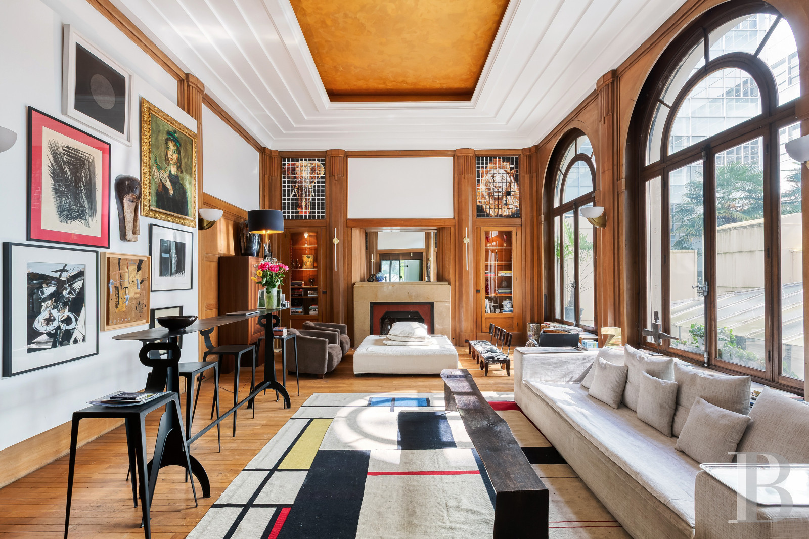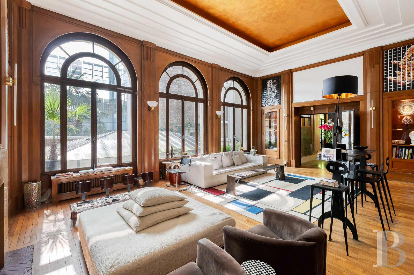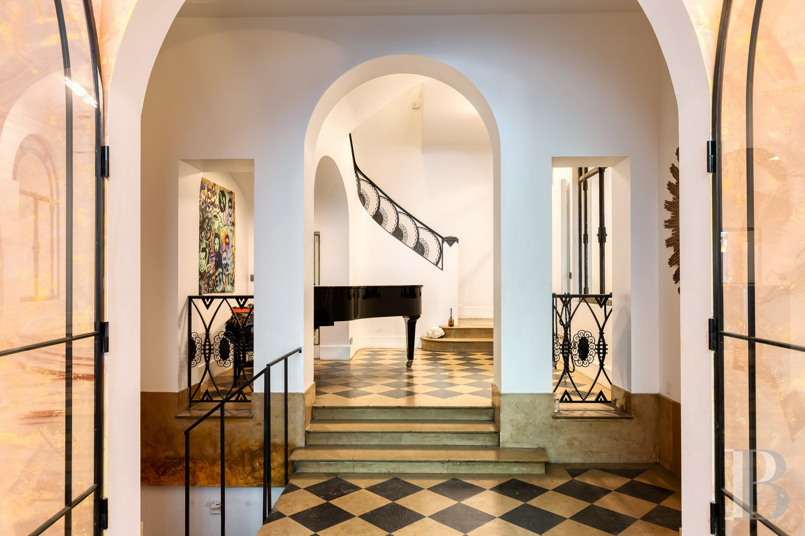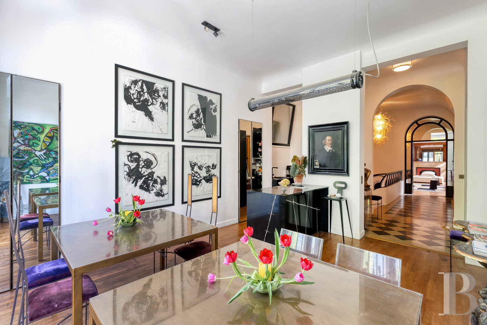 The upper level is accessed from the entrance via a majestic marble staircase with a masonry balustrade topped by Art-Deco style wrought ironwork supporting the handrail. On the main floor, on the left, the lounge is illuminated by three large arched windows overlooking the garden. The walls are clad with solid oak panelling, vertically punctuated by leaning columns with sculpted capitals. The floors are of solid parquet. At 4.60 metres from the floor, the ceiling features a stepped perimeter cornice and indirect lighting. Opposite the entrance, the stone fireplace accentuates the axis of the room and display cabinets are positioned on either side. On the other side of the room, the kitchen is partly open to the dining room and its large window overlooking the street. A corridor serves the master bedroom with an en suite bathroom and two other bedrooms, each with its own tiled shower room. A toilet is also accessed from the corridor. This level can also be reached from the communal areas of the building, through another door. An independent studio flat on three levels is accessed from the entrance: On the ground floor, the kitchen opens onto a living room and a wooden staircase leads up to a mezzanine with a sleeping area. A second concrete staircase leads to the lower level. An intermediate landing serves the lavatory. A few steps further down is a bedroom with a window and a bathroom at the back. The property includes part of a commercial property.