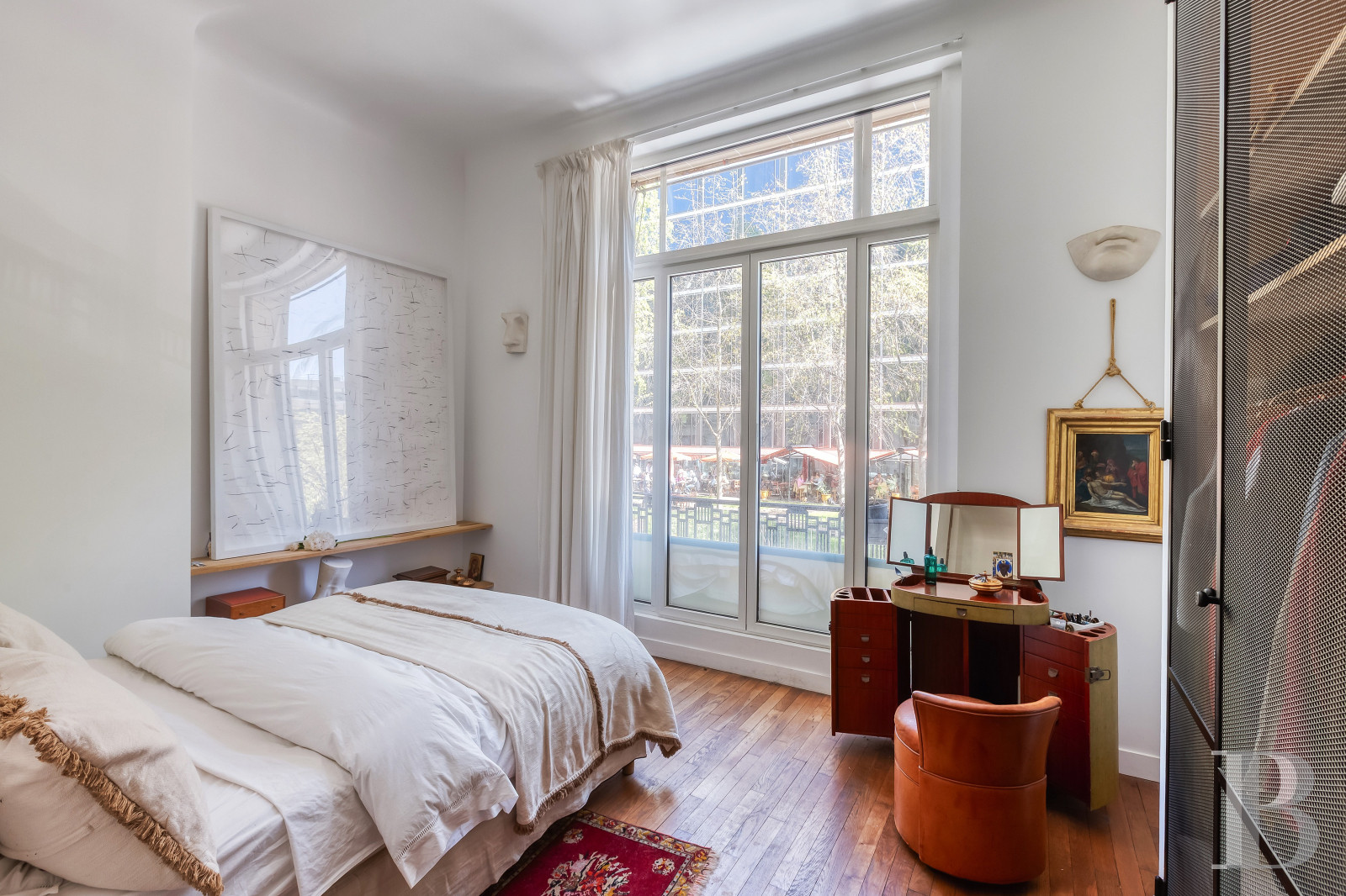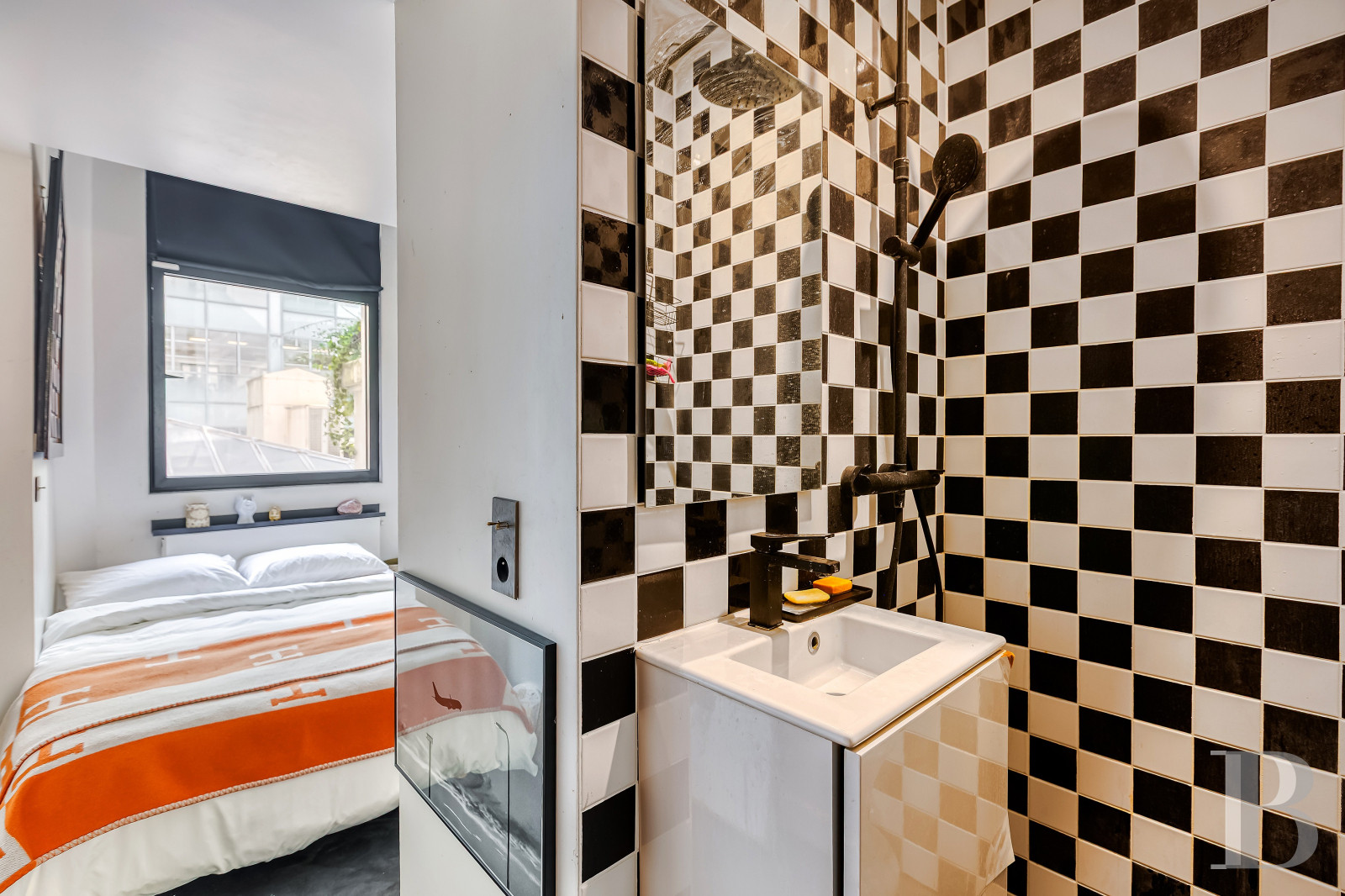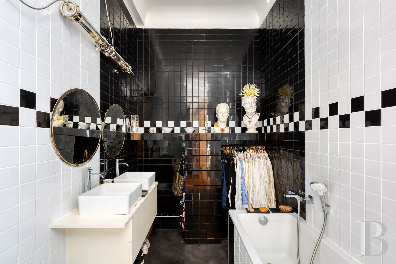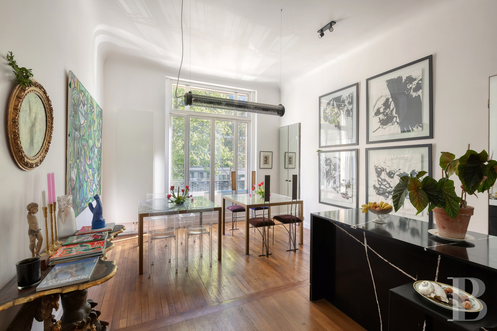 The upper level is accessed from the entrance via a majestic marble staircase with a masonry balustrade topped by Art-Deco style wrought ironwork supporting the handrail. On the main floor, on the left, the lounge is illuminated by three large arched windows overlooking the garden. The walls are clad with solid oak panelling, vertically punctuated by leaning columns with sculpted capitals. The floors are of solid parquet. At 4.60 metres from the floor, the ceiling features a stepped perimeter cornice and indirect lighting. Opposite the entrance, the stone fireplace accentuates the axis of the room and display cabinets are positioned on either side. On the other side of the room, the kitchen is partly open to the dining room and its large window overlooking the street. A corridor serves the master bedroom with an en suite bathroom and two other bedrooms, each with its own tiled shower room. A toilet is also accessed from the corridor. This level can also be reached from the communal areas of the building, through another door. An independent studio flat on three levels is accessed from the entrance: On the ground floor, the kitchen opens onto a living room and a wooden staircase leads up to a mezzanine with a sleeping area. A second concrete staircase leads to the lower level. An intermediate landing serves the lavatory. A few steps further down is a bedroom with a window and a bathroom at the back. The property includes part of a commercial property.