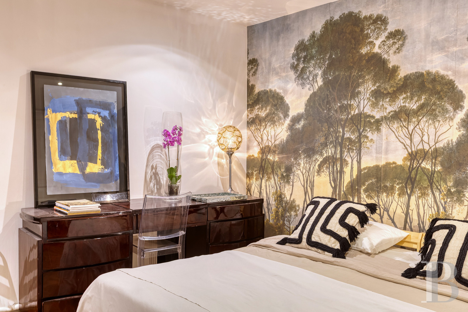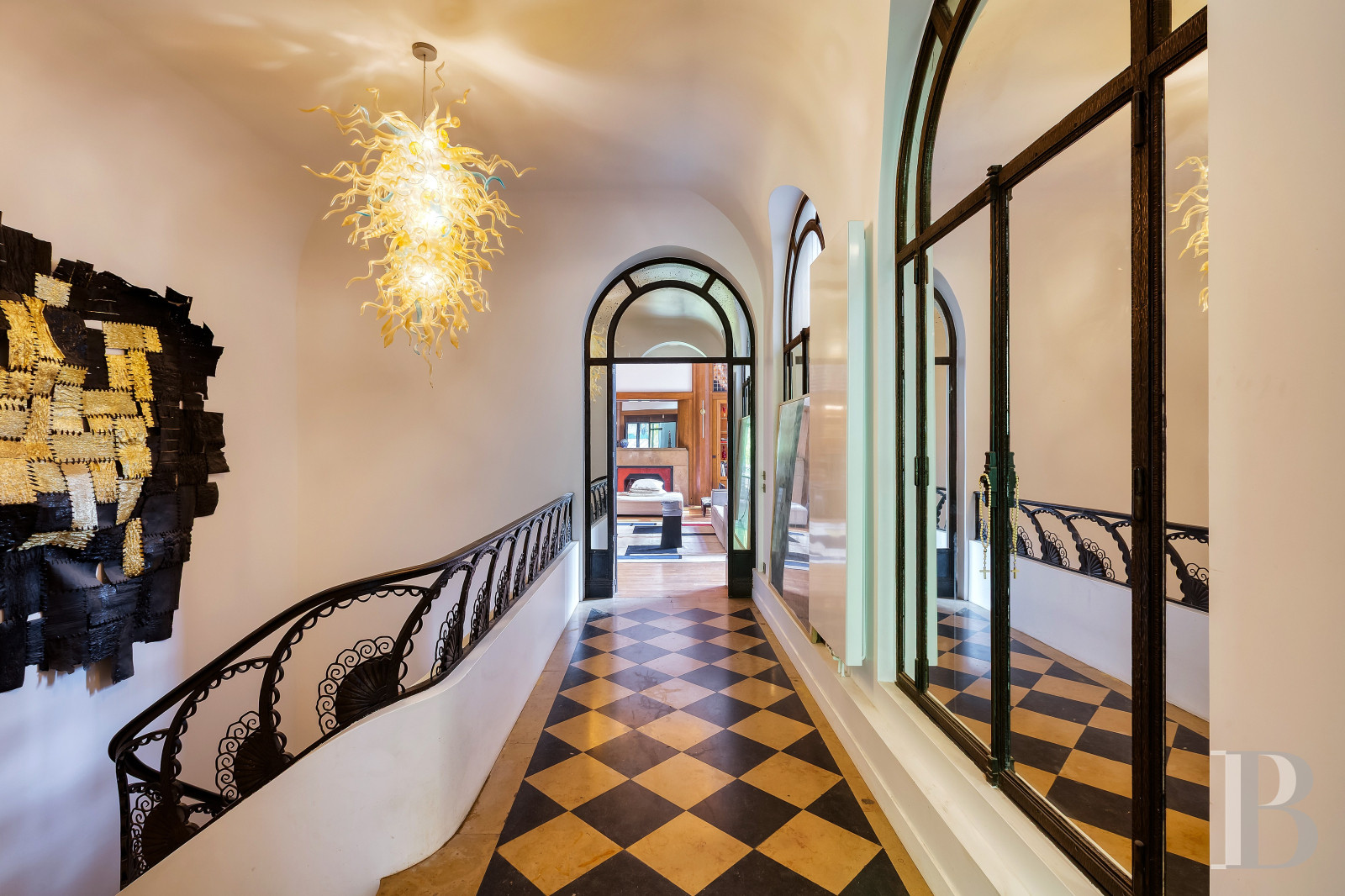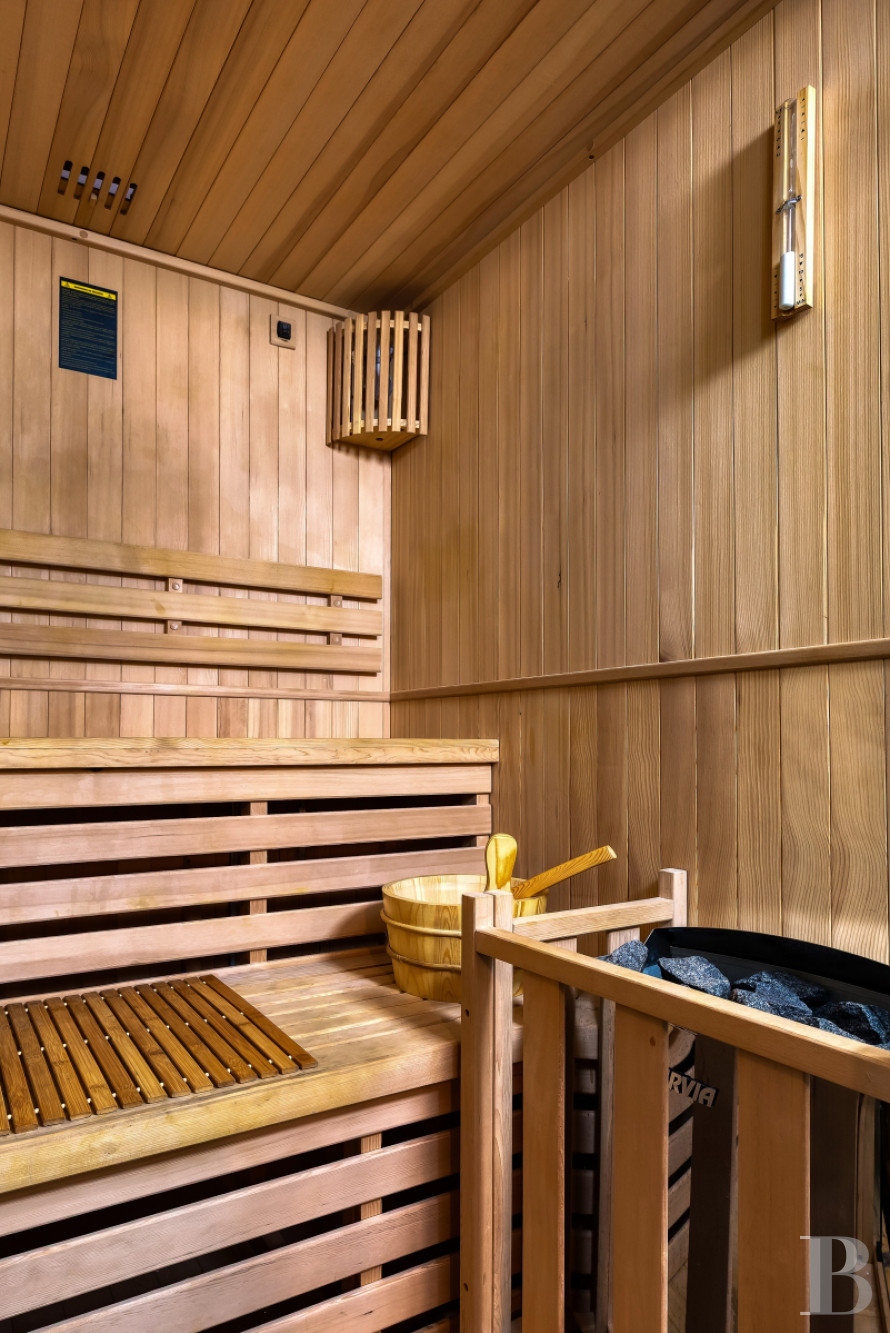 The entrance hall with its succession of arched windows, one of which is equipped with a double-glazed door, also provides access to the other two levels of the property. The lower level comprises a gym with a shower room and sauna on one side; on the other, a lounge, a boiler room and a cellar.