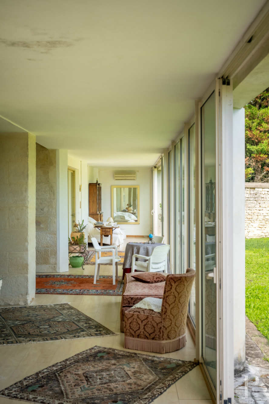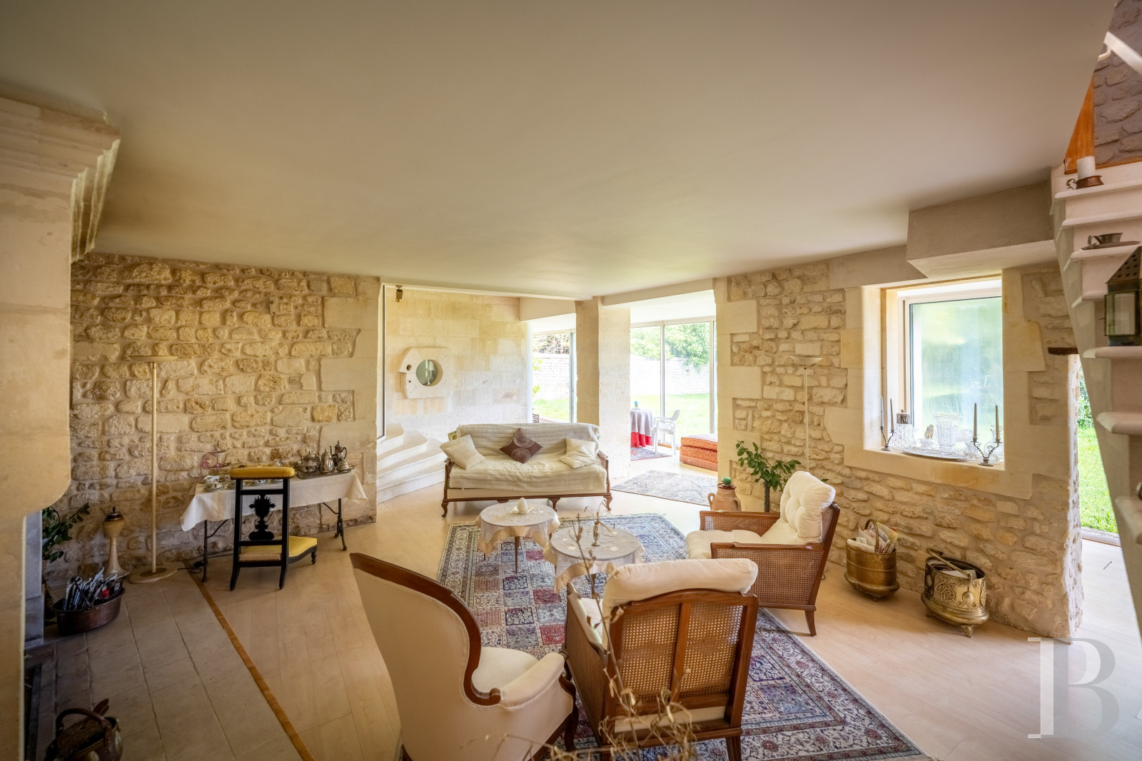 Via a pedestrian street, which leads to the city’s square, the house's entrance is located in a small vestibule, which, via three curvilinear steps, leads directly to a living room decorated with an ashlar stone fireplace. This room has a quarter turn wall staircase with sand-coloured stone steps, which harmoniously matches the overall space. Stone pillars separate this room from the glassed-in gallery overlooking the garden. Next to it, the dining room, which overflows into one end of the glassed-in gallery, has a round stone table, incredibly pleasant to the touch. Near the living room, the gallery is decorated with a “warming oven” in light-coloured stone. Starting with the room on the end, which is used as an office and has a staircase similar to the first, the glass gallery successively runs past the living and dining rooms as well as, at a right angle, the open kitchen. From the latter, a hallway with a shower and lavatory provide access to the small courtyard, which links up with the garage and studio.