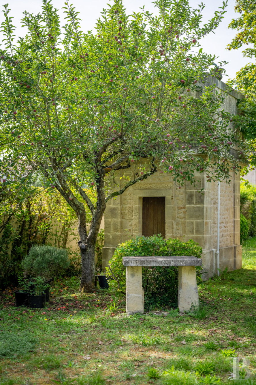 Facing the house, the lawn is adorned with a small building, a stone well and a water cistern supported by stone walls, while a maple tree and pruned conifers are a subtle nod to Japan. In the back, an old apple tree stands in front of two large yew trees.